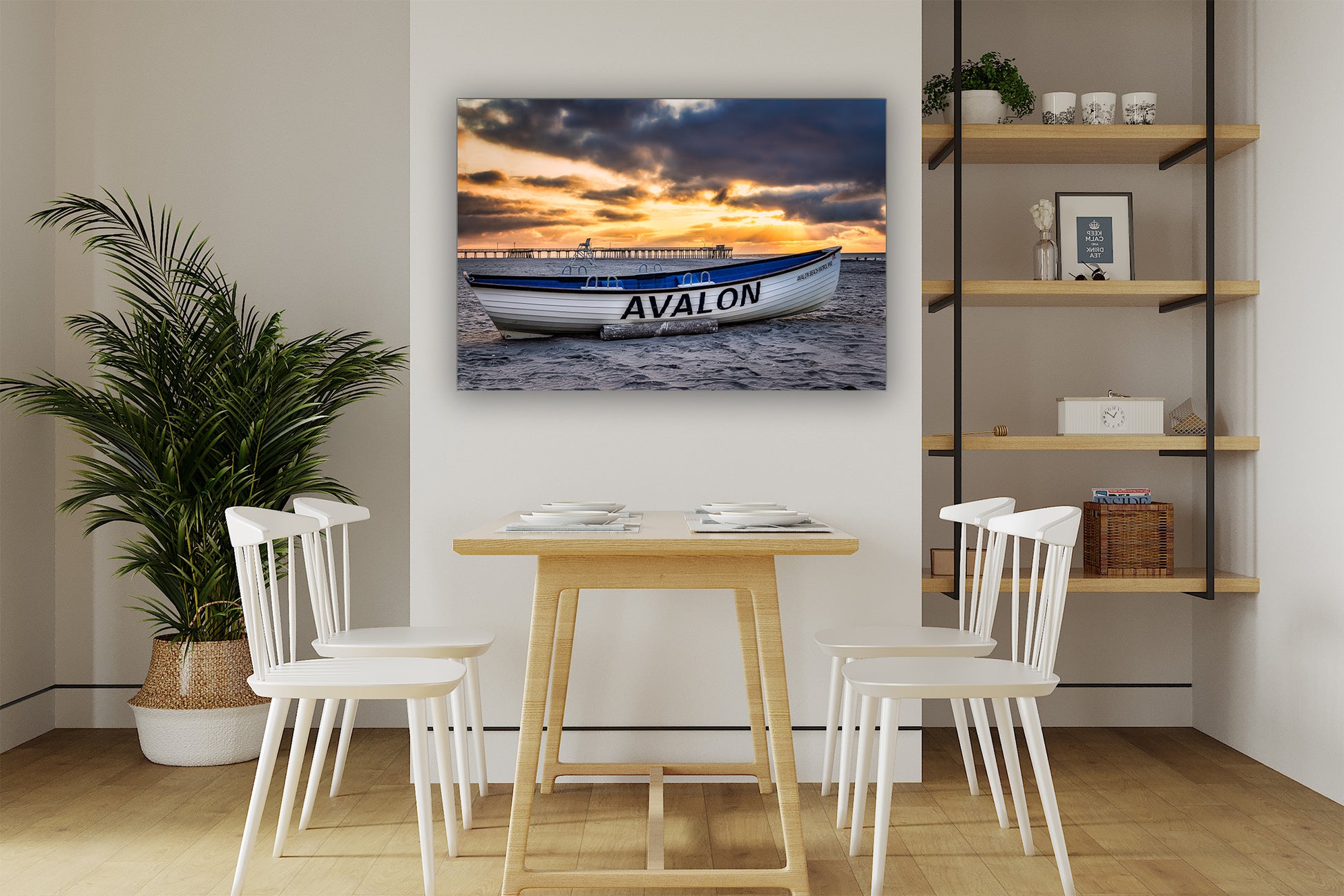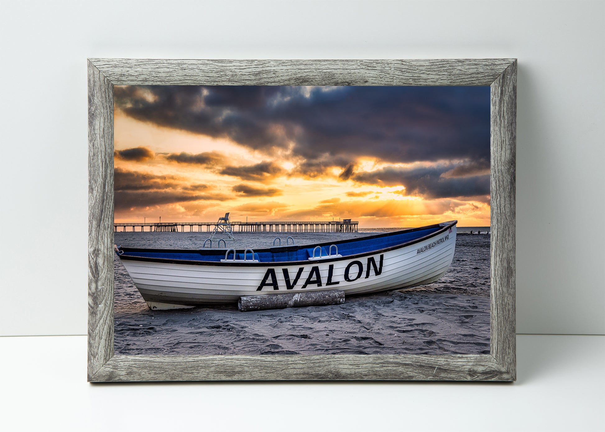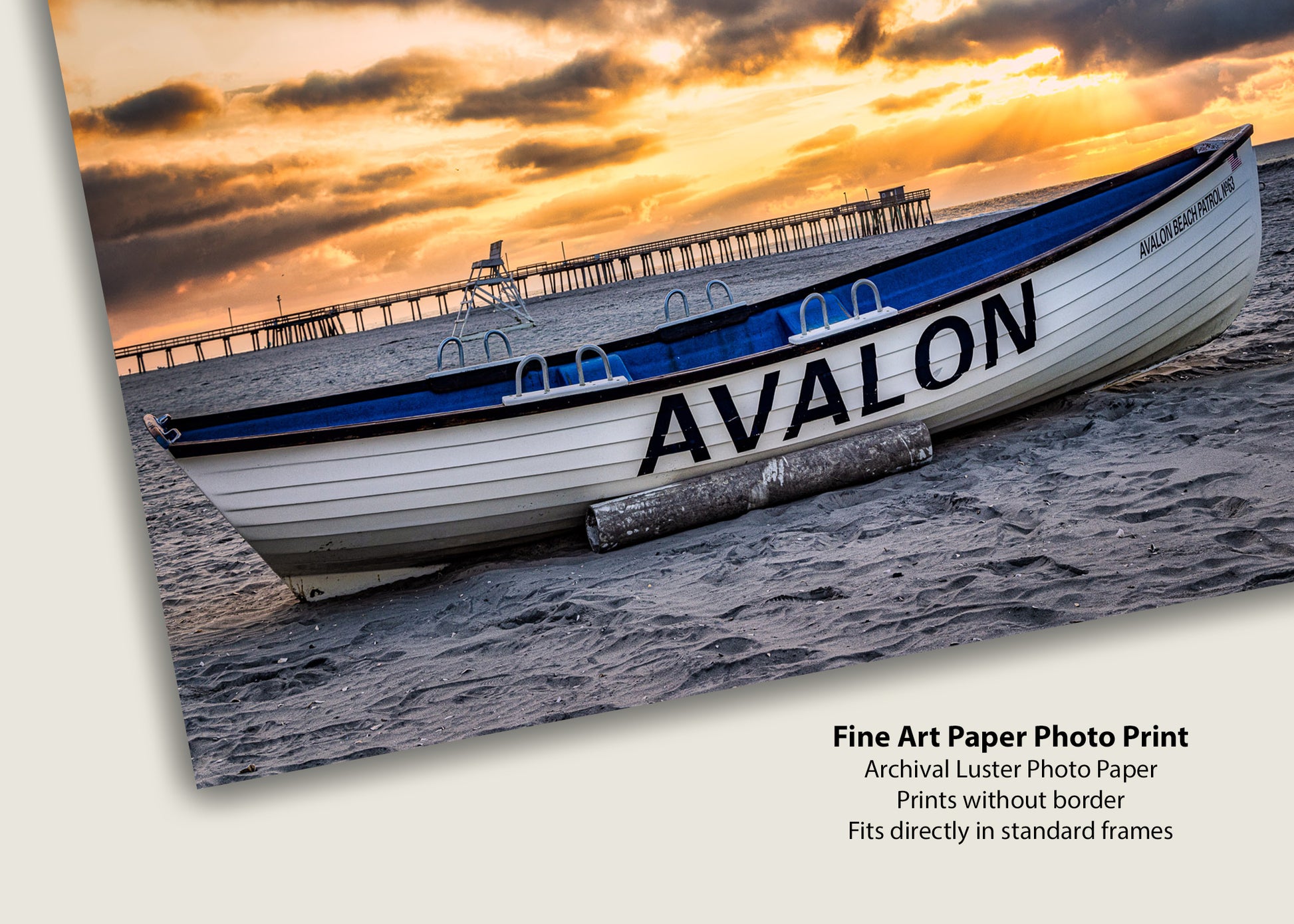 Una lancha salvavidas de Avalon descansa tranquilamente sobre la arena mientras el cielo se tiñe de naranja al amanecer. A lo lejos, el muelle pesquero se extiende con gracia sobre las olas, recortado contra la cálida luz de la mañana. El suave resplandor del amanecer realza las texturas de la arena y las suaves curvas de la lancha, capturando a la perfección la calma y la belleza de un nuevo día en la costa de Jersey.