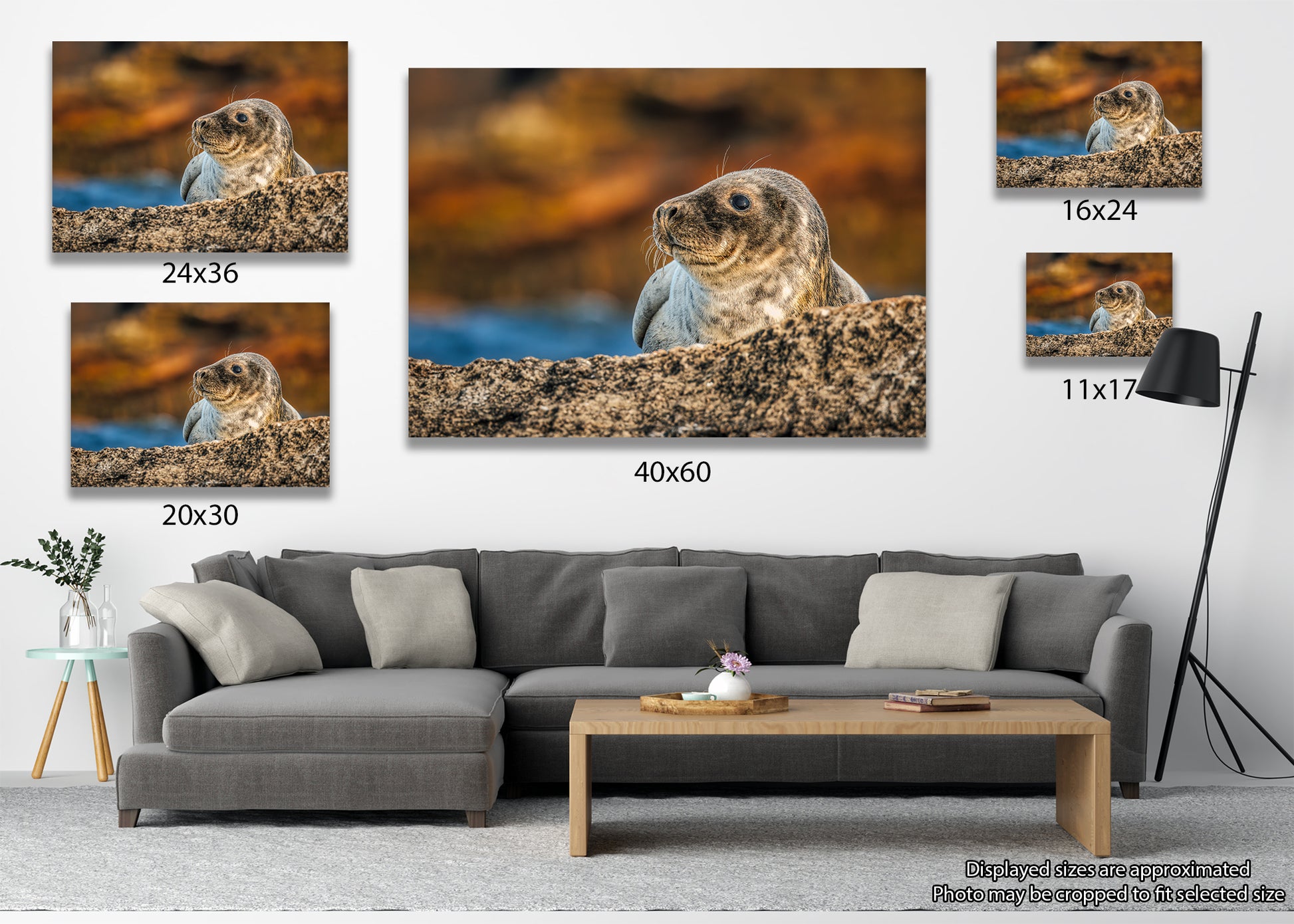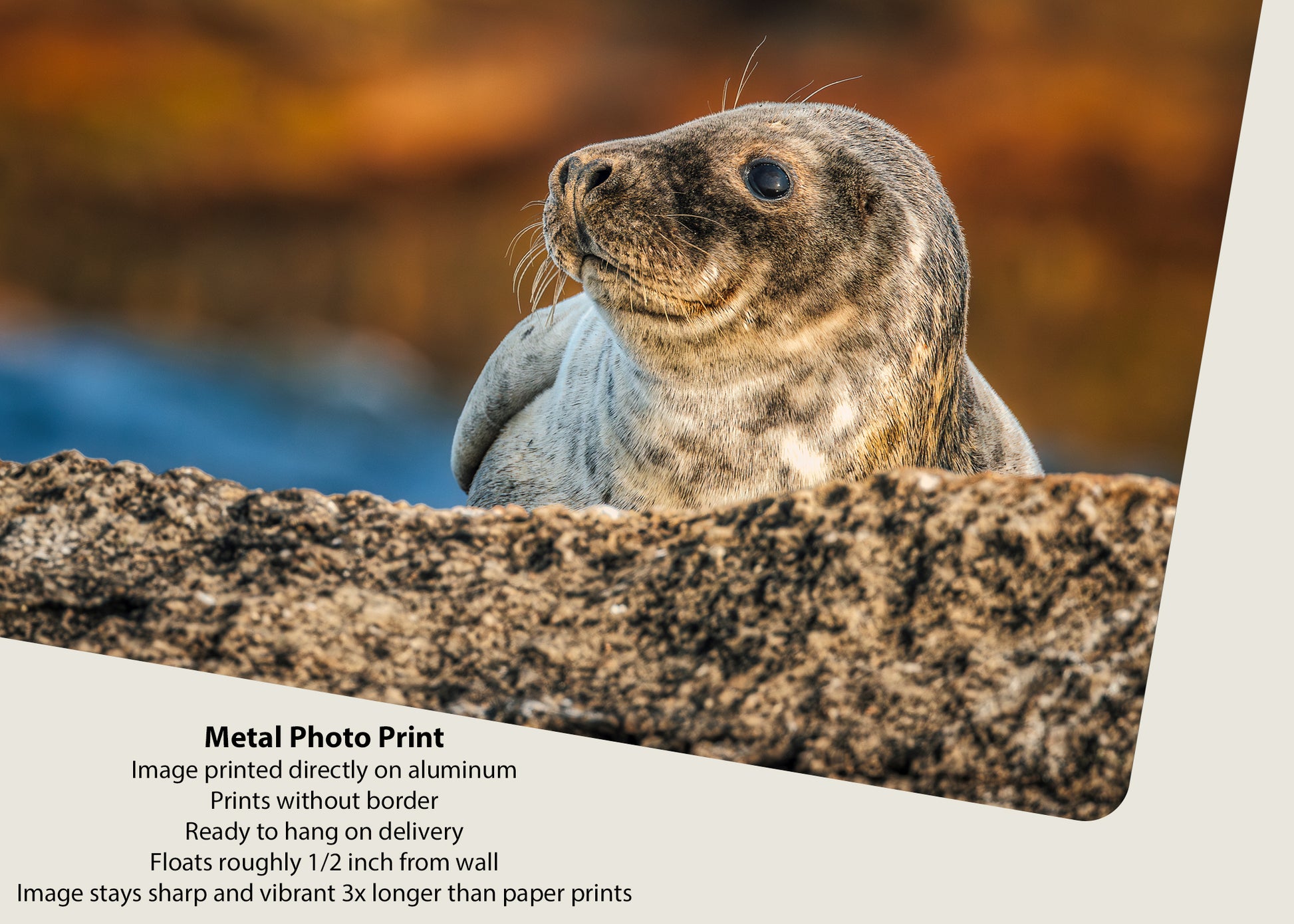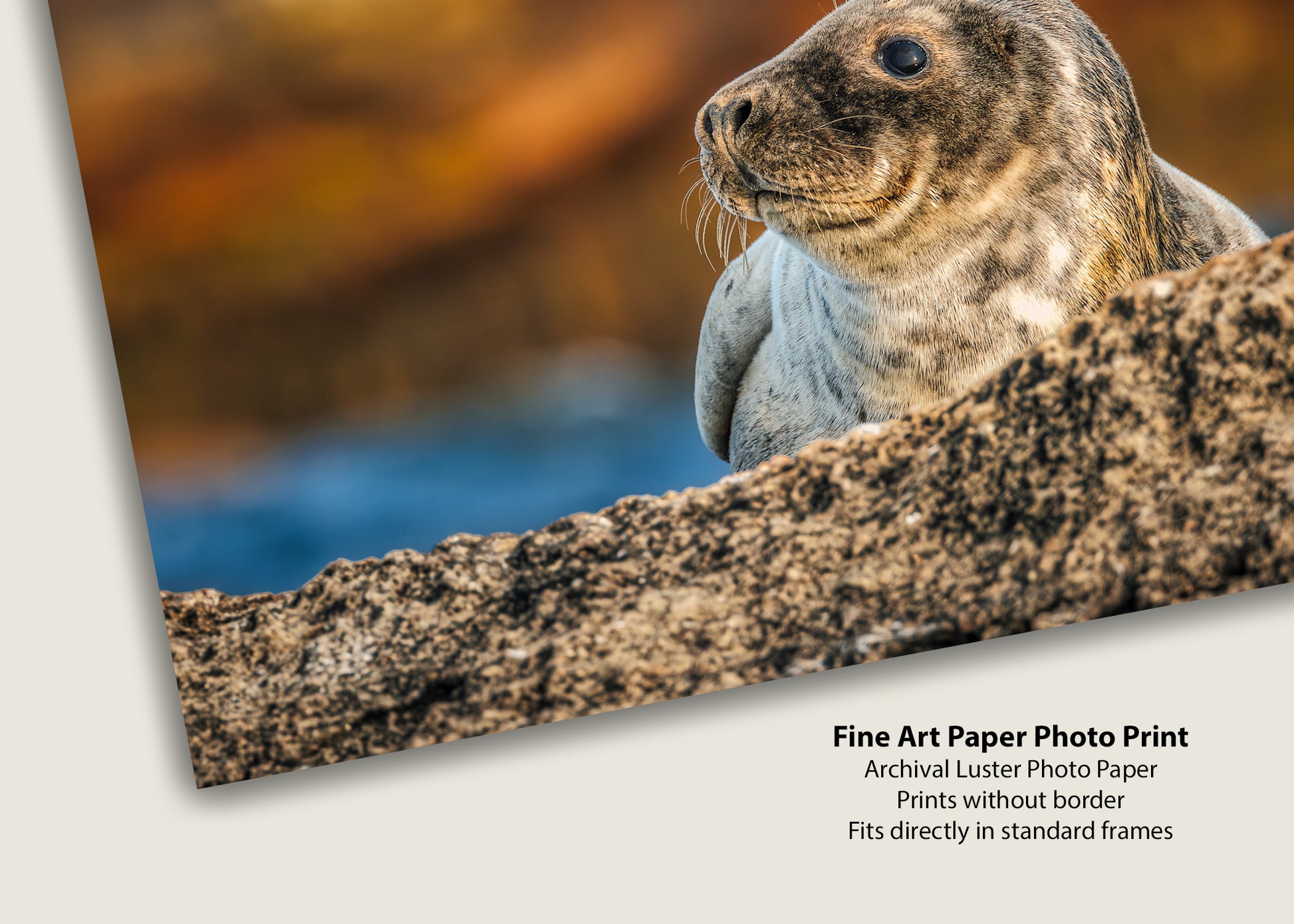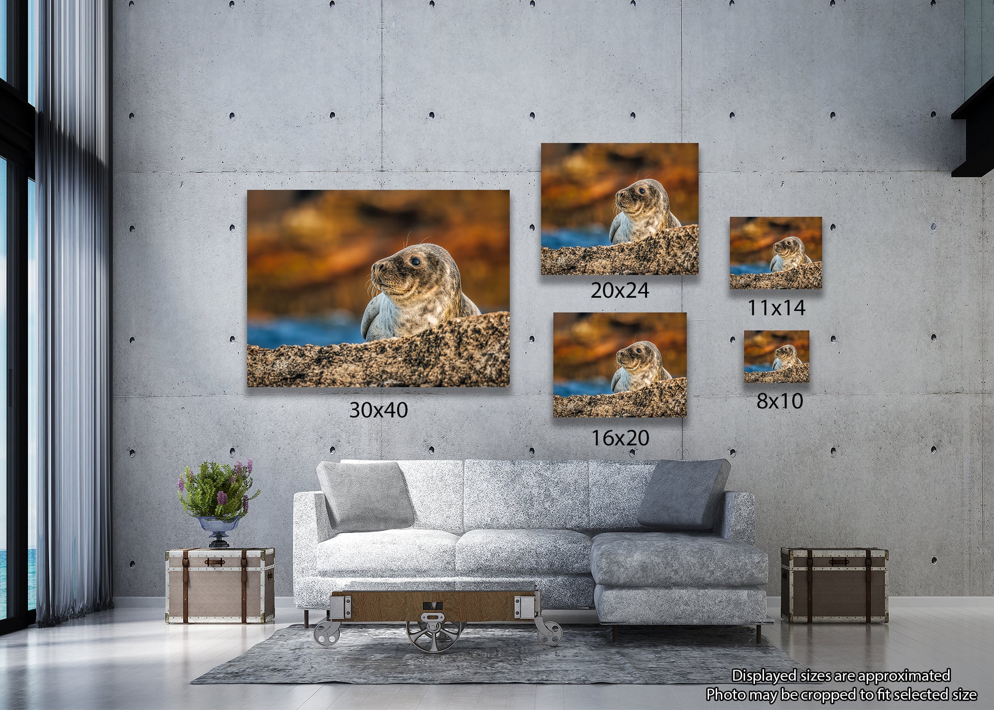 Una cría de foca se asoma sobre una roca erosionada en la costa de Cabo Bretón, Nueva Escocia, con su cara redonda y sus grandes ojos llenos de curiosidad. Capturada de perfil, sus bigotes y su suave pelaje se iluminan suavemente, mientras que el primer plano rocoso y el mar lejano evocan la belleza agreste y serena de la costa atlántica.