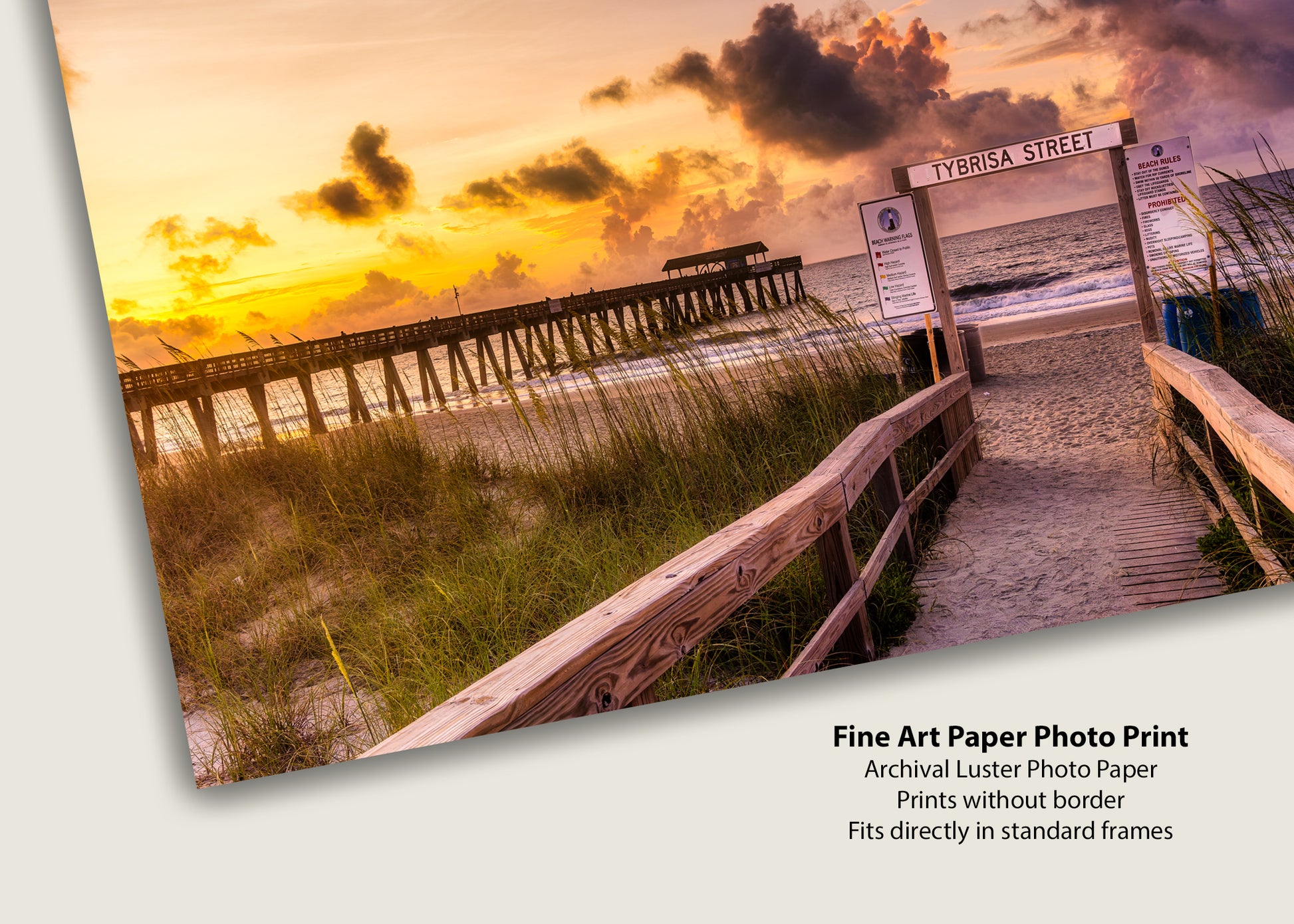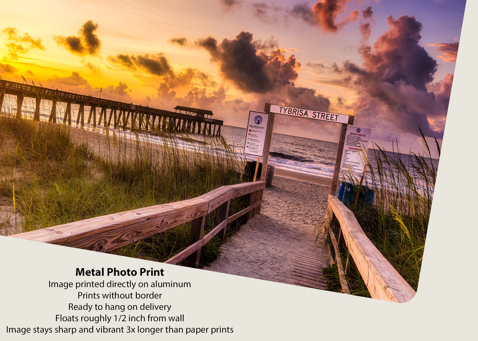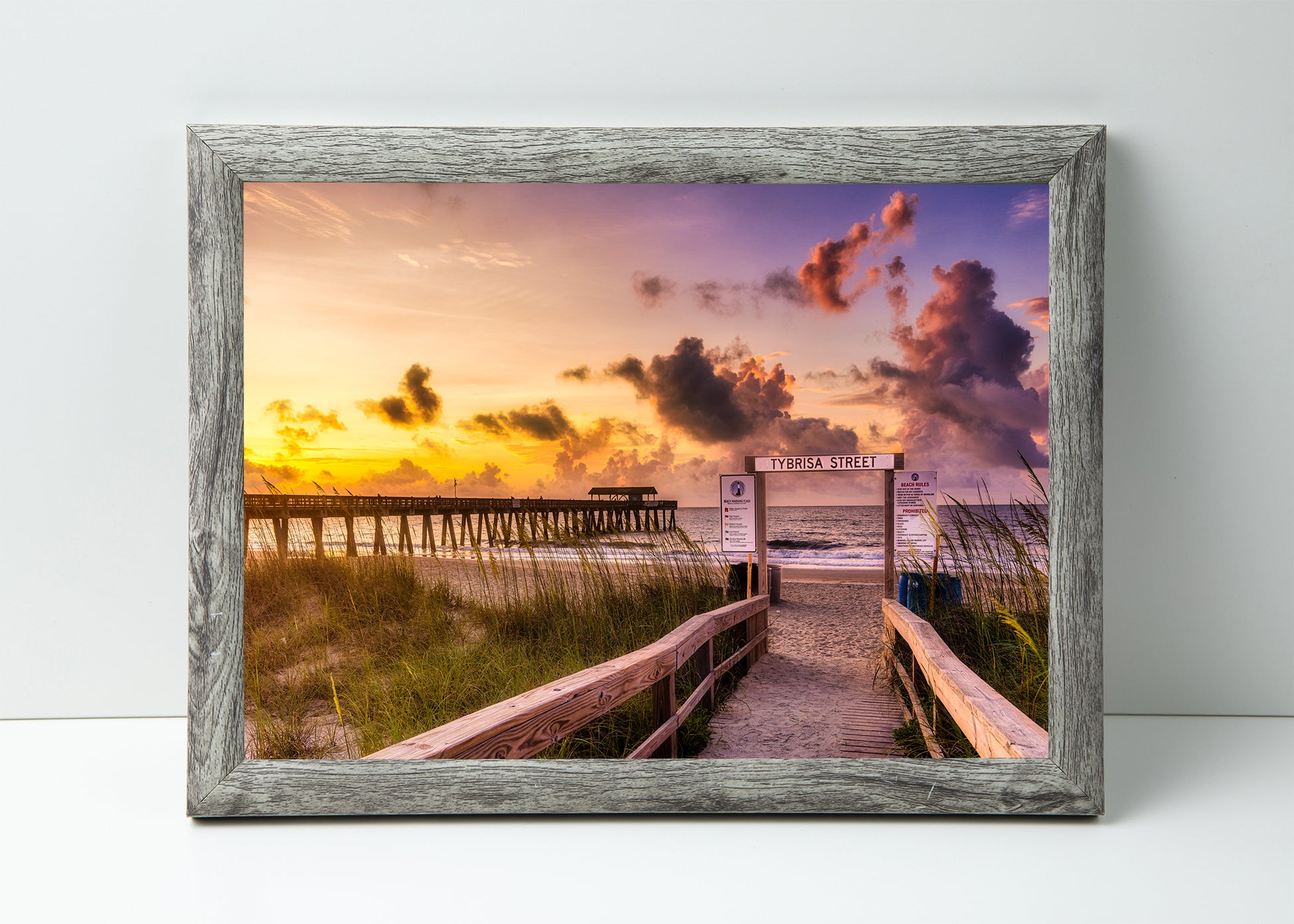Al amanecer en la Playa Norte de la Isla Tybee, una luz dorada se extiende por el cielo, proyectando un cálido resplandor sobre el muelle pesquero a lo lejos. En primer plano, un sendero arenoso enmarcado por la hierba de la playa conduce bajo el icónico letrero de "Tybrisa Street", invitando al espectador a sumergirse en la tranquila escena. La composición captura el apacible encanto de una mañana tranquila en la costa de Georgia.