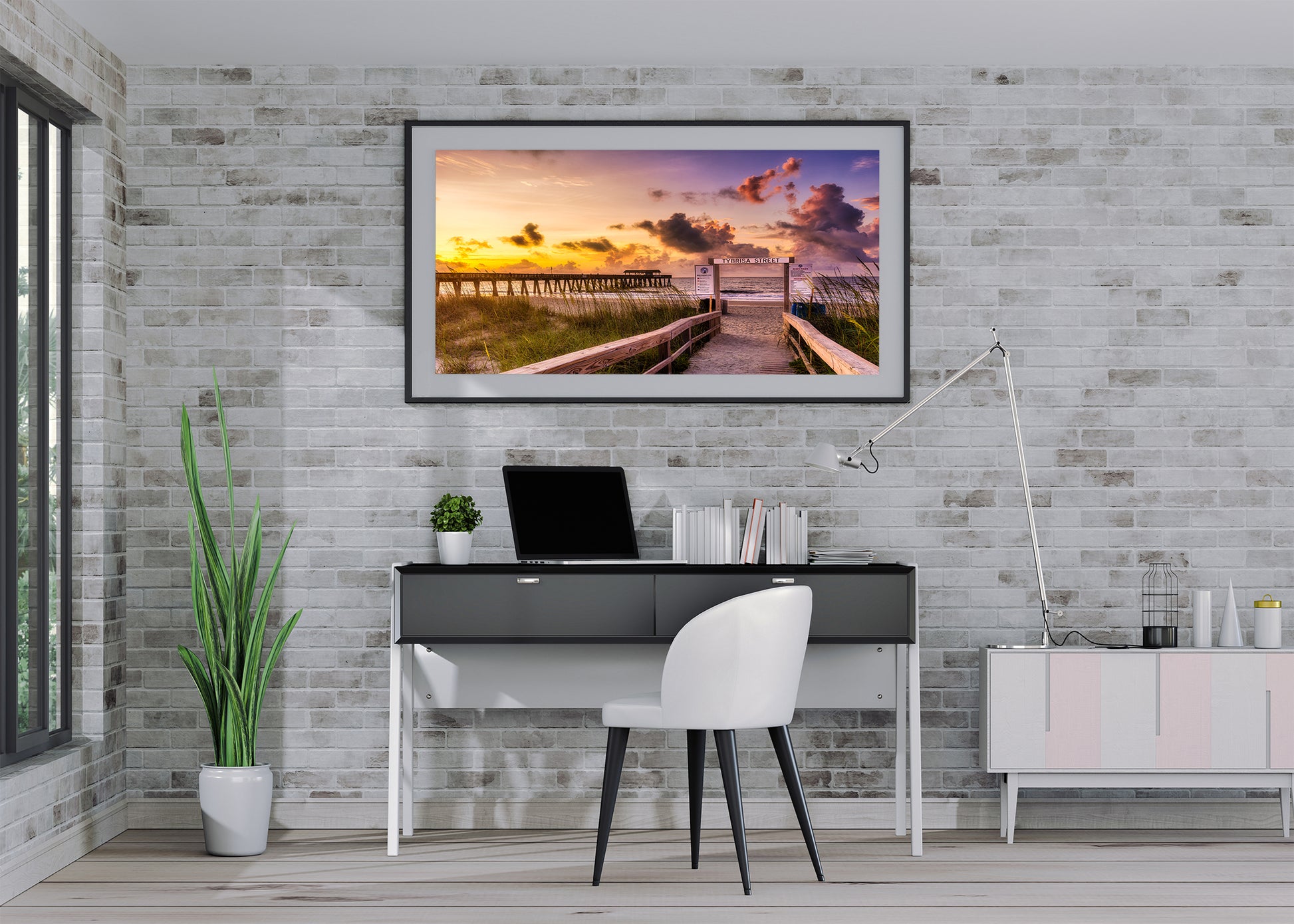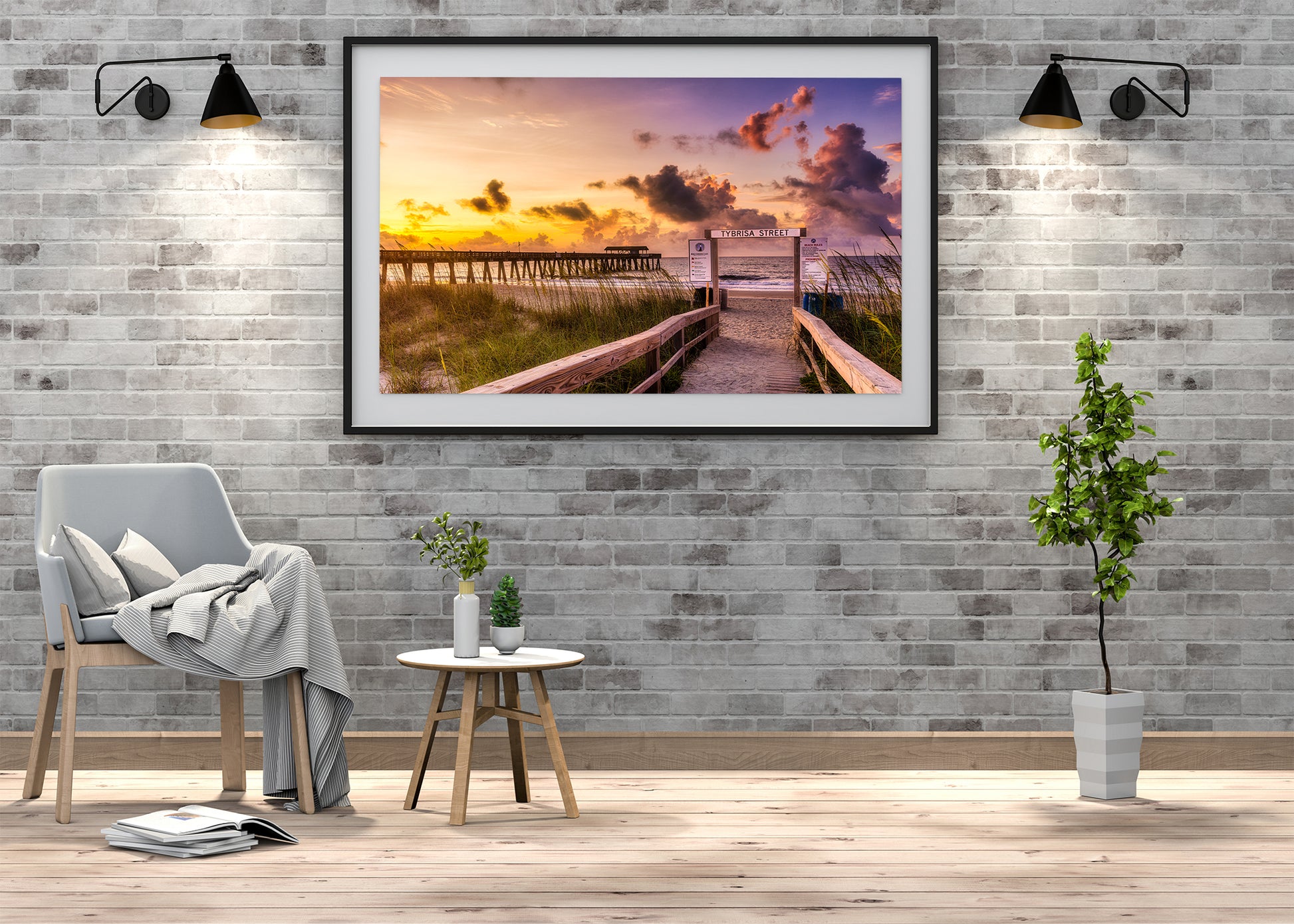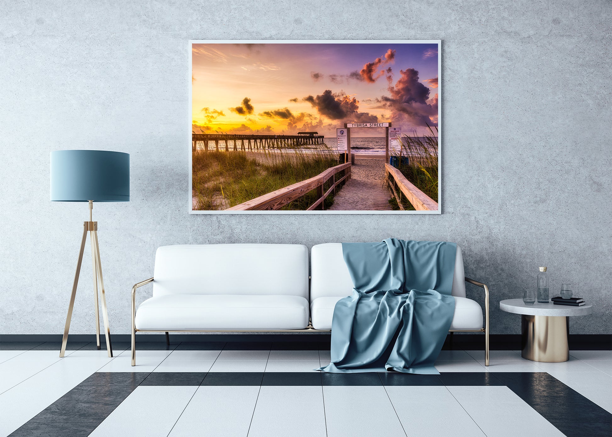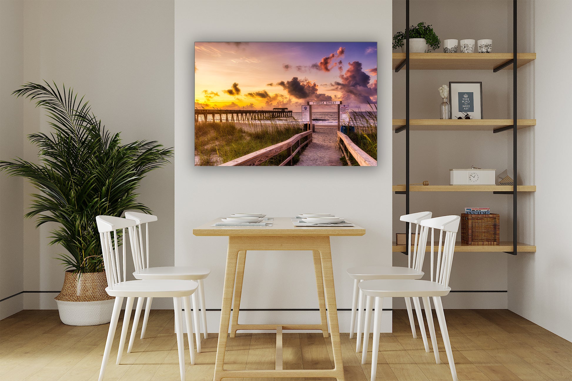 Al amanecer en la Playa Norte de la Isla Tybee, una luz dorada se extiende por el cielo, proyectando un cálido resplandor sobre el muelle pesquero a lo lejos. En primer plano, un sendero arenoso enmarcado por la hierba de la playa conduce bajo el icónico letrero de "Tybrisa Street", invitando al espectador a sumergirse en la tranquila escena. La composición captura el apacible encanto de una mañana tranquila en la costa de Georgia.