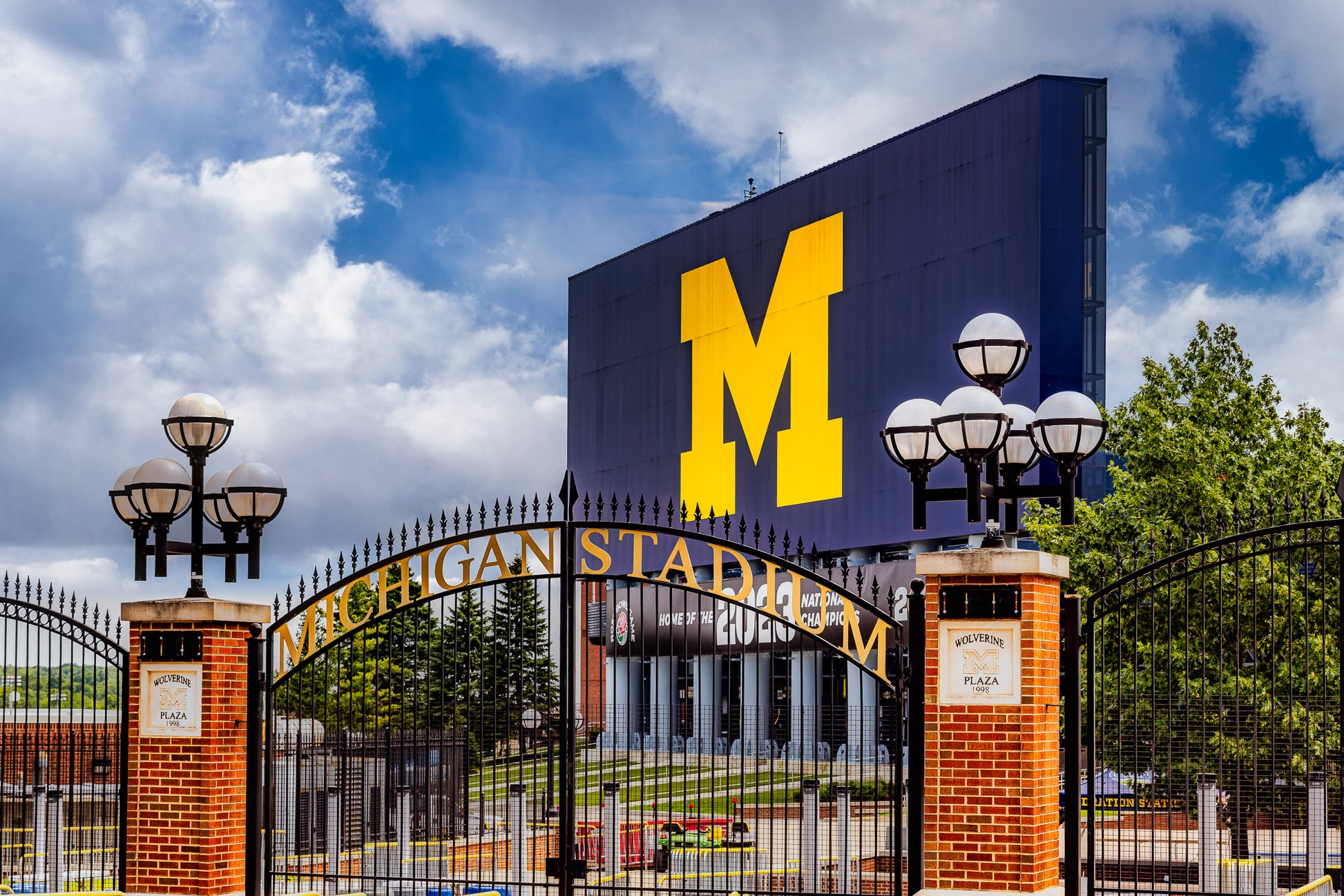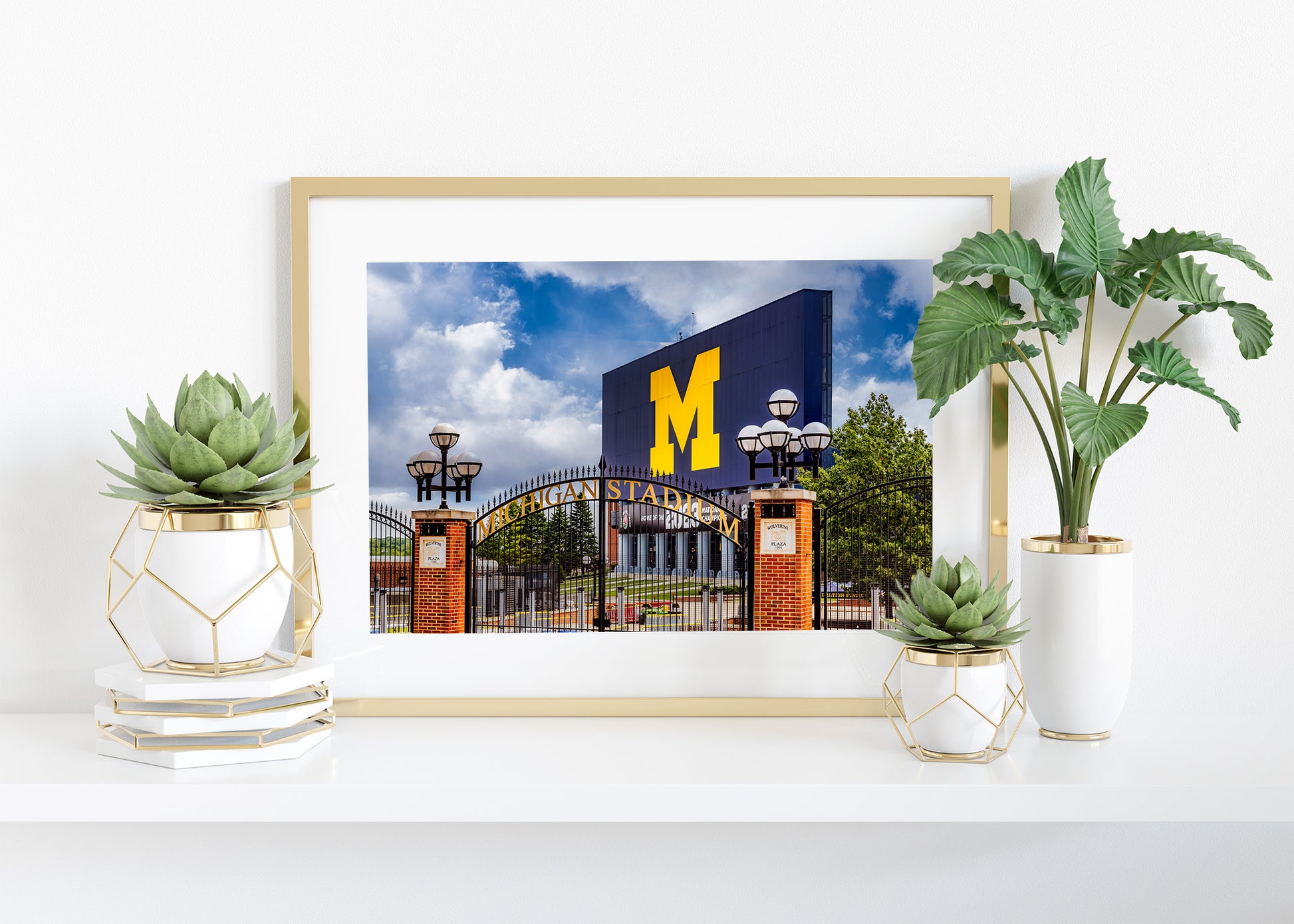 Esta fotografía resalta la parte trasera del jumbotrón del Estadio Michigan, dominada por la llamativa M mayúscula sobre un espectacular cielo azul nublado. Las icónicas puertas del estadio se encuentran bajo la imponente estructura, imbuyendo la escena de la inconfundible identidad de los Wolverines. El contraste entre el acero, las letras y las nubes texturizadas crea una poderosa sensación de pertenencia.