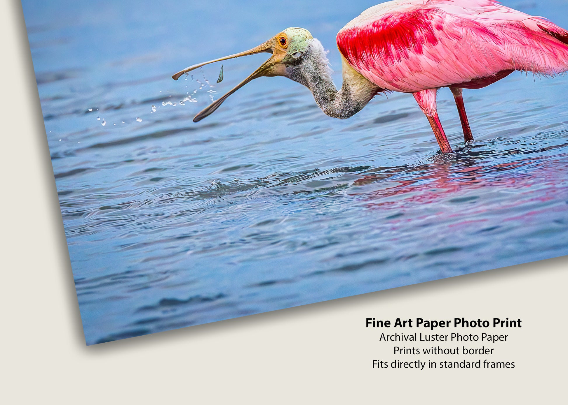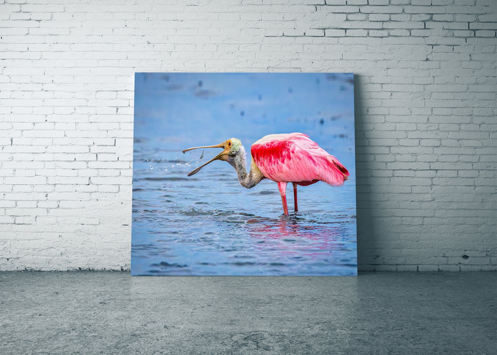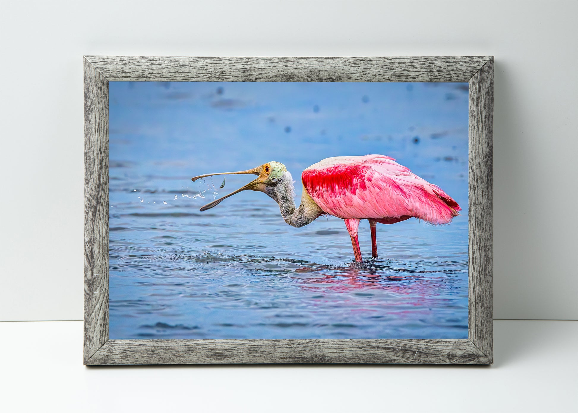 Una espátula rosada se encuentra en las aguas poco profundas de una bahía en la isla Jekyll, con sus plumas de un rosa intenso brillando bajo la luz natural. Capturada en pleno movimiento, el ave lanza un pequeño pez al aire, con el pico bien abierto para atrapar el premio. Las ondas rodean la escena, añadiendo energía y gracia a este momento de fauna costera en acción.