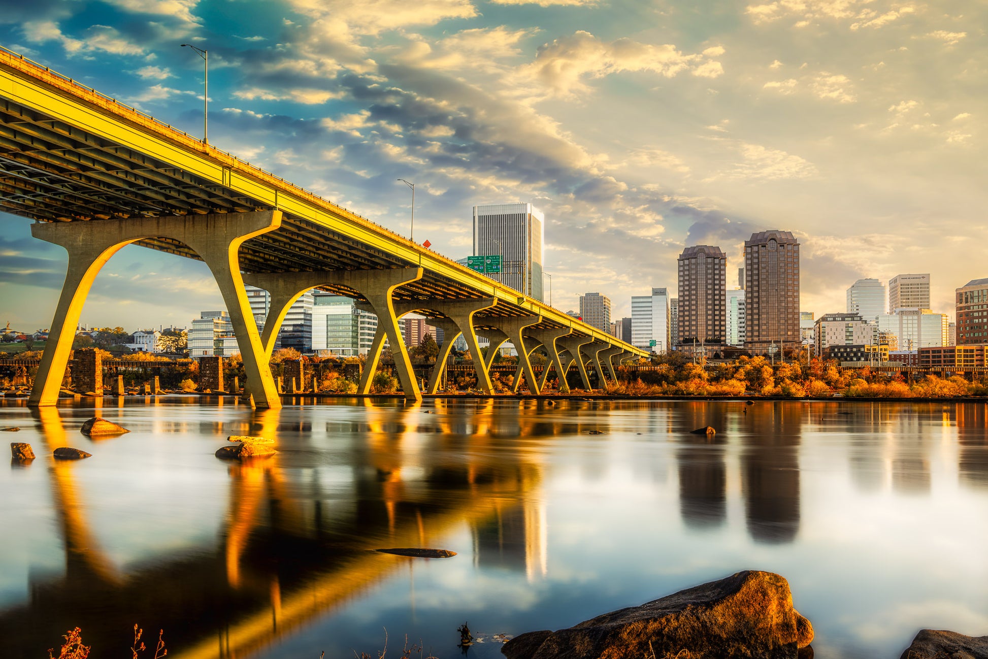 Esta impactante fotografía captura el horizonte de Richmond desde el otro lado del río James, con brillantes reflejos que danzan sobre la superficie del agua. La mezcla de arquitectura histórica y moderna de la ciudad se enmarca a la perfección contra un cielo suave, creando una sensación de profundidad y calma. Las suaves ondulaciones del río dirigen la mirada naturalmente hacia la ciudad, ofreciendo una perspectiva serena y vibrante de la capital de Virginia.