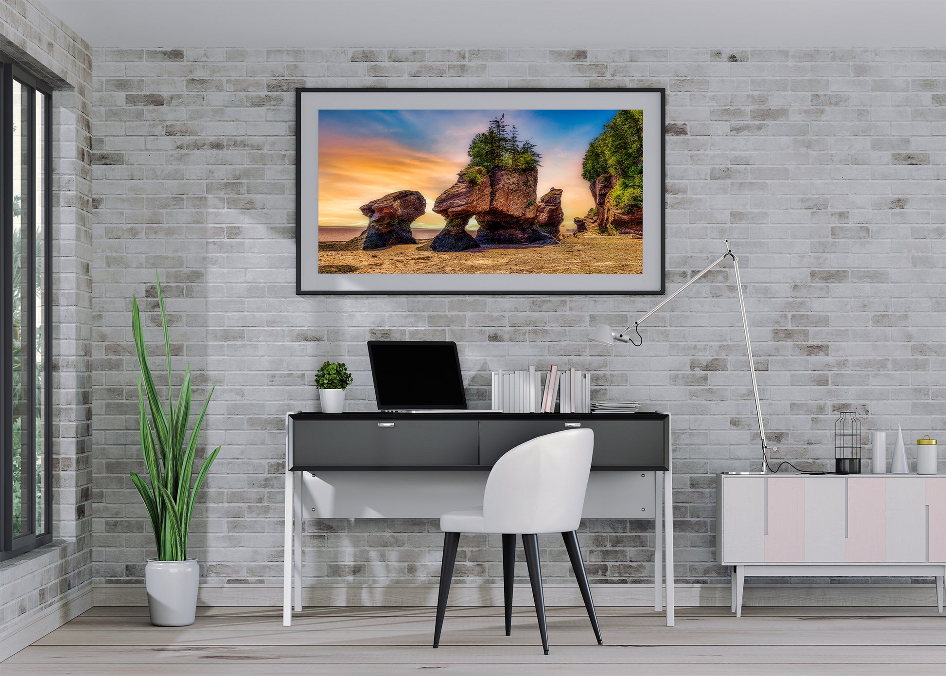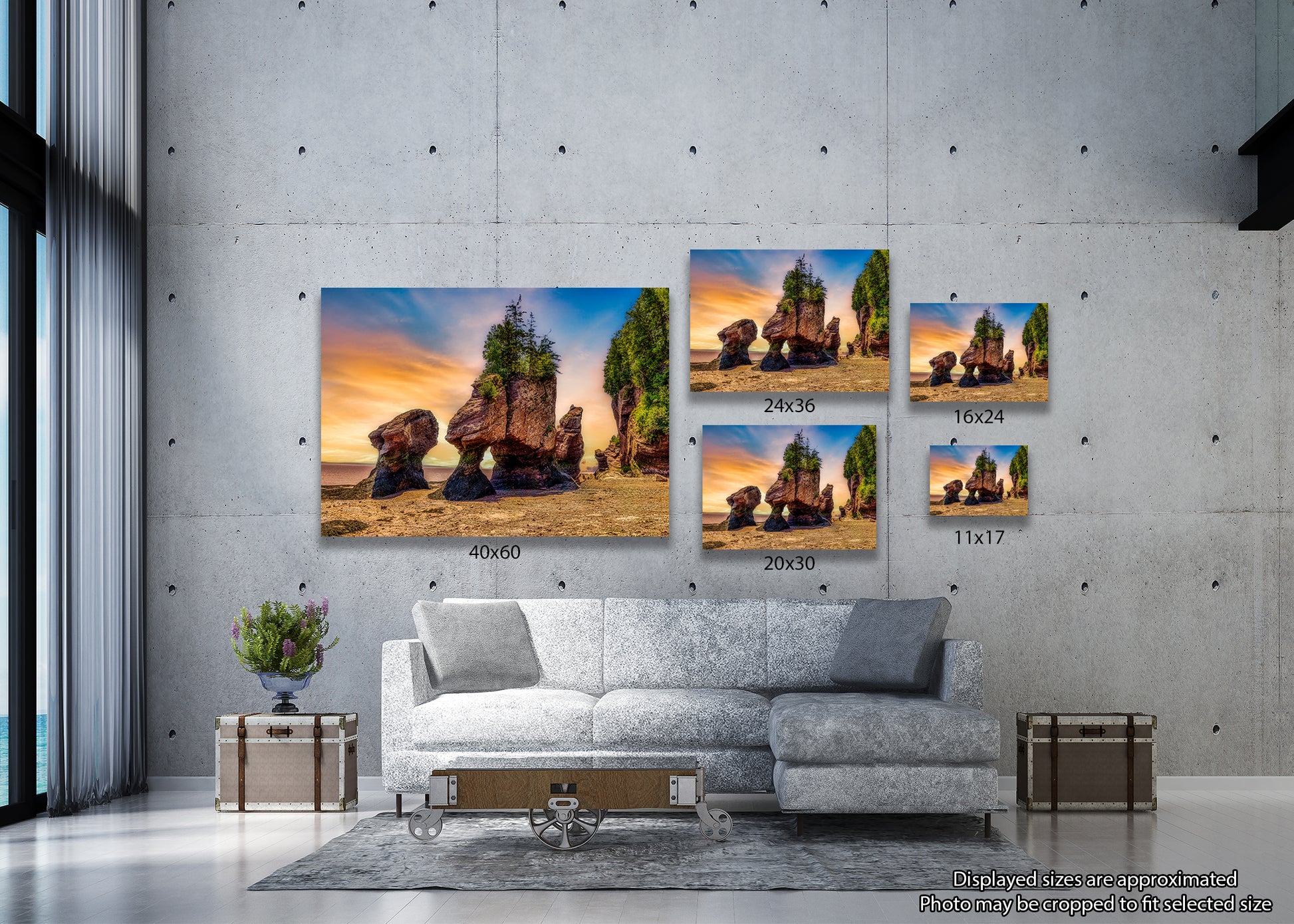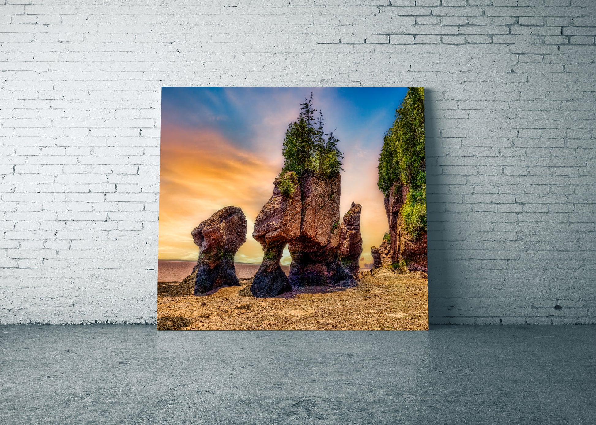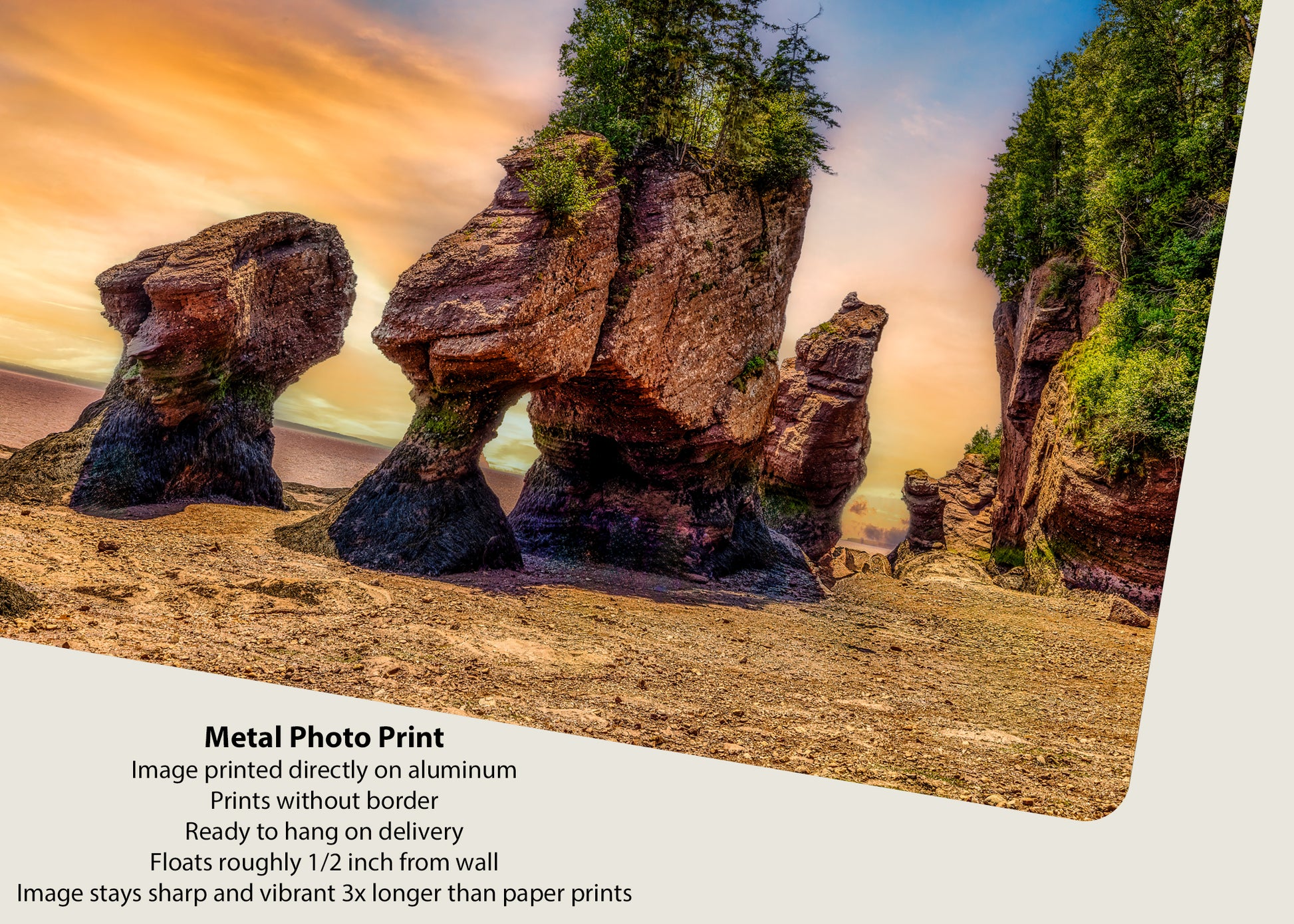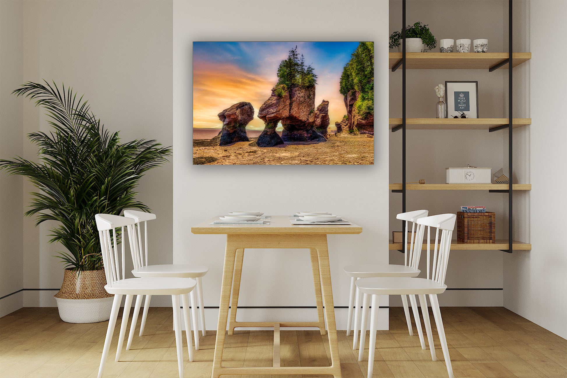 A medida que la marea baja de la Bahía de Fundy, las majestuosas rocas Hopewell se alzan contra un cielo anaranjado que brilla con las últimas luces del día. La marea baja revela una arena anaranjada, rica y texturizada, que refleja los tonos de la superficie, creando una vívida armonía entre la tierra y el cielo. Con sus llamativas formas e imponentes, los farallones se ven aún más monumentales al estar completamente expuestos.