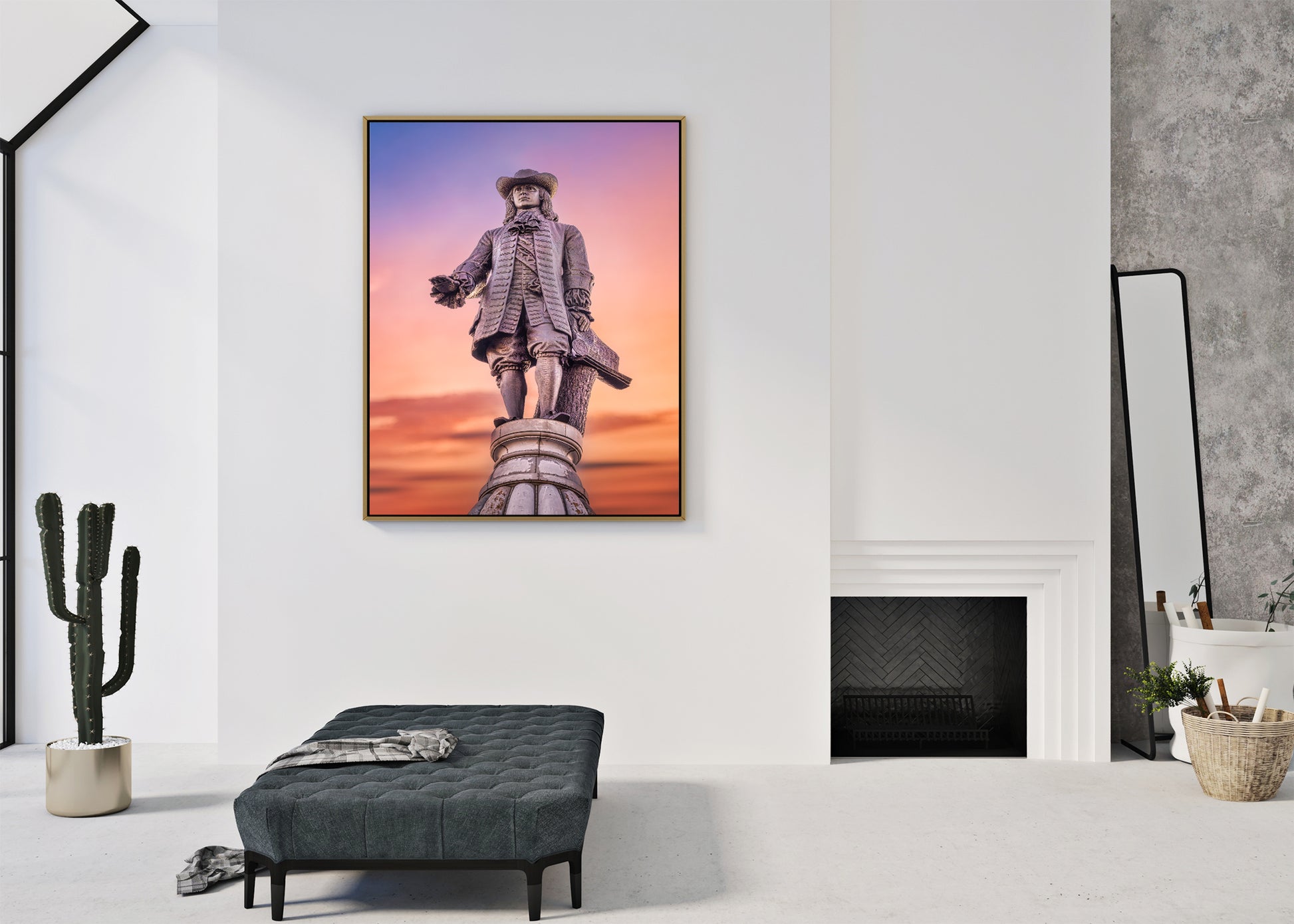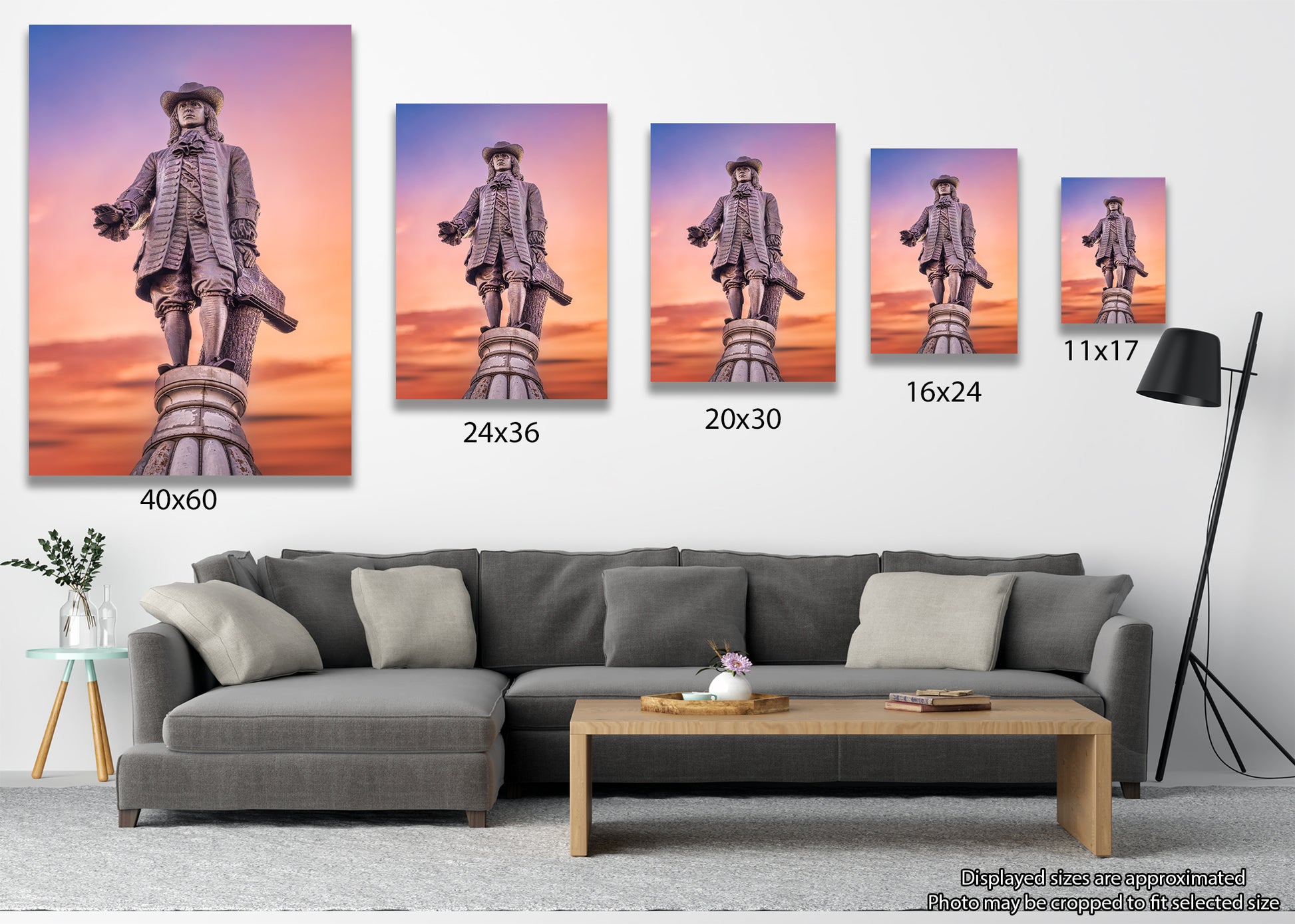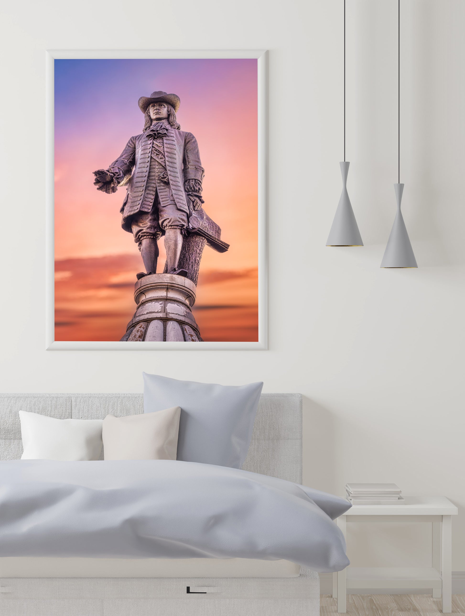 La estatua de William Penn, en lo alto del Ayuntamiento de Filadelfia, se yergue imponente y atemporal bajo un radiante atardecer rosa y morado. La luz del día, que se desvanece, tiñe el cielo de suaves tonos pastel que enmarcan a la perfección la silueta de Penn, un homenaje perdurable al fundador de la ciudad y su histórico pasado. La ornamentada arquitectura del Ayuntamiento brilla suavemente con la luz del atardecer, equilibrando historia y grandeza bajo el cielo colorido.