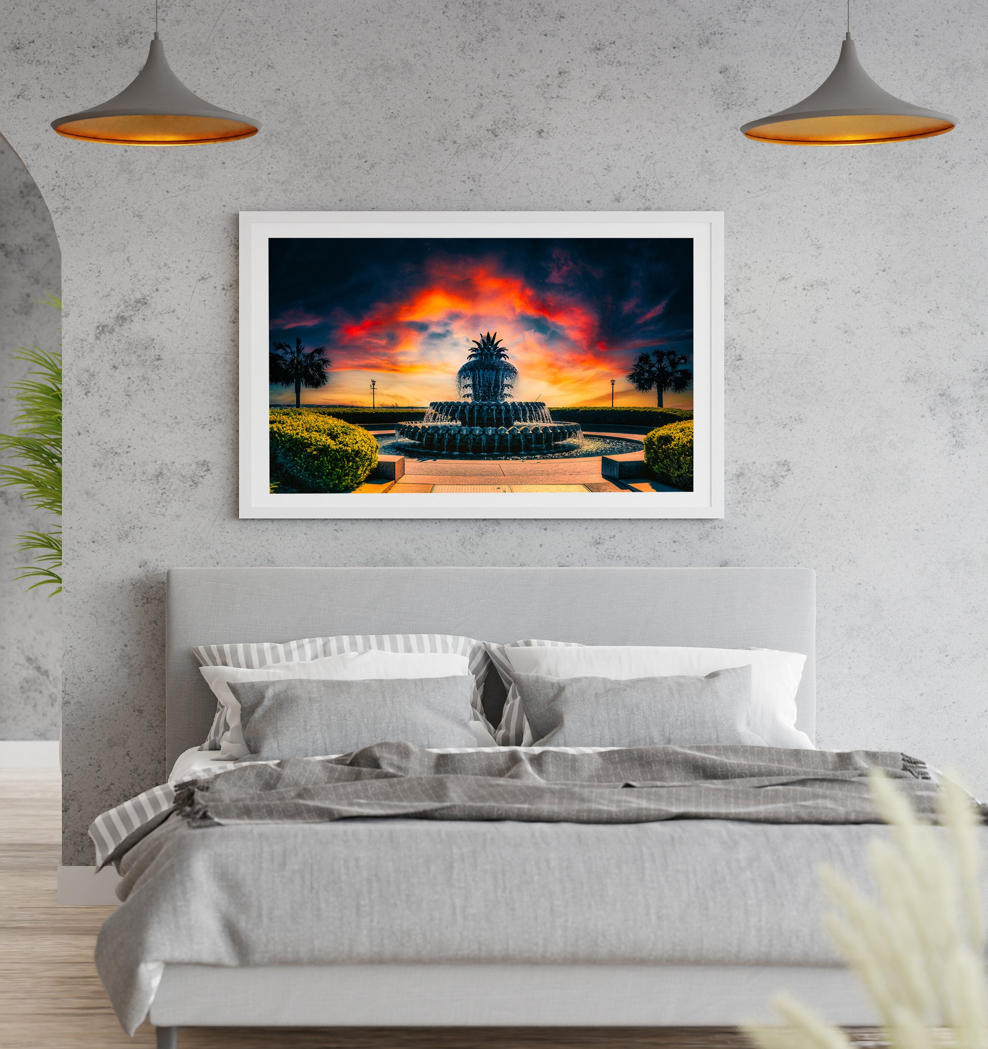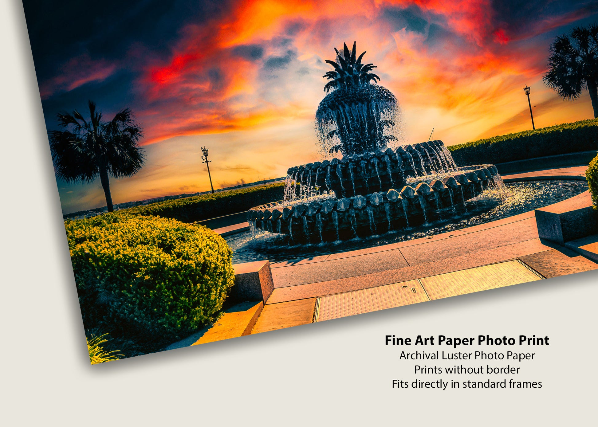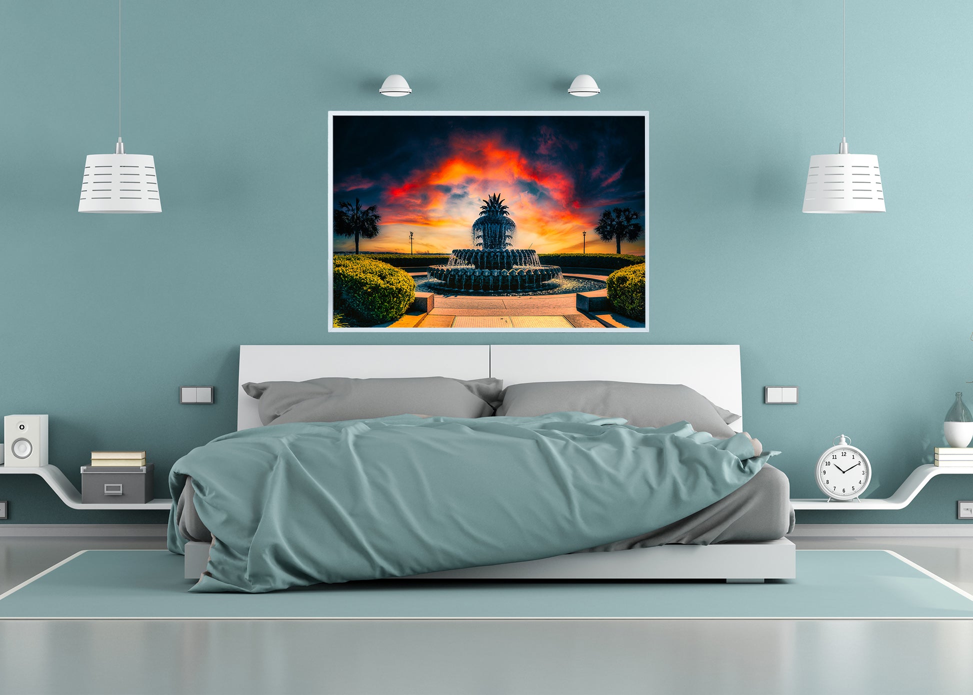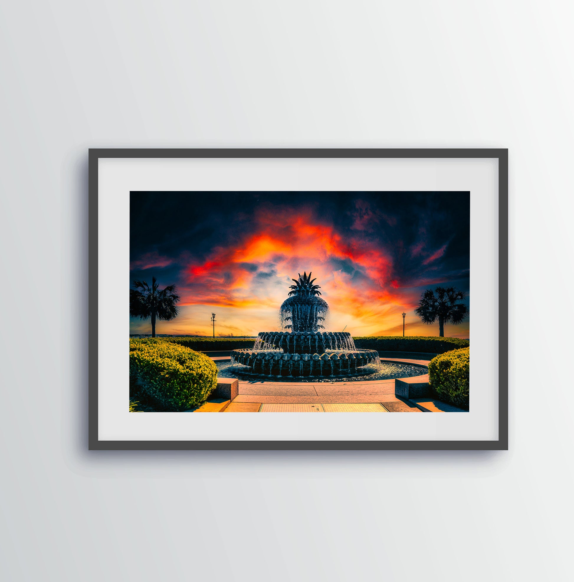 Amanecer que se asoma detrás de la famosa Fuente de la Piña en el Parque Waterfront de Charleston.