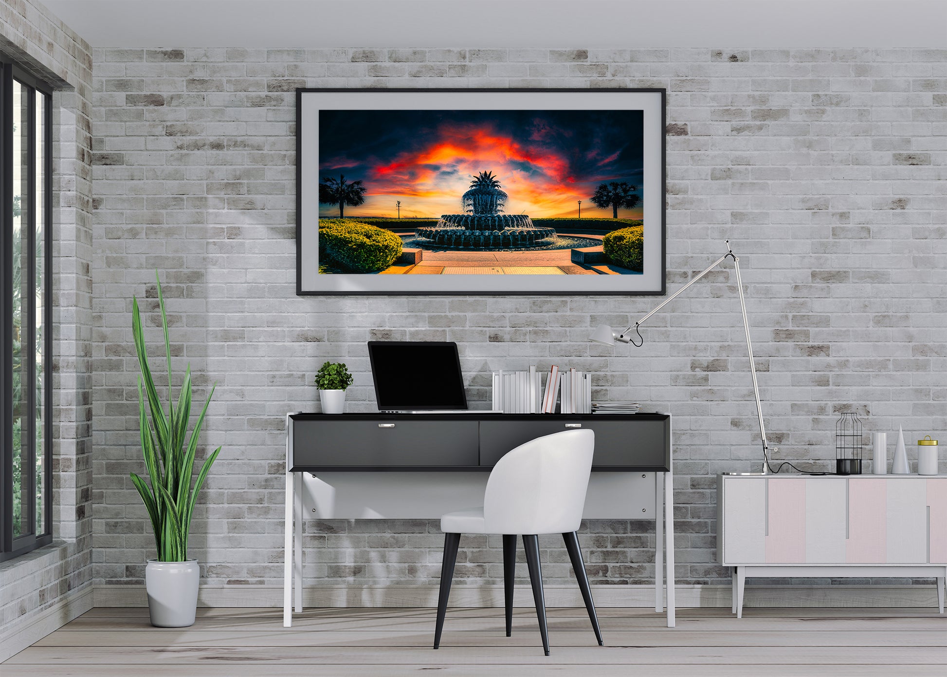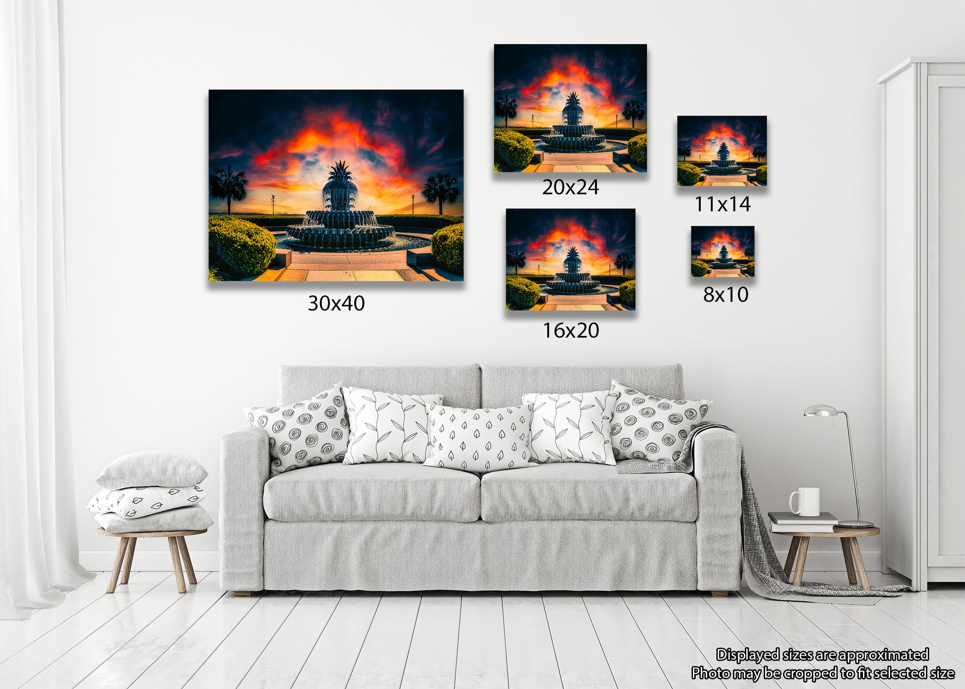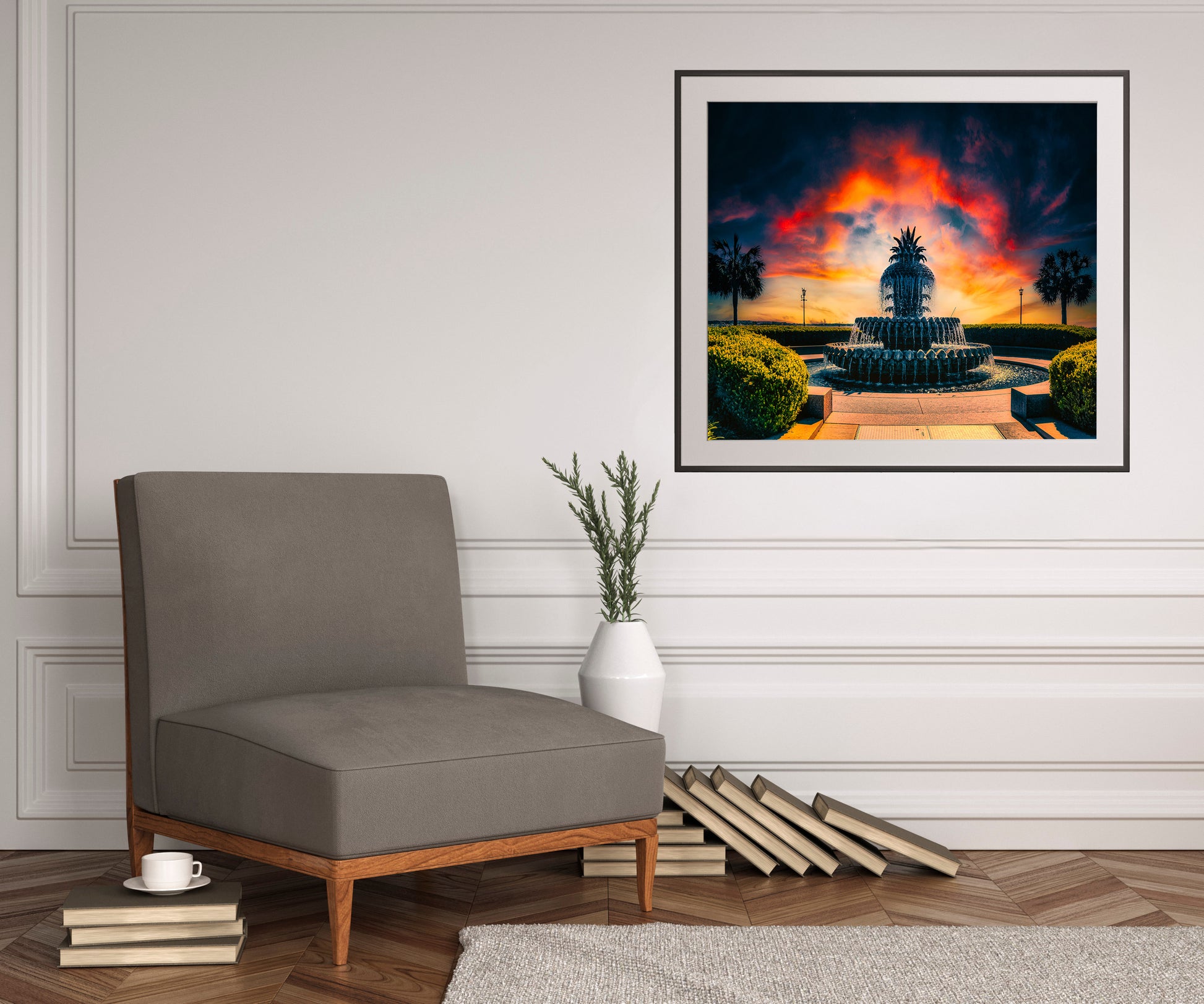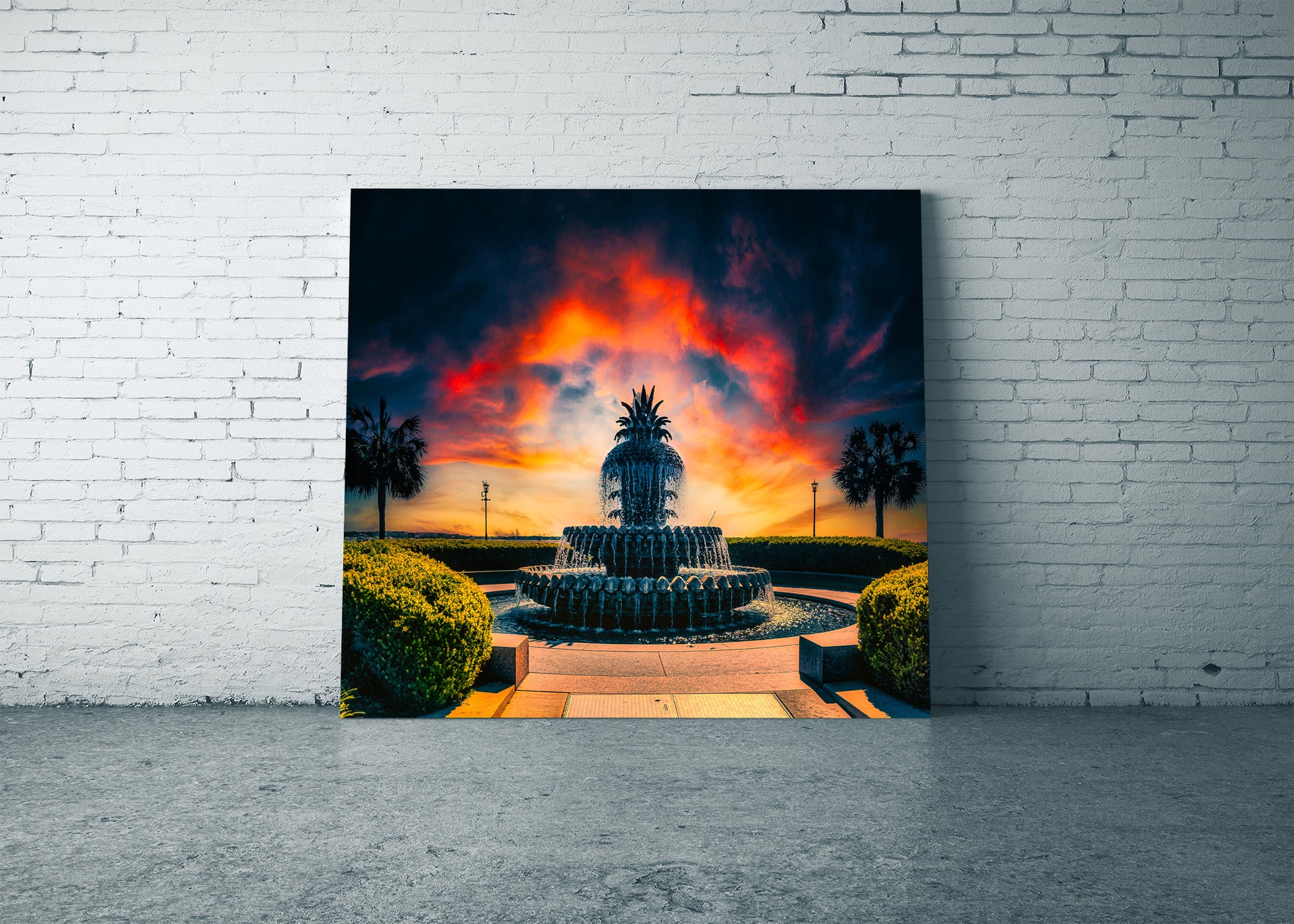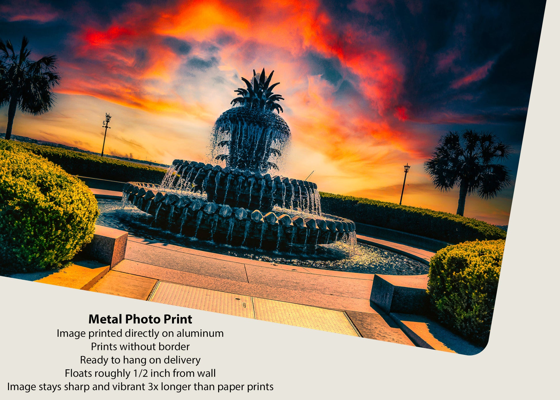 Amanecer que se asoma detrás de la famosa Fuente de la Piña en el Parque Waterfront de Charleston.