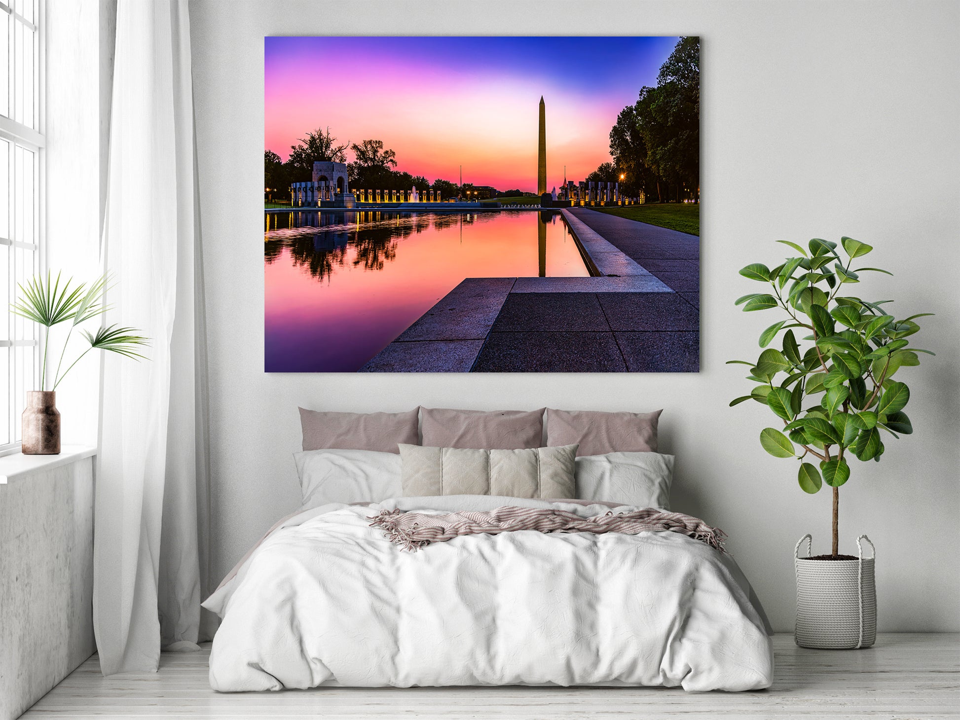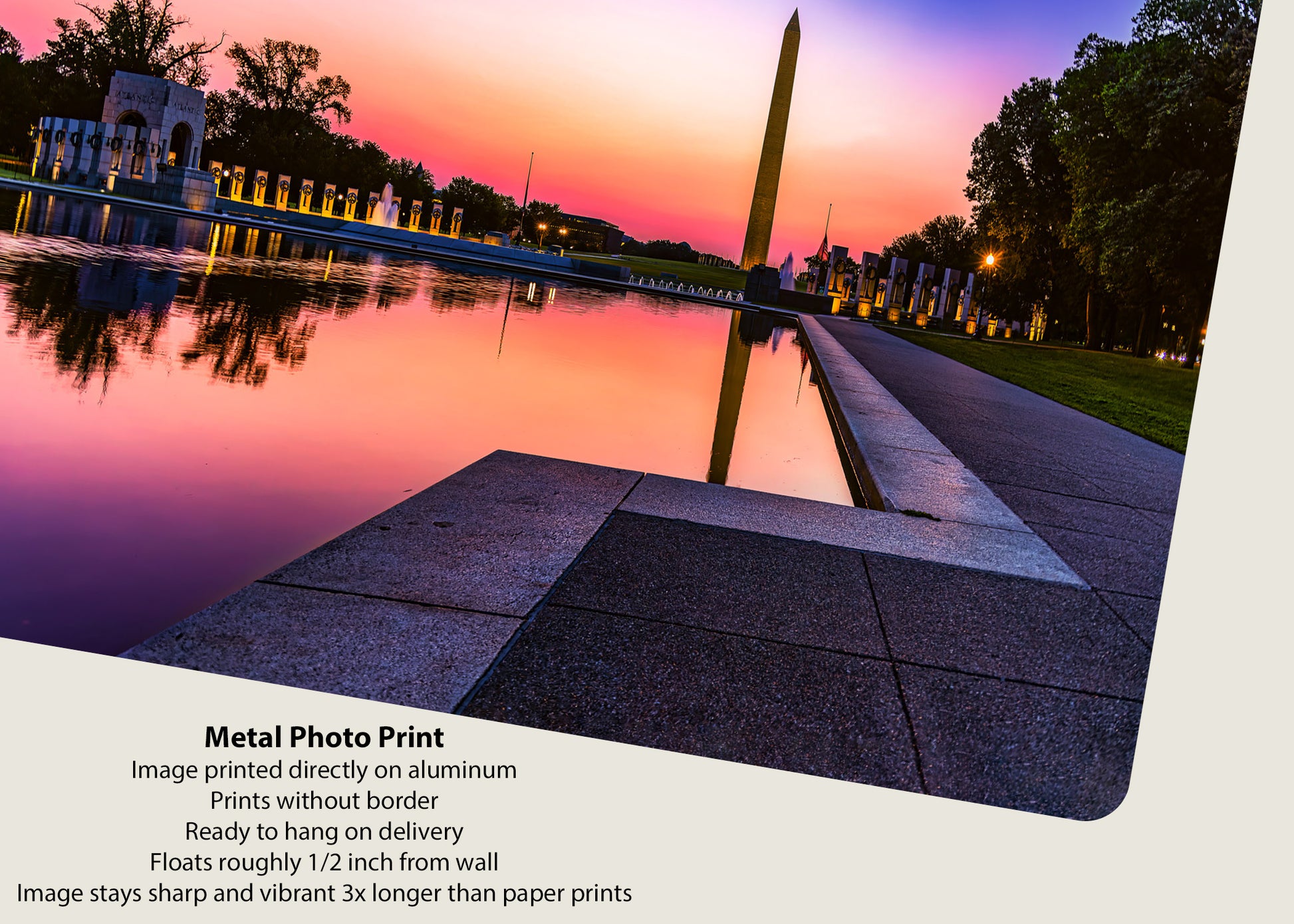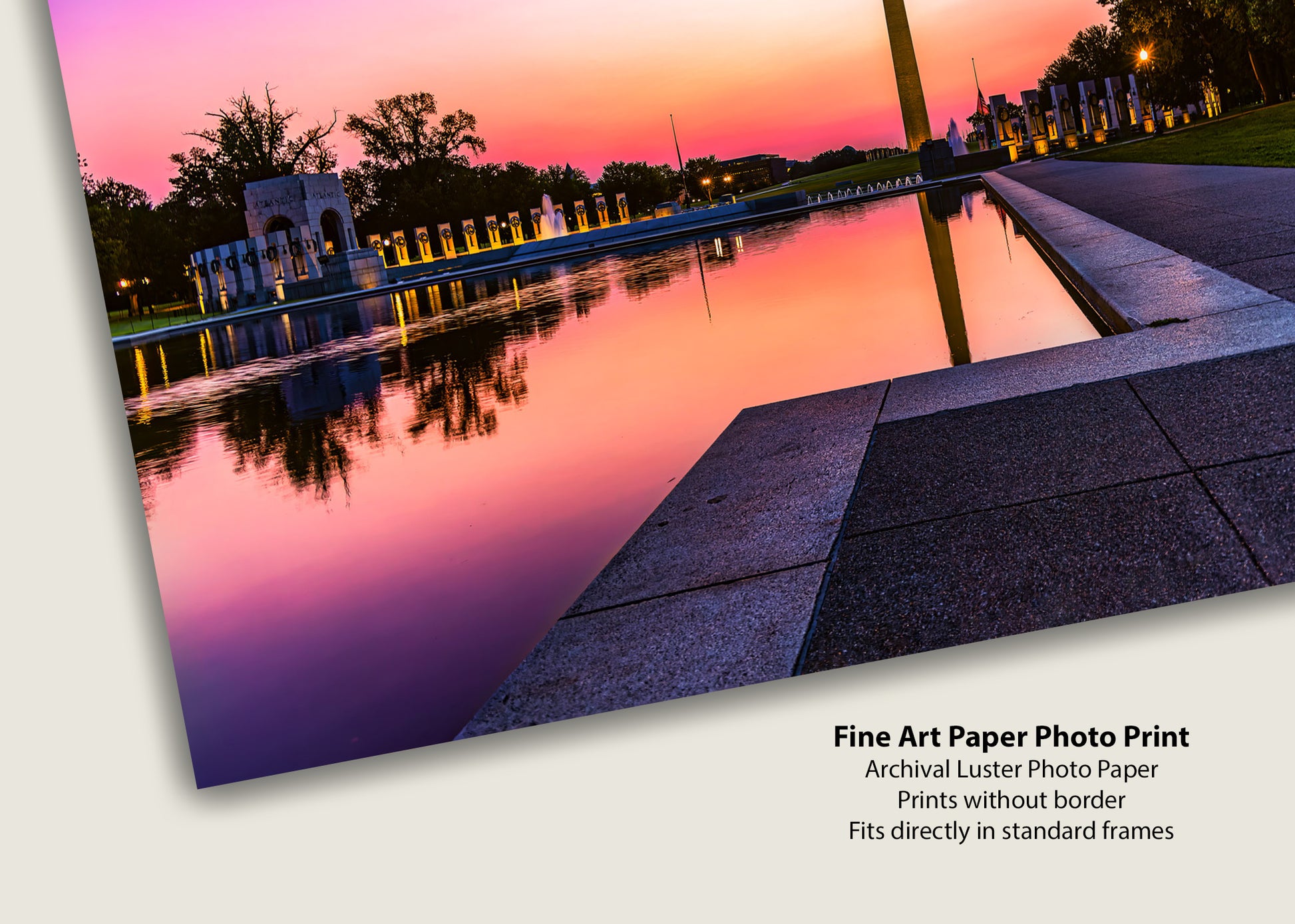 El Monumento a la Segunda Guerra Mundial en Washington D. C. suele pasarse por alto, entre el Monumento a Washington y el Monumento a Lincoln, pero rara vez se menciona junto a ellos. Sin embargo, es el monumento más bonito, compuesto por una enorme plaza con dos fuentes que conmemoran a quienes lucharon en la Segunda Guerra Mundial. Es un monumento difícil de capturar debido a su tamaño, pero el cielo adecuado puede equilibrar la imagen. El amanecer de principios de invierno ofrece un fondo brillante para una tranquila contemplación.