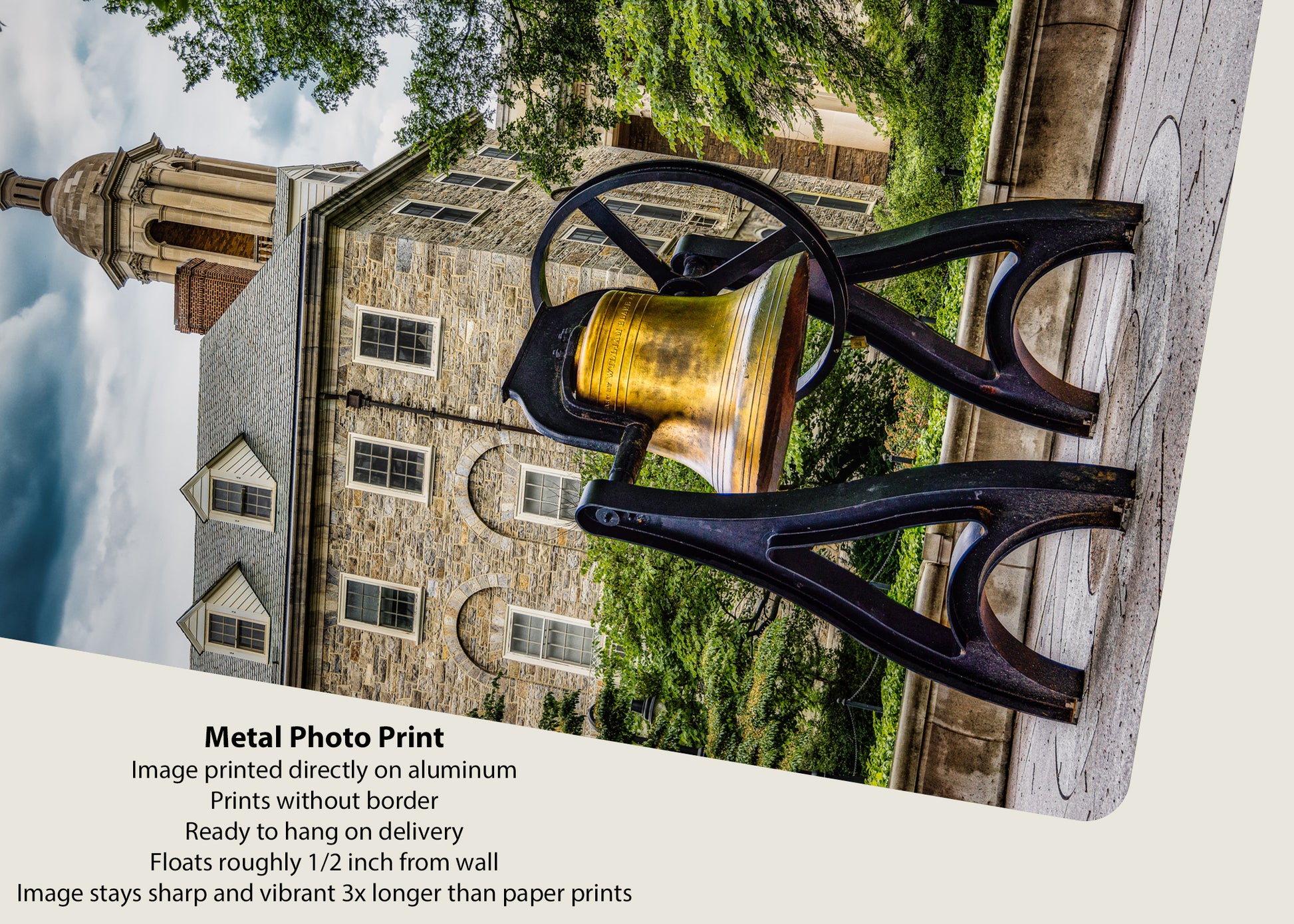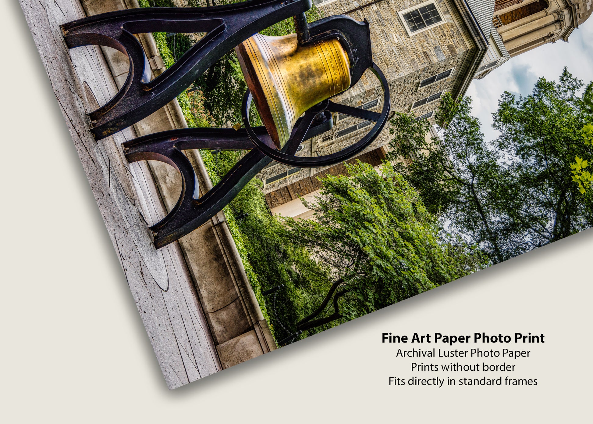El Old Main de Penn State se yergue con silenciosa fuerza tras la campana original del campus, ahora expuesta como una obra de arte histórica. Ubicada justo afuera del emblemático edificio, la desgastada campana ofrece una conexión tangible con el pasado de la universidad, mientras que las majestuosas columnas del Old Main se alzan al fondo bajo un cielo abierto.