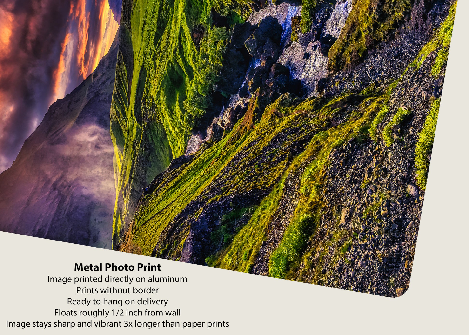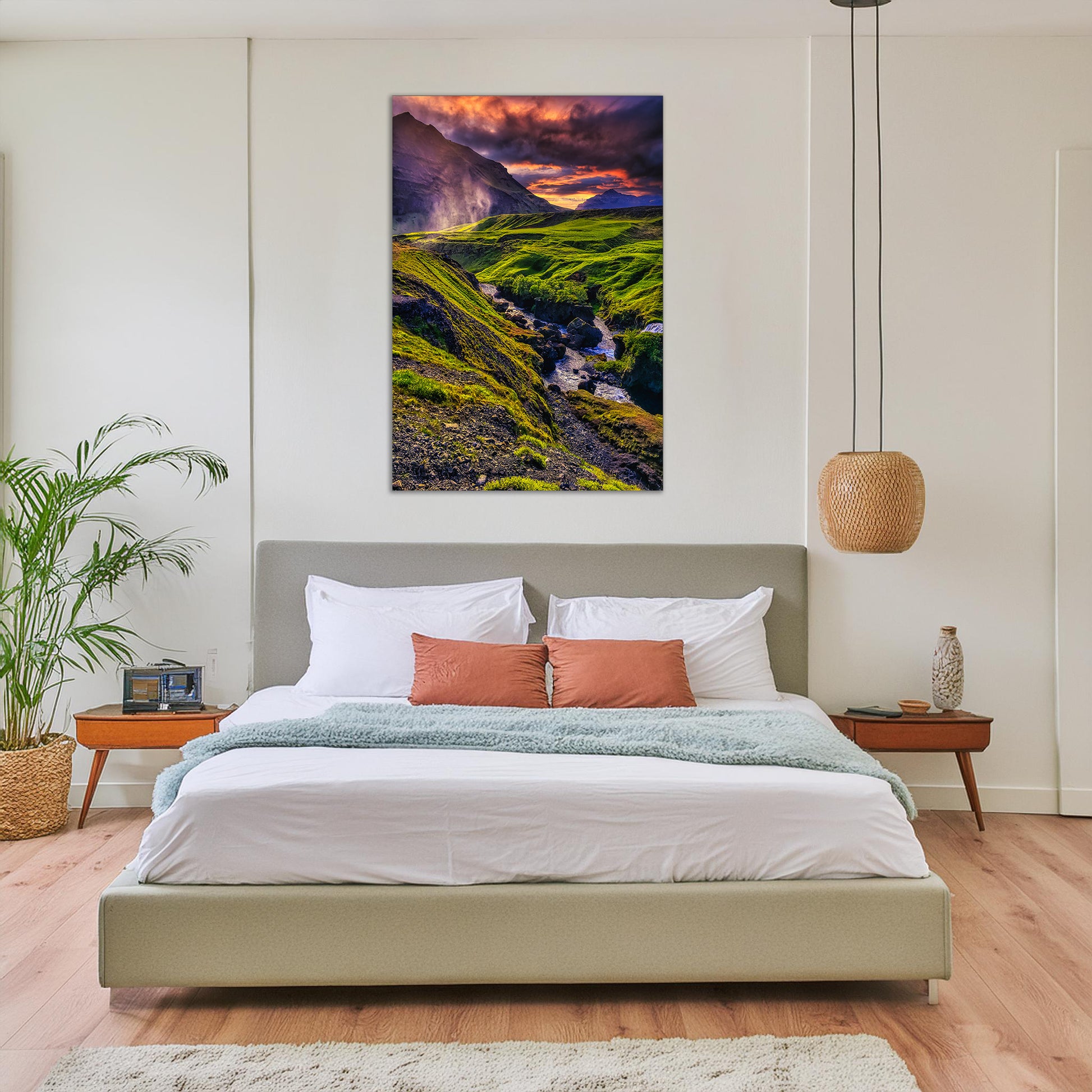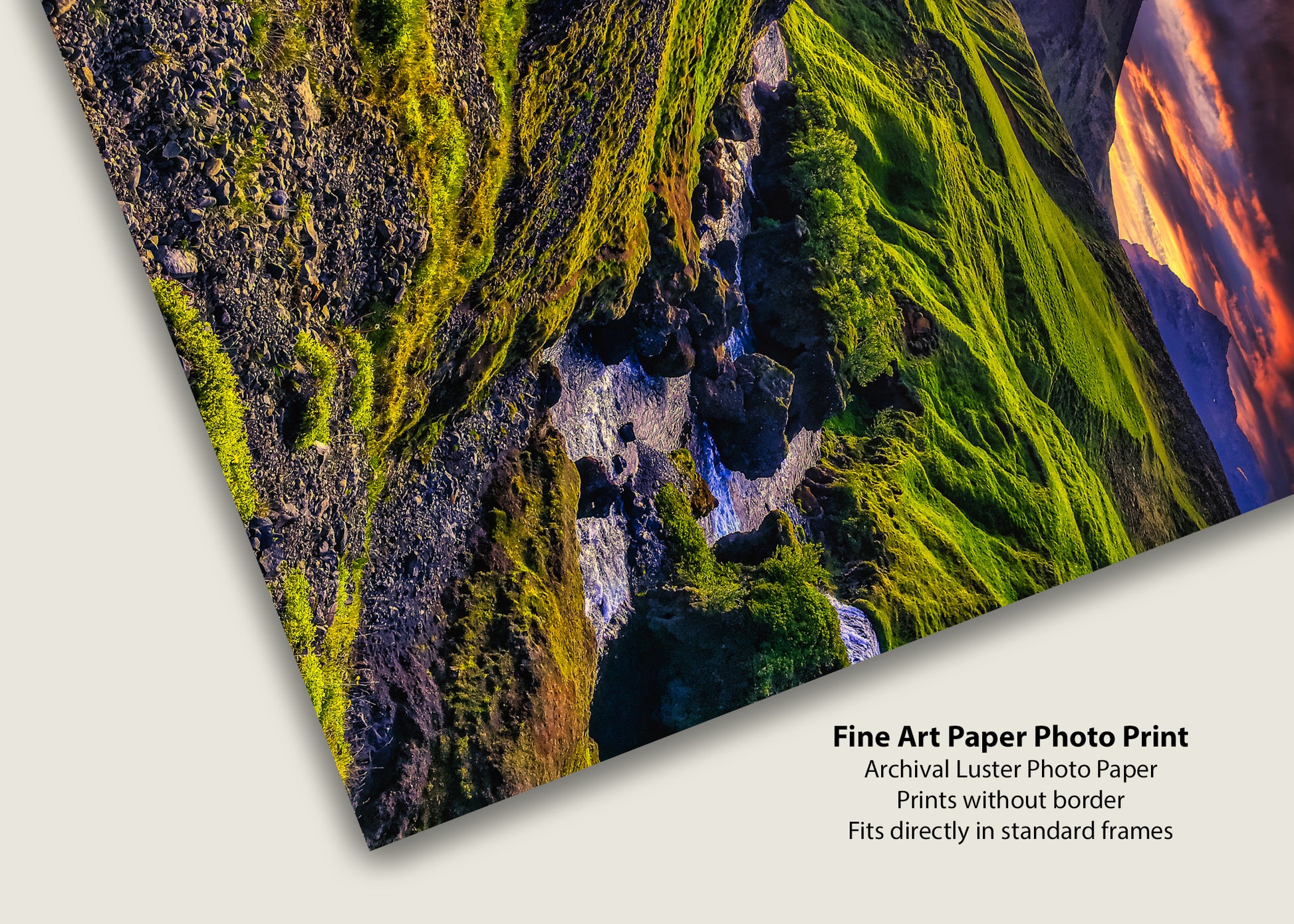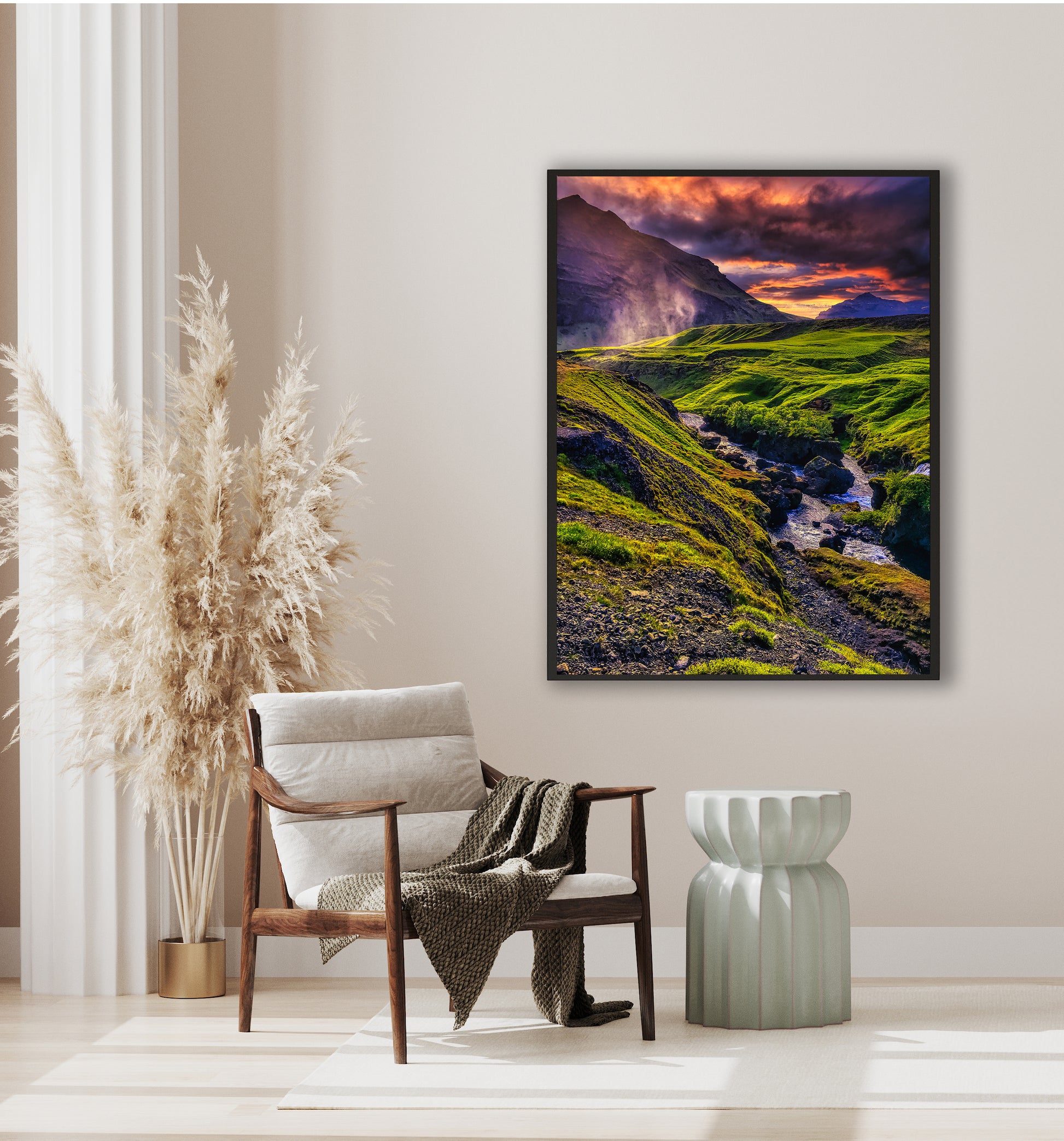 Atardecer en el río que desemboca en la famosa cascada Skógafoss. Aunque la mayoría de los visitantes se quedan al pie de la cascada, una buena subida por las escaleras hasta la cima revela el imponente paisaje islandés que alimenta las cataratas. El sinuoso río se adentra en las montañas, creando una vista tan hermosa como la propia cascada.