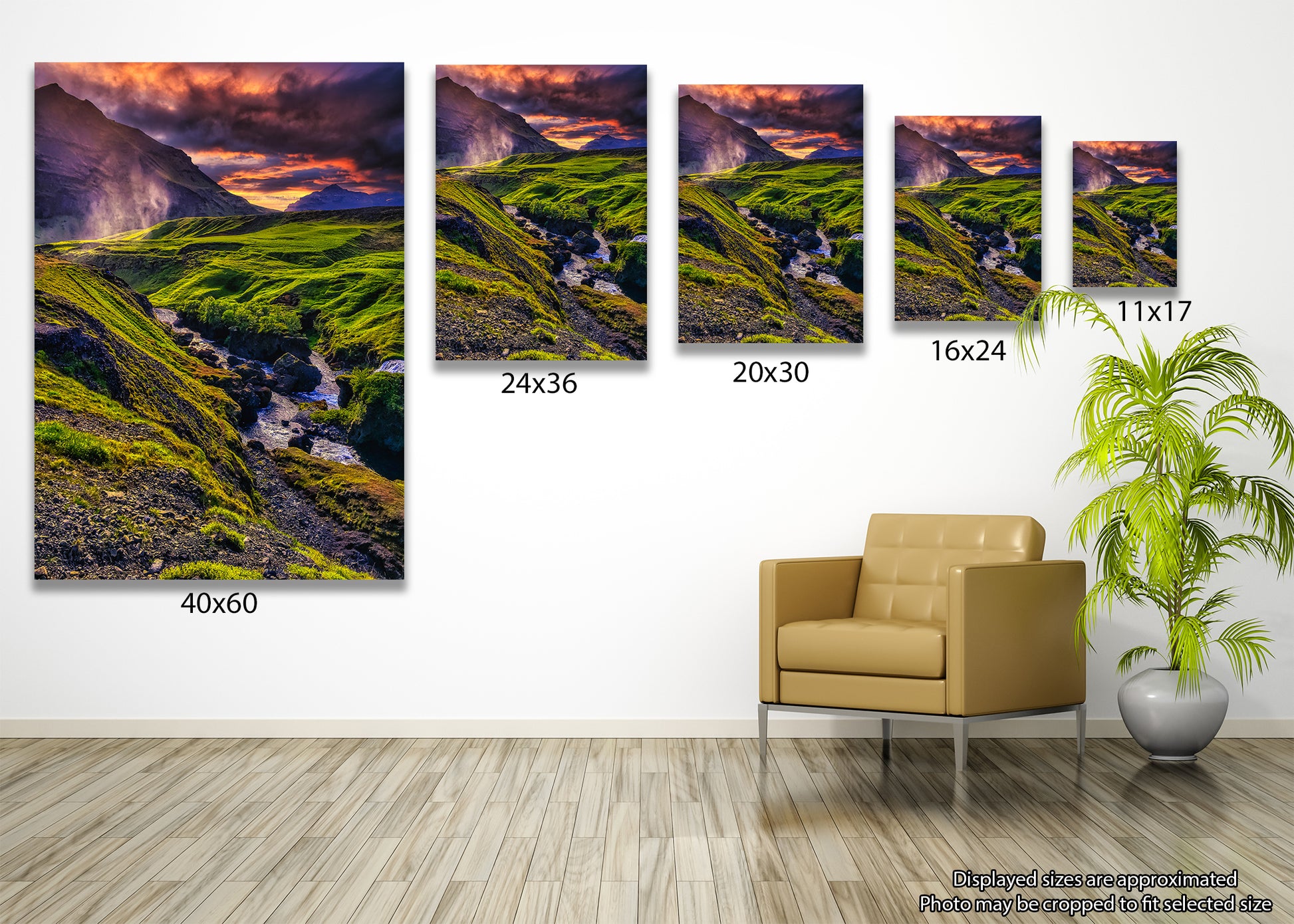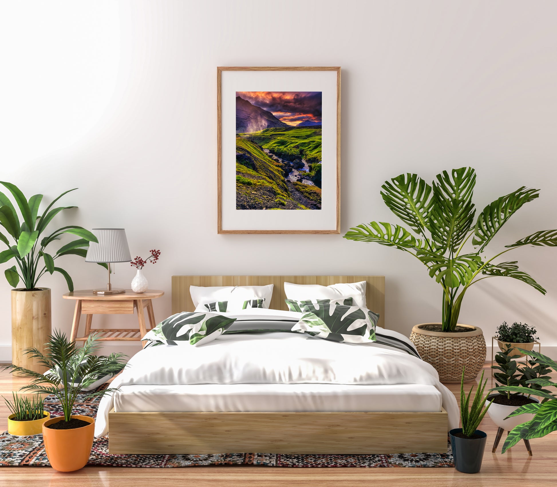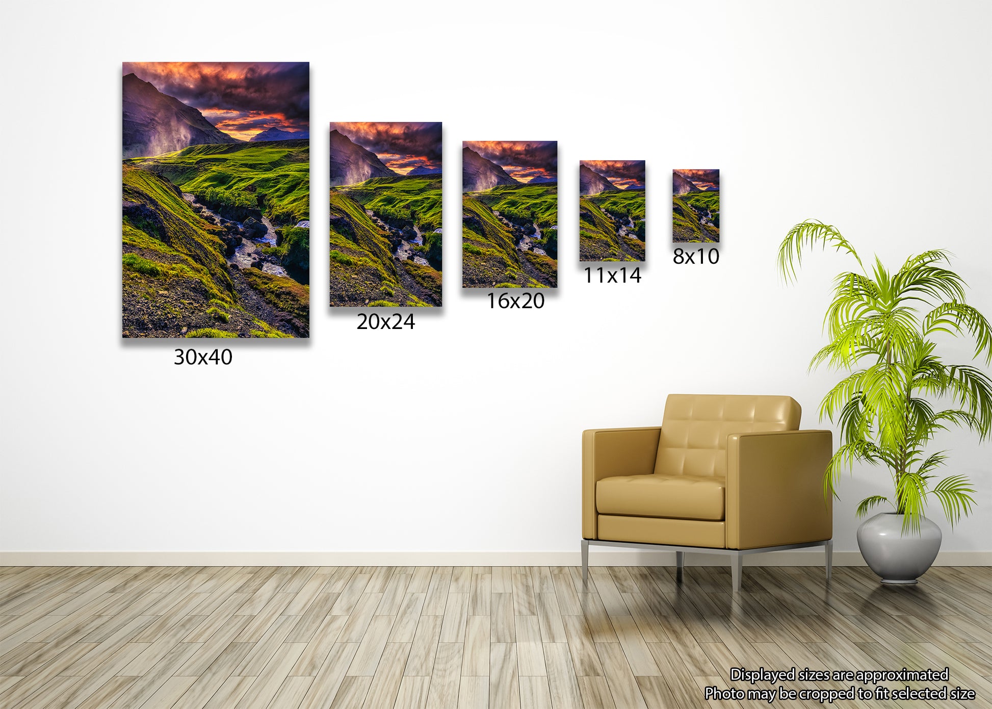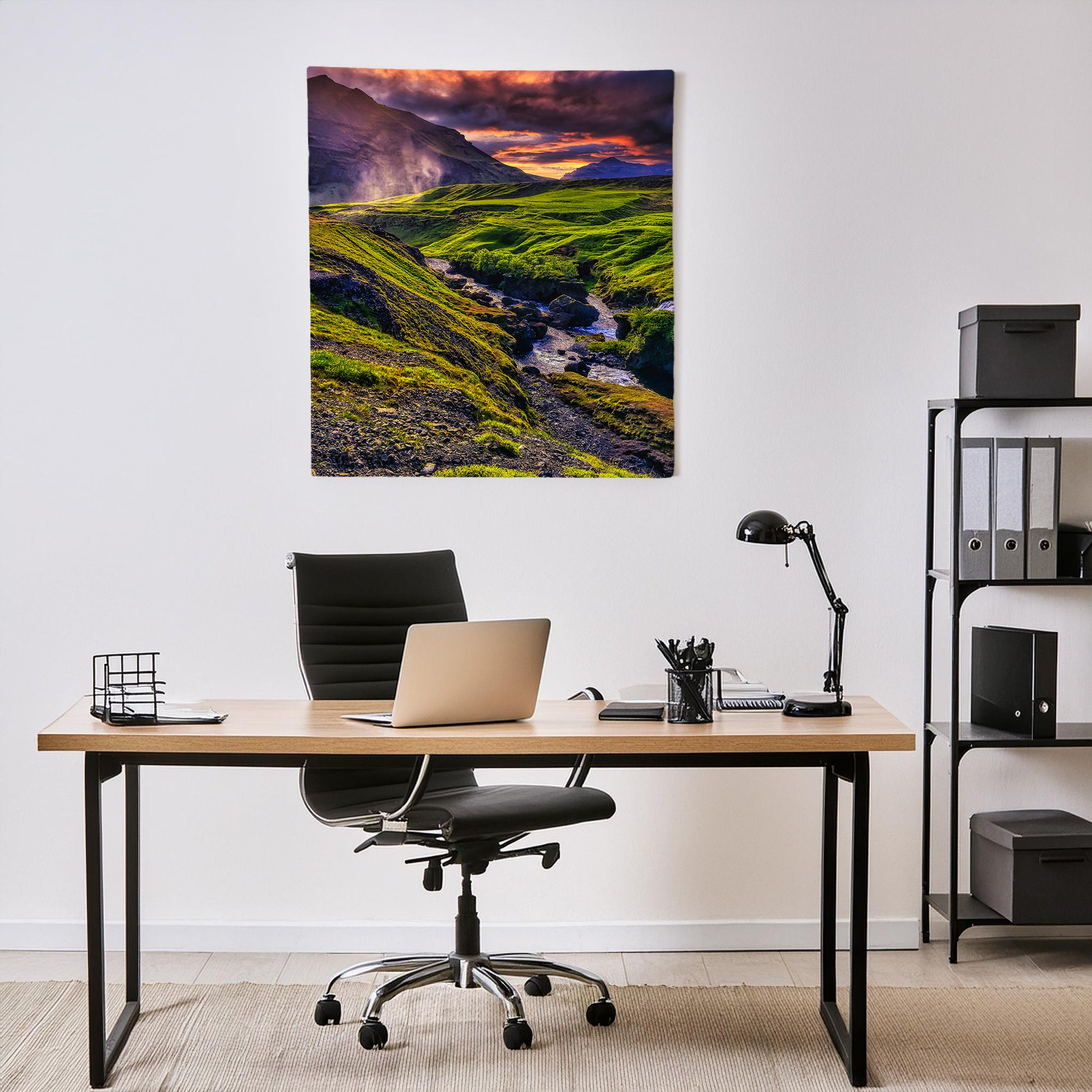 Atardecer en el río que desemboca en la famosa cascada Skógafoss. Aunque la mayoría de los visitantes se quedan al pie de la cascada, una buena subida por las escaleras hasta la cima revela el imponente paisaje islandés que alimenta las cataratas. El sinuoso río se adentra en las montañas, creando una vista tan hermosa como la propia cascada.