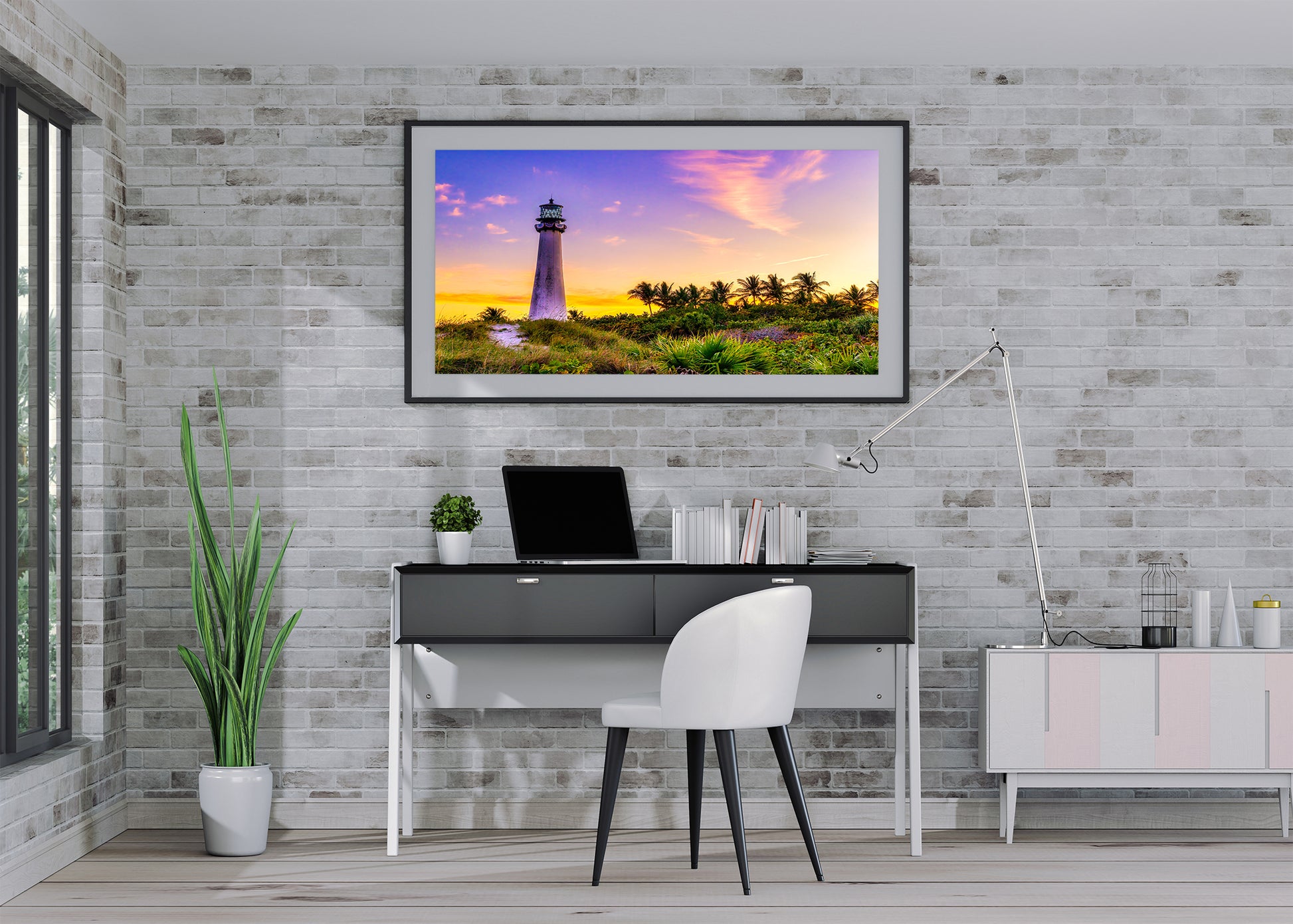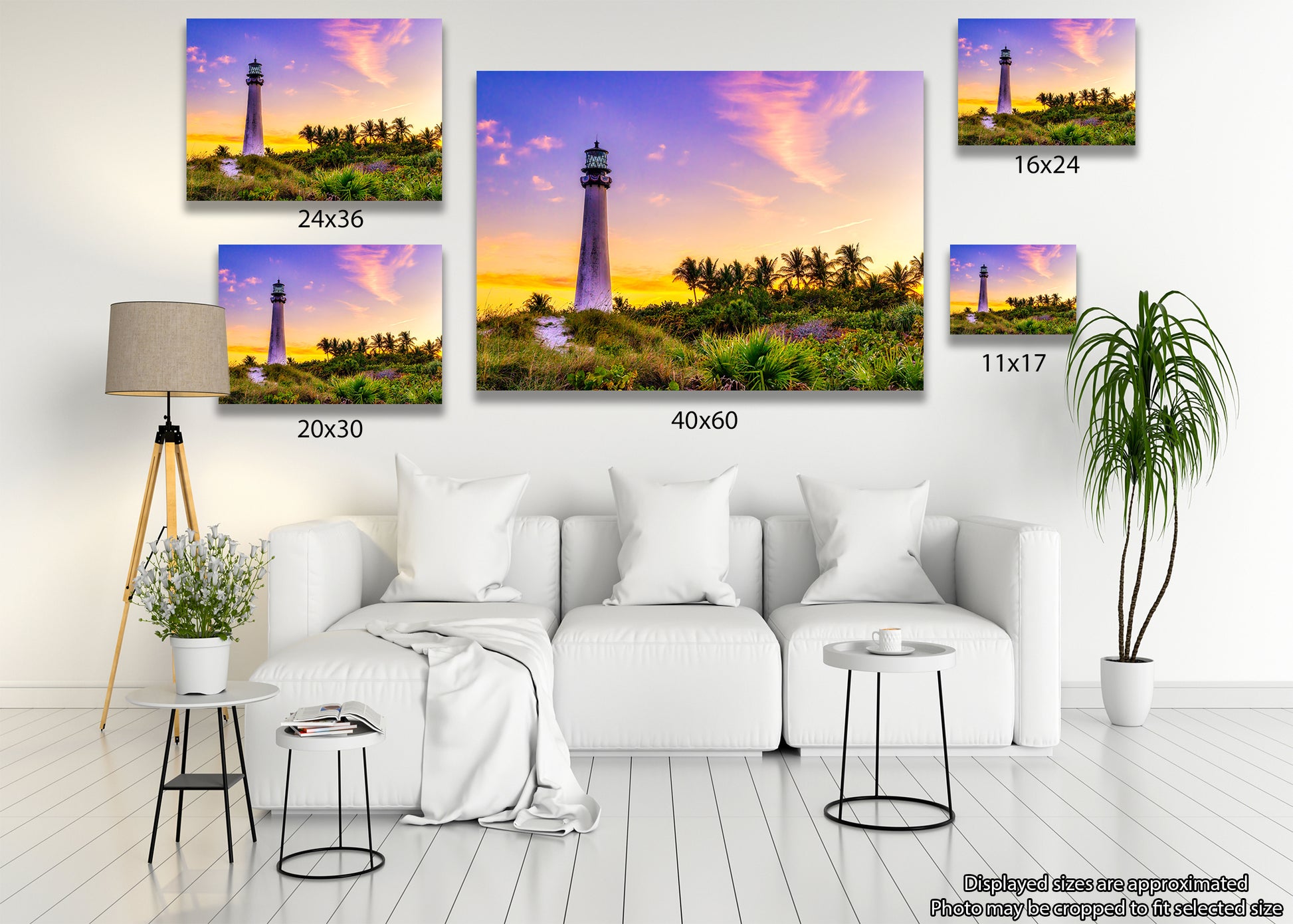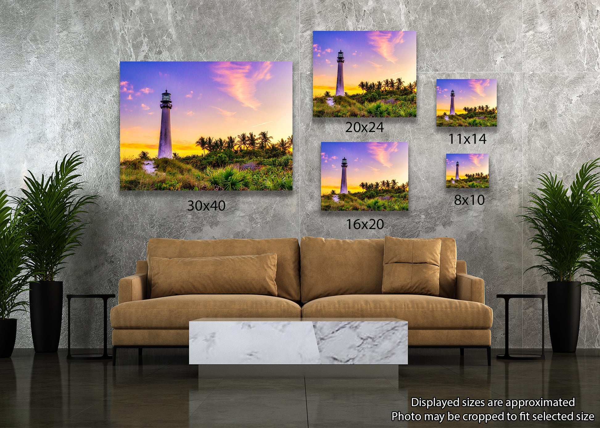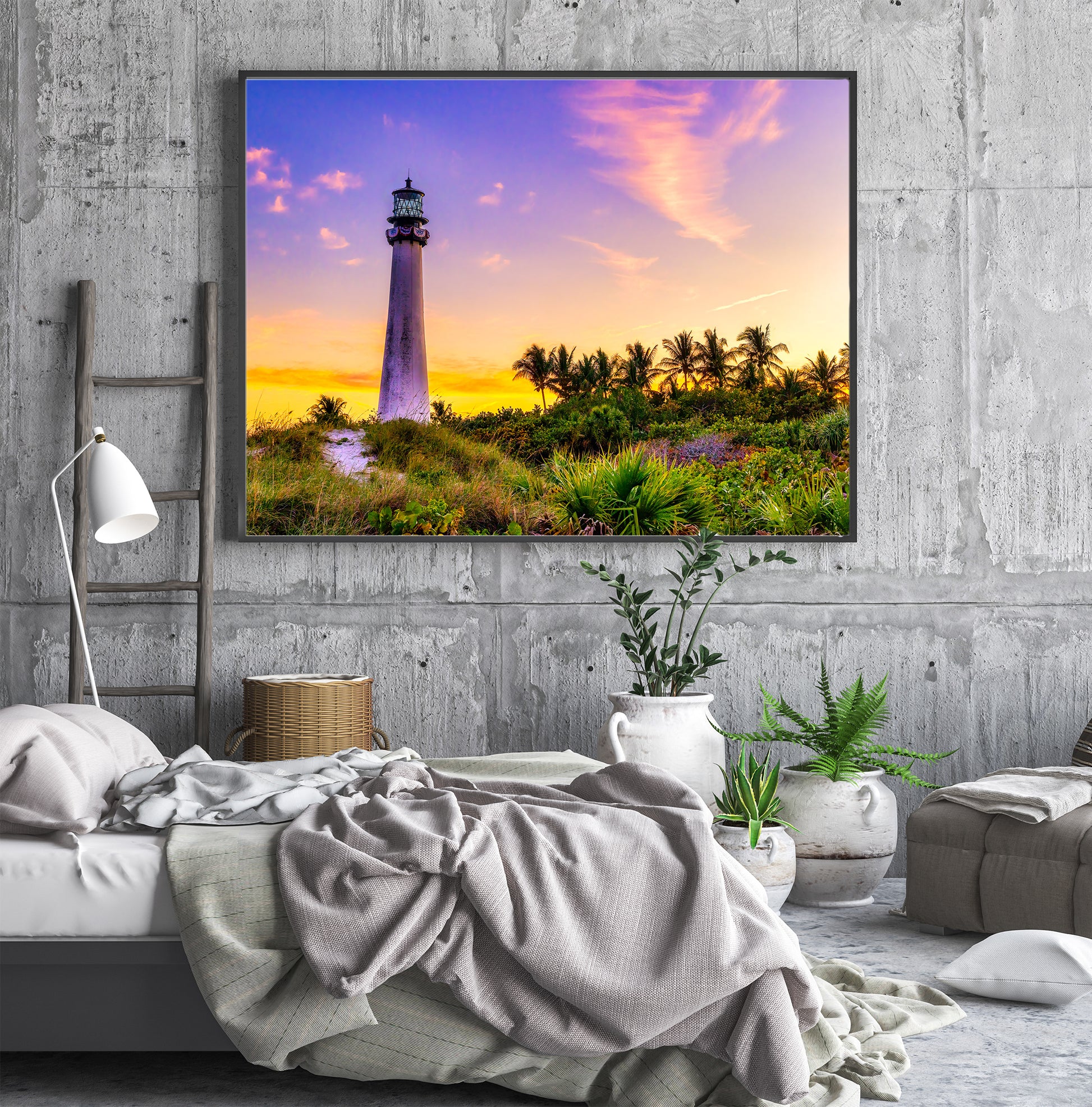 Perfecta para los amantes de los faros y la costa, esta imagen captura la magia del atardecer en la costa de Miami, Florida. Sus tonos cálidos y su silueta impactante la convierten en una pieza llamativa que aporta un toque de encanto costero a cualquier espacio.