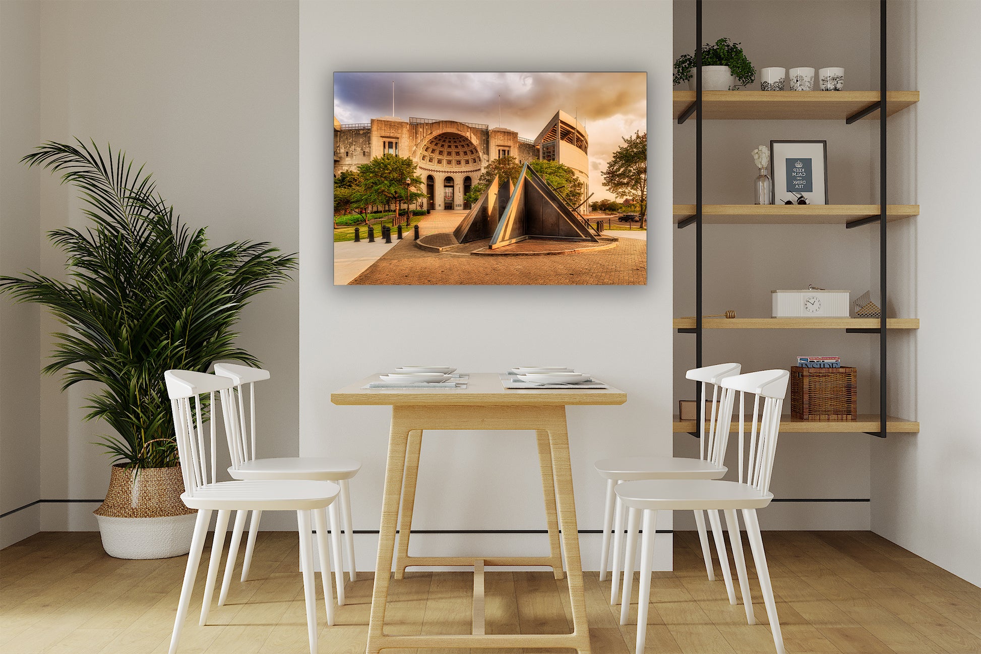 El lado norte del Estadio de Ohio resplandece bajo los cálidos tonos del atardecer, con la Rotonda y el monumento "Celebración para un Campeón" en primer plano. La luz dorada baña la arquitectura histórica, resaltando las curvas del estadio y los detalles del monumento, mientras el cielo se ilumina suavemente con el sol poniente. Esta perspectiva captura tanto el espíritu del fútbol americano de Ohio State como la belleza atemporal de los monumentos de su campus.