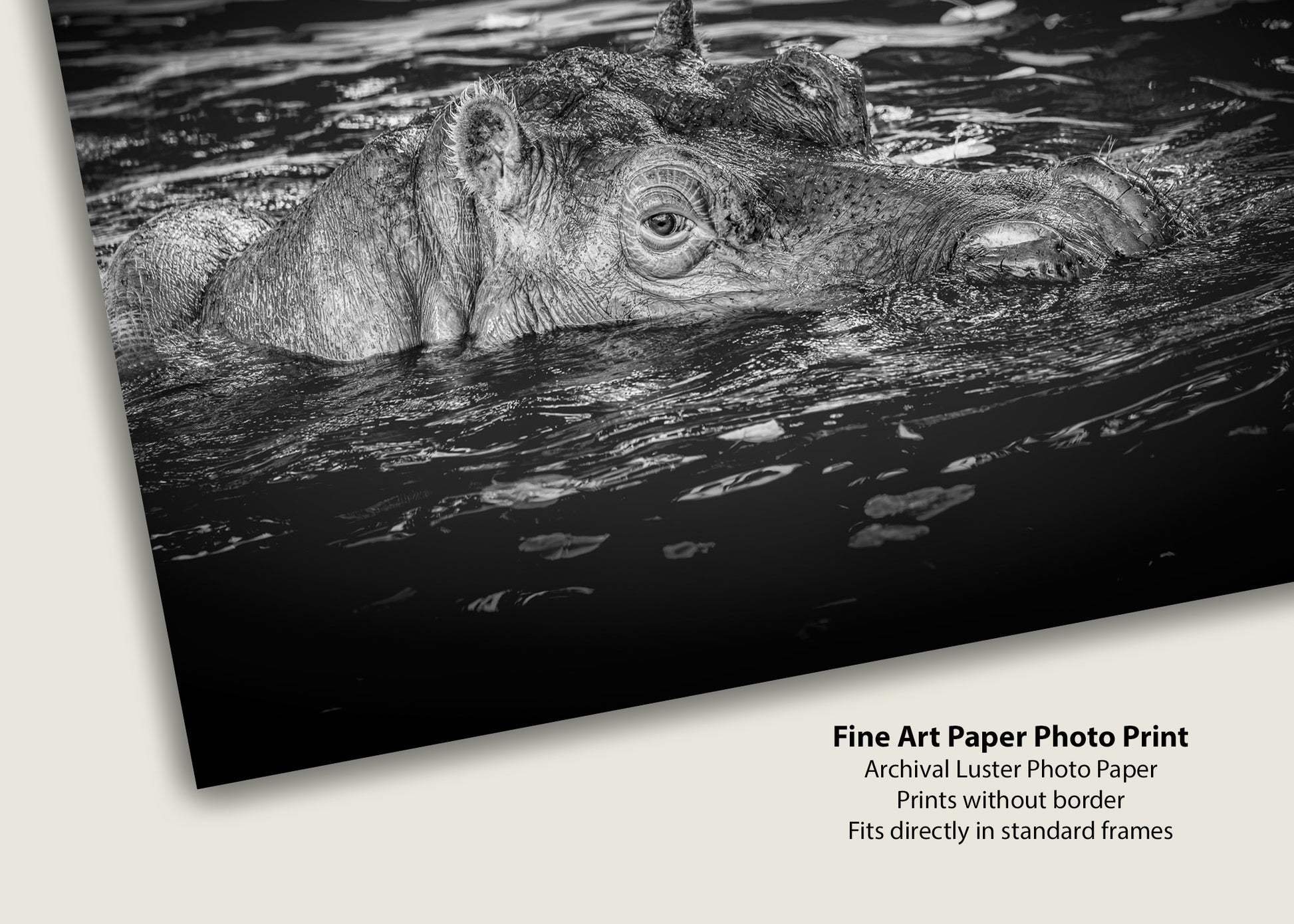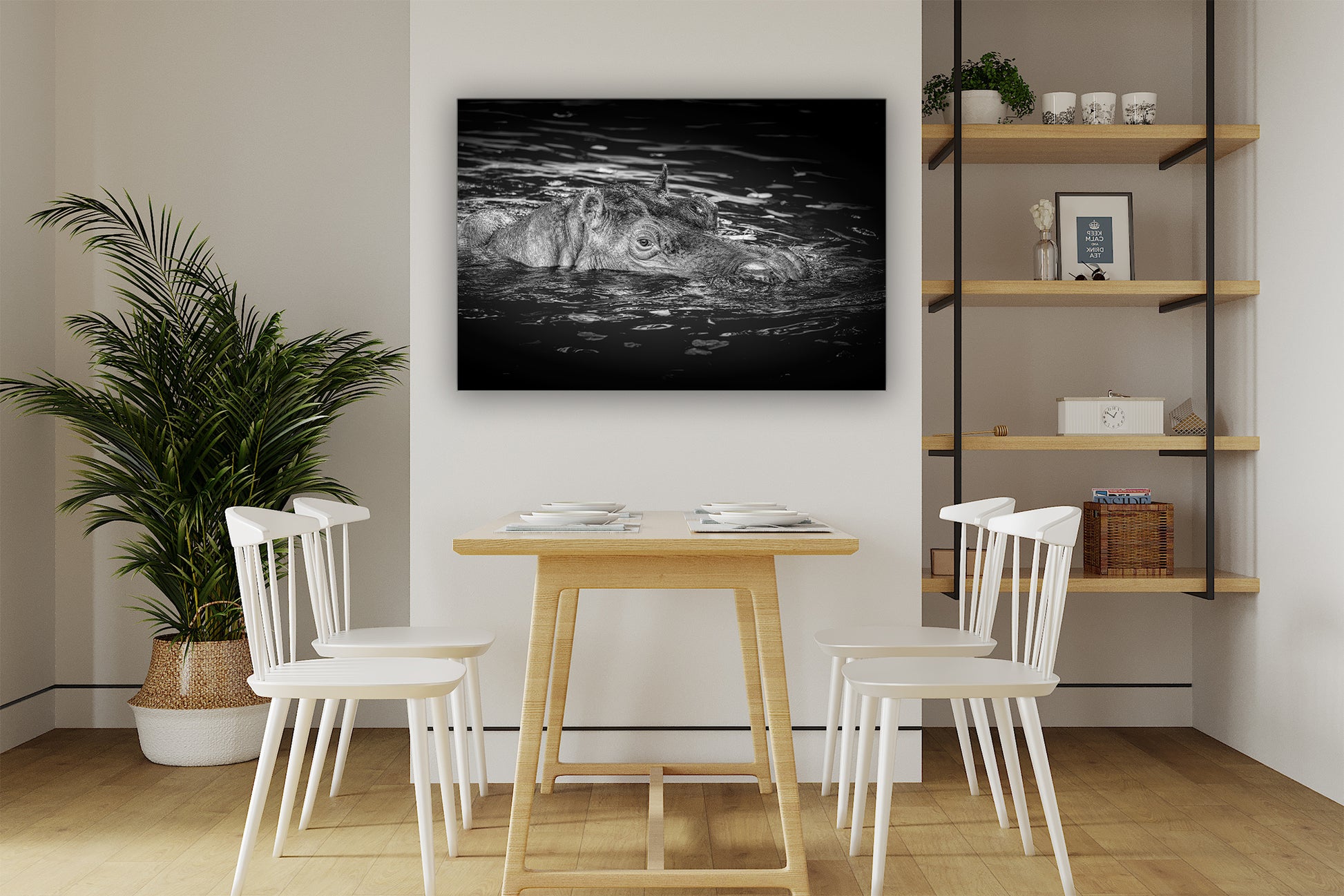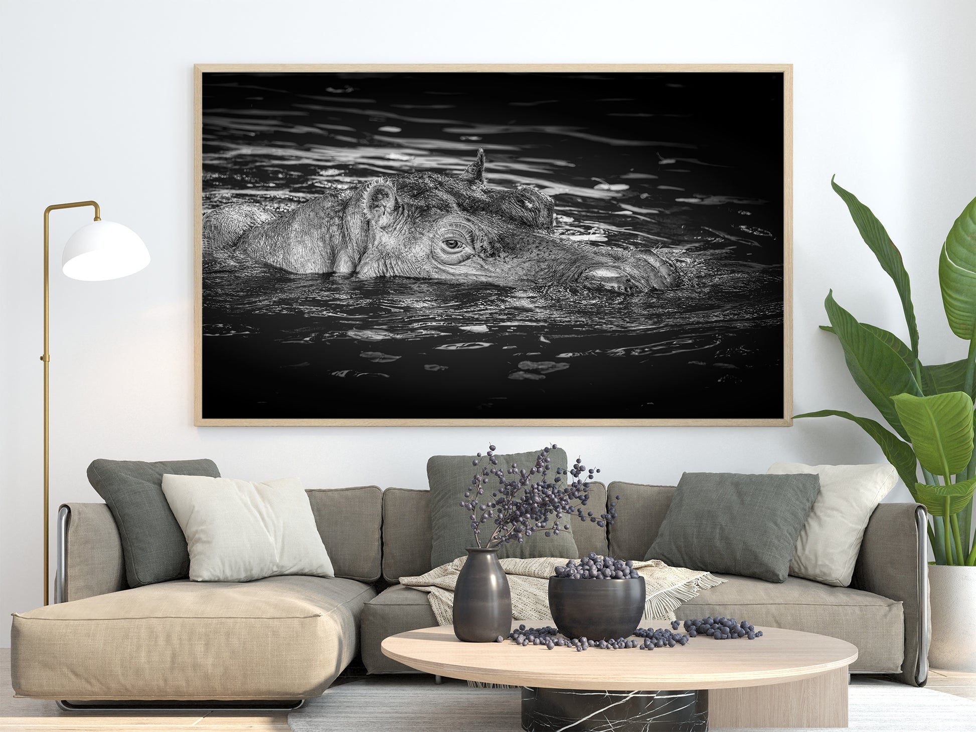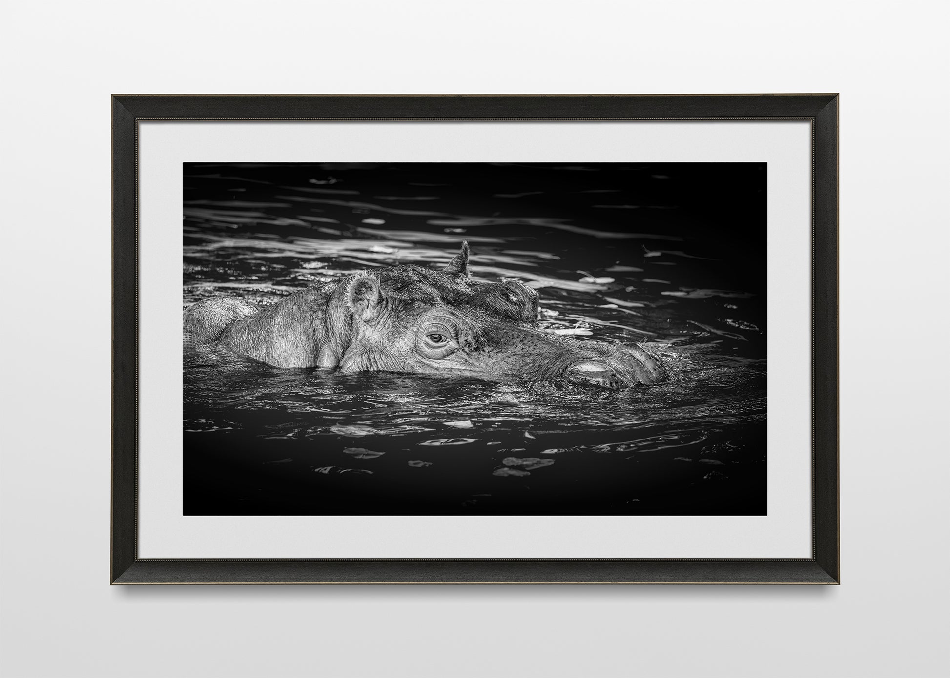 Este retrato en blanco y negro captura a un hipopótamo deslizándose silenciosamente por el agua, con solo la parte superior de su cabeza asomando a la superficie. Sutiles ondas reflejan la suave luz, realzando los poderosos rasgos del animal, mientras que la quietud del agua le confiere una atmósfera tranquila, casi misteriosa.