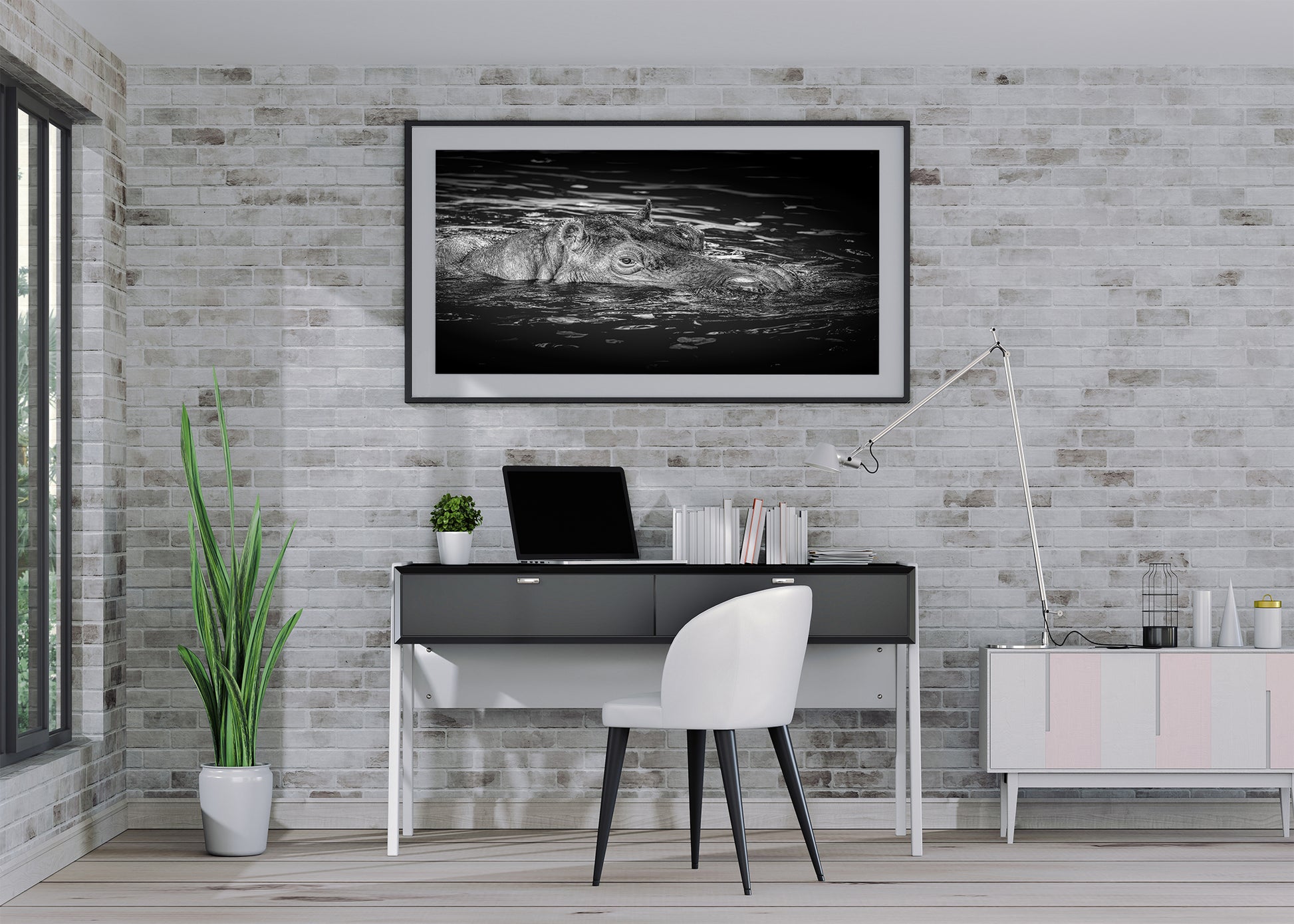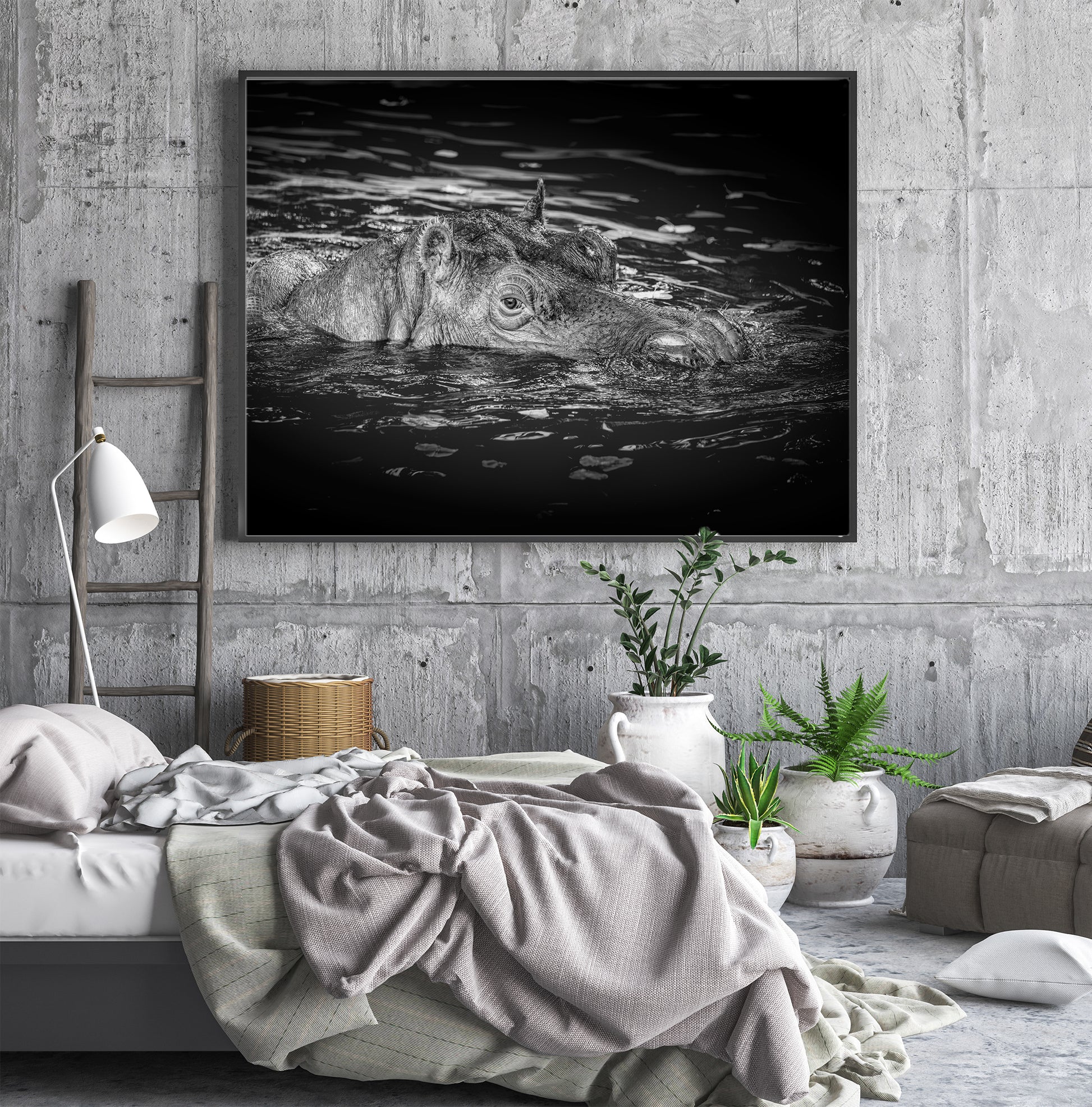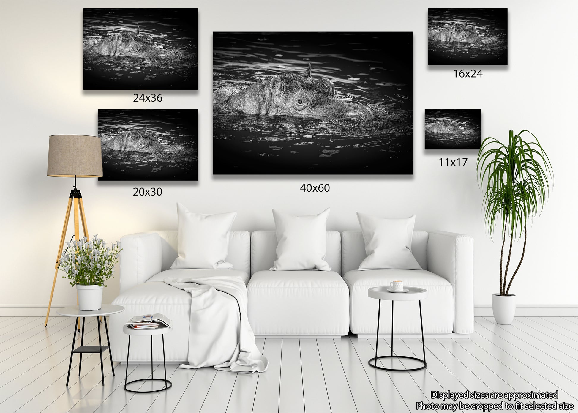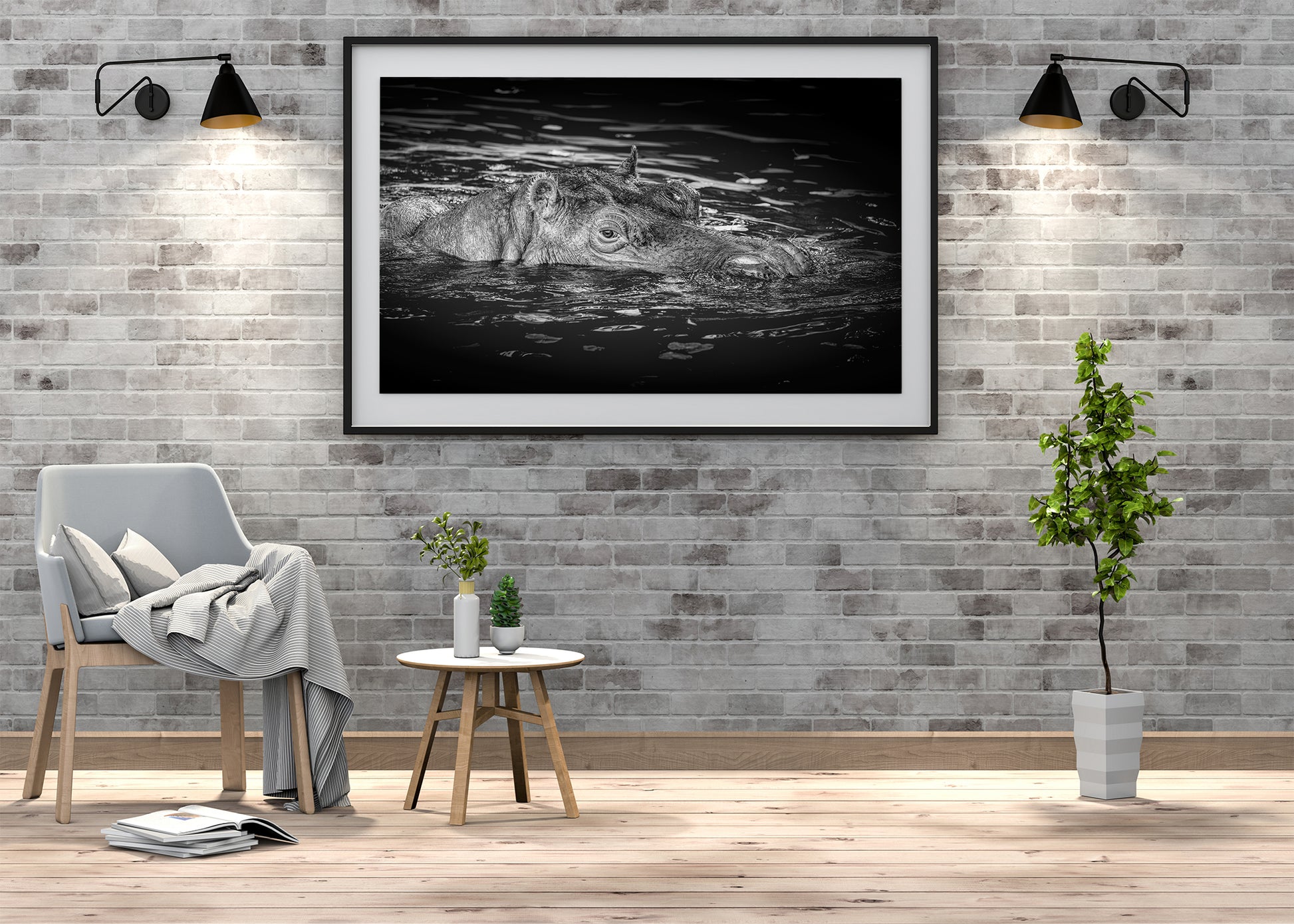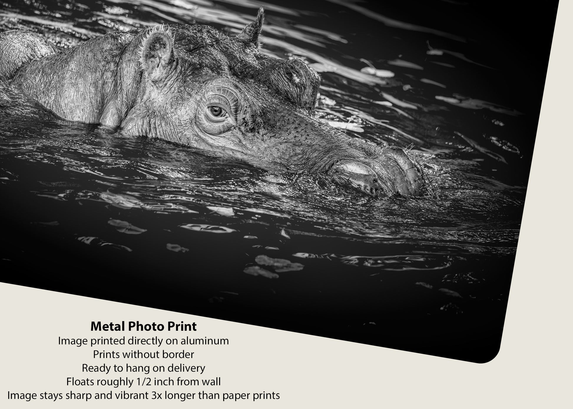 Este retrato en blanco y negro captura a un hipopótamo deslizándose silenciosamente por el agua, con solo la parte superior de su cabeza asomando a la superficie. Sutiles ondas reflejan la suave luz, realzando los poderosos rasgos del animal, mientras que la quietud del agua le confiere una atmósfera tranquila, casi misteriosa.
