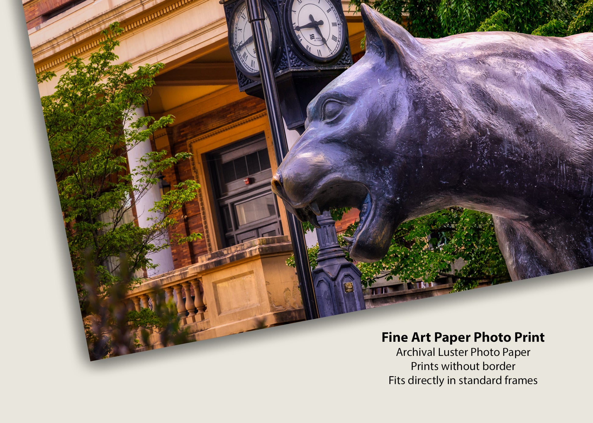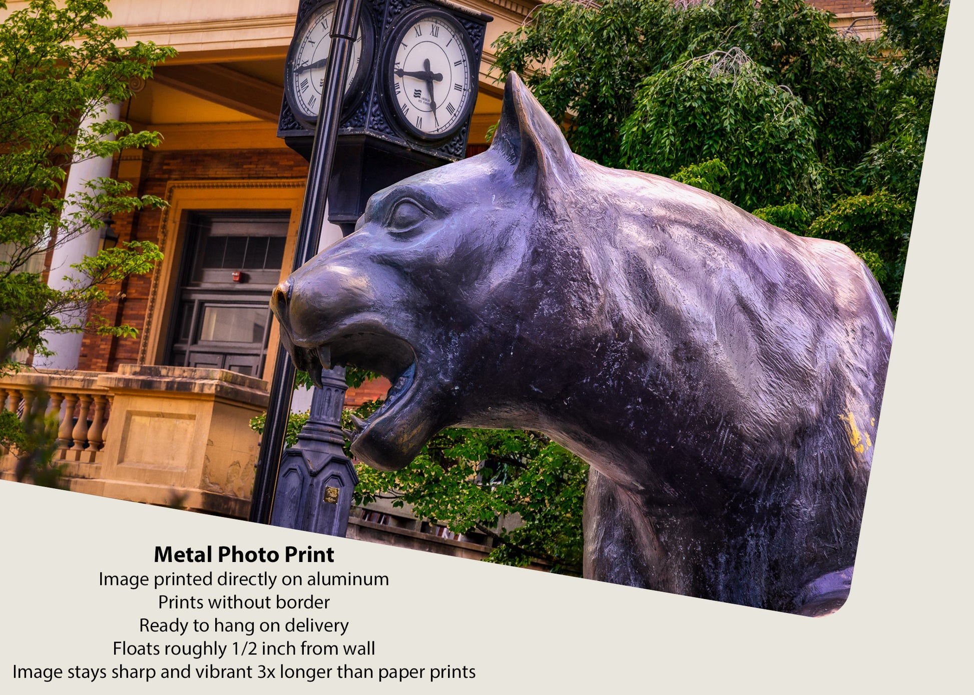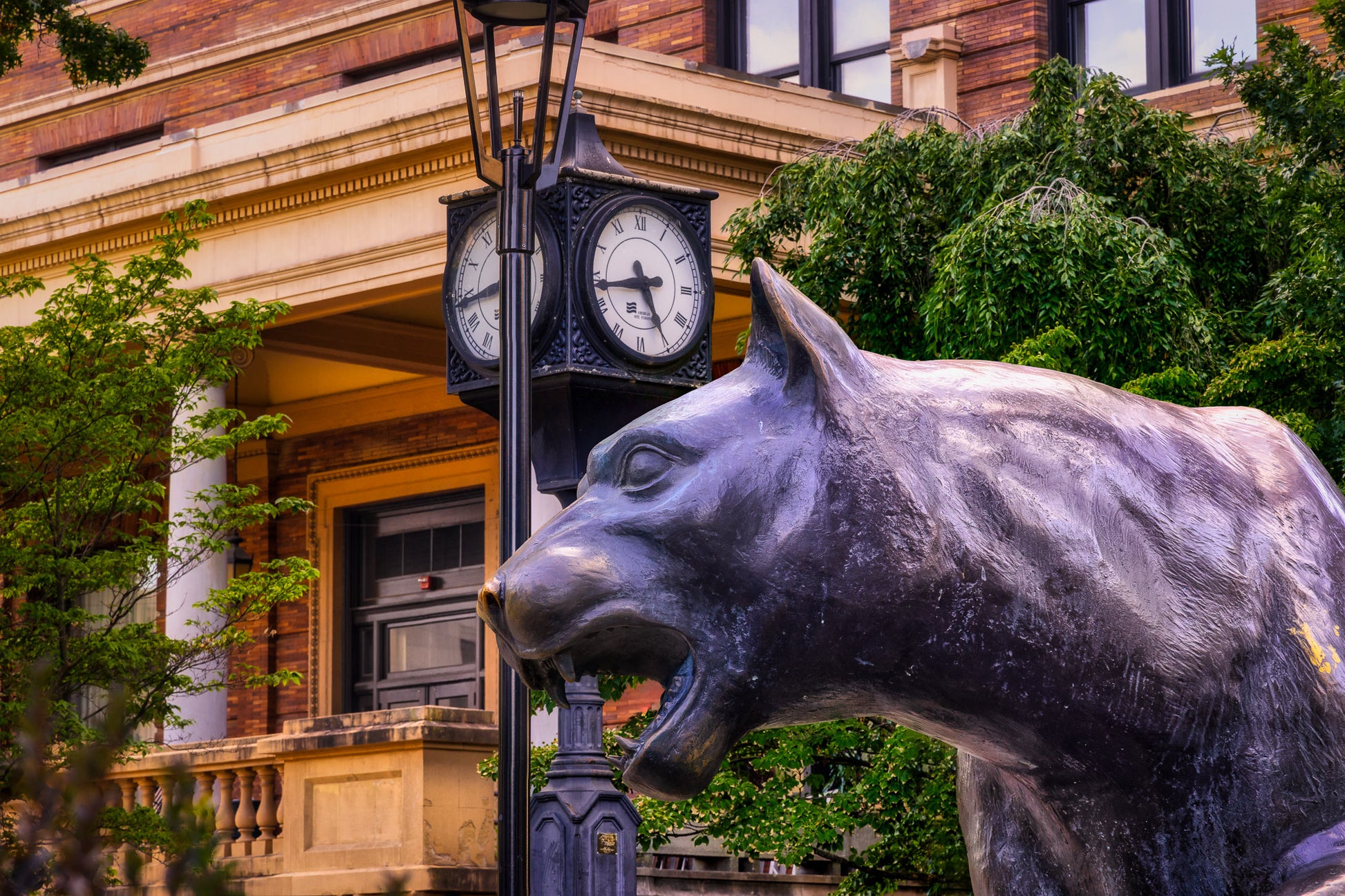 Esta fotografía destaca la cabeza de la estatua de la Pantera de Pitt, ubicada prominentemente frente a un reloj clásico del campus. Los marcados rasgos de la pantera se enmarcan con nítidos detalles, mientras que la esfera del reloj que la respalda añade profundidad y un aire de tradición. La suave luz natural aporta equilibrio a la escena, combinando el orgullo universitario con un carácter atemporal.