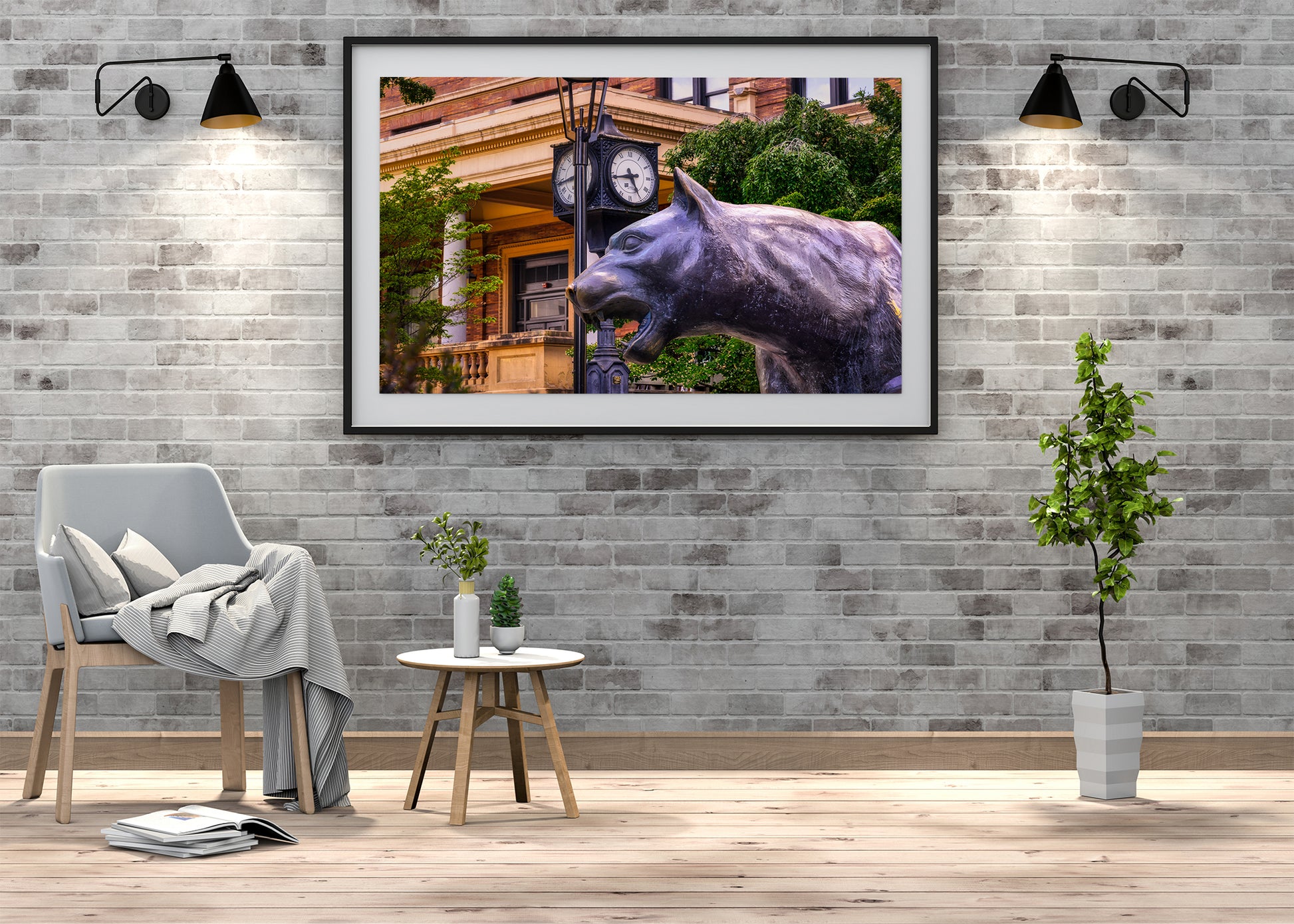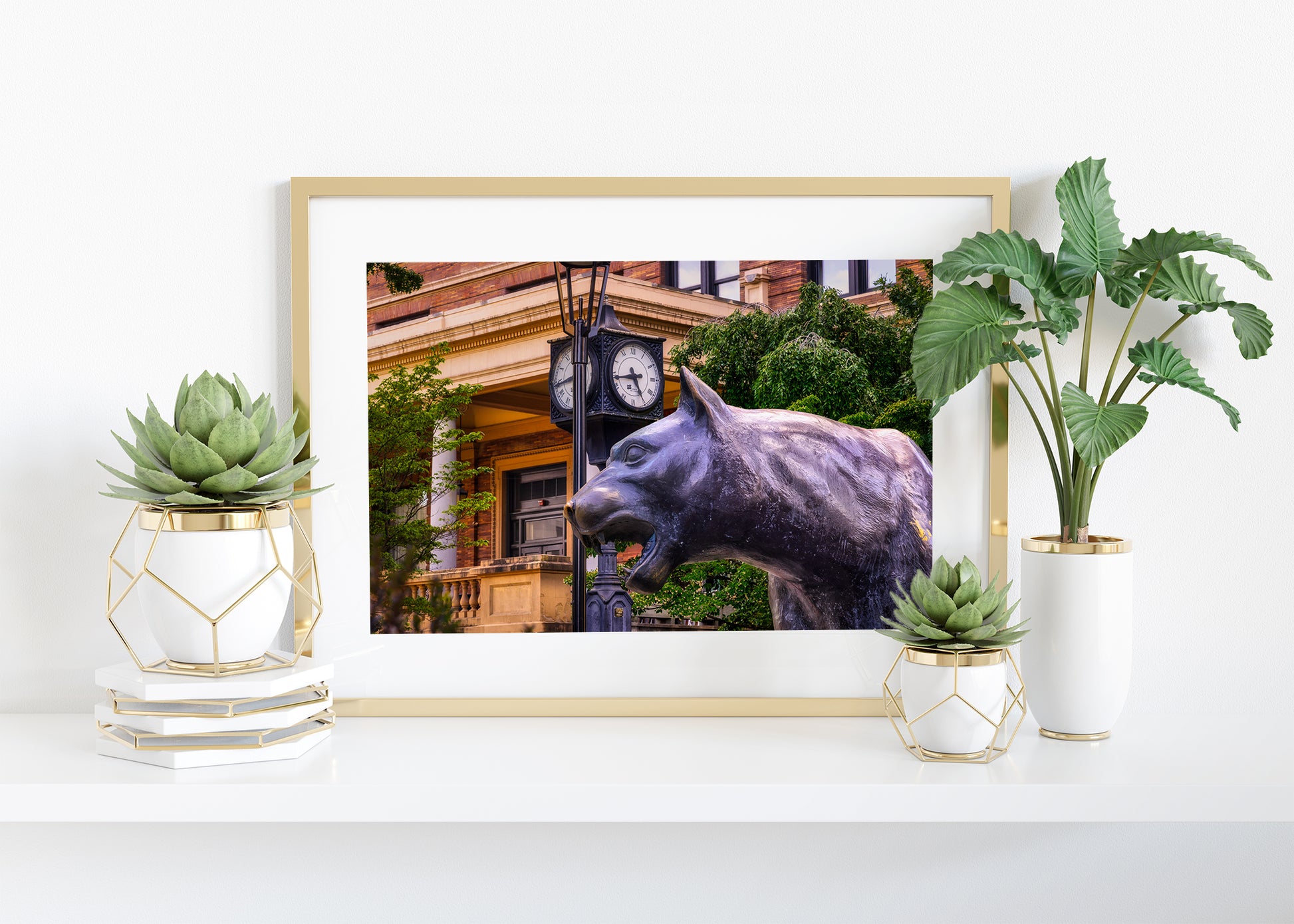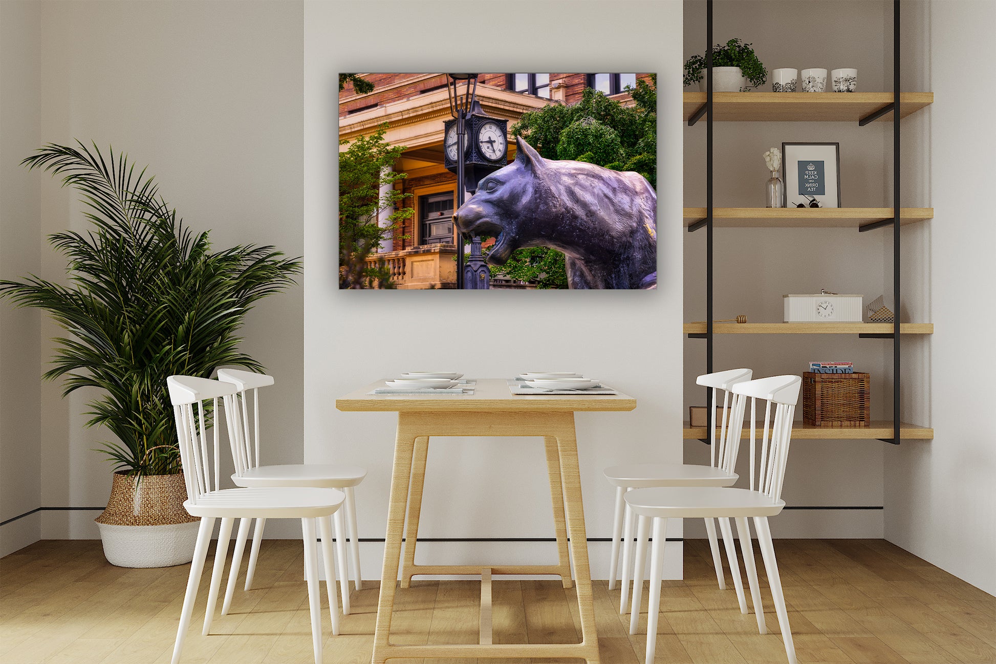 Esta fotografía destaca la cabeza de la estatua de la Pantera de Pitt, ubicada prominentemente frente a un reloj clásico del campus. Los marcados rasgos de la pantera se enmarcan con nítidos detalles, mientras que la esfera del reloj que la respalda añade profundidad y un aire de tradición. La suave luz natural aporta equilibrio a la escena, combinando el orgullo universitario con un carácter atemporal.