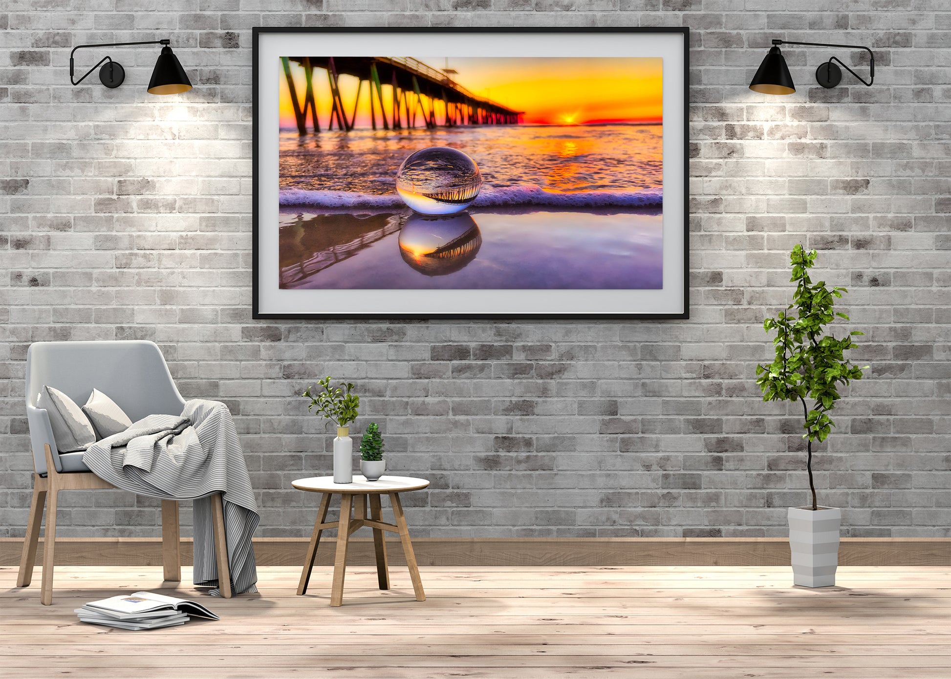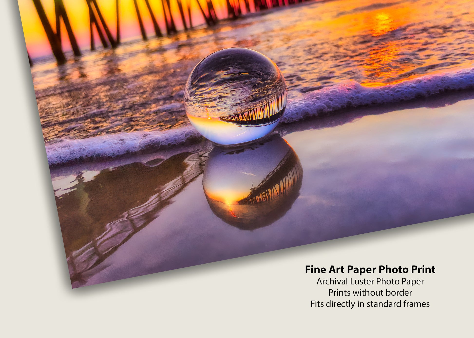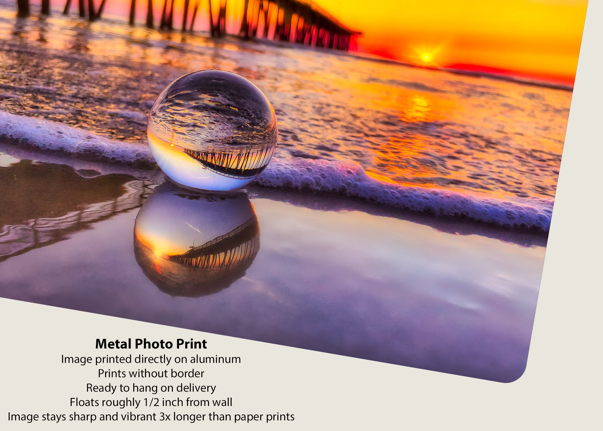 Al amanecer en Virginia Beach, una lente de bola captura el icónico muelle pesquero en una miniatura perfecta, su reflejo brilla con los cálidos colores del amanecer. Descansando suavemente sobre la arena mojada, la lente de bola se refleja en las aguas poco profundas que se encuentran debajo, creando un reflejo en capas que fusiona realidad y arte. Los tonos naranja y dorado del amanecer crean un fondo radiante, creando una perspectiva costera verdaderamente única.