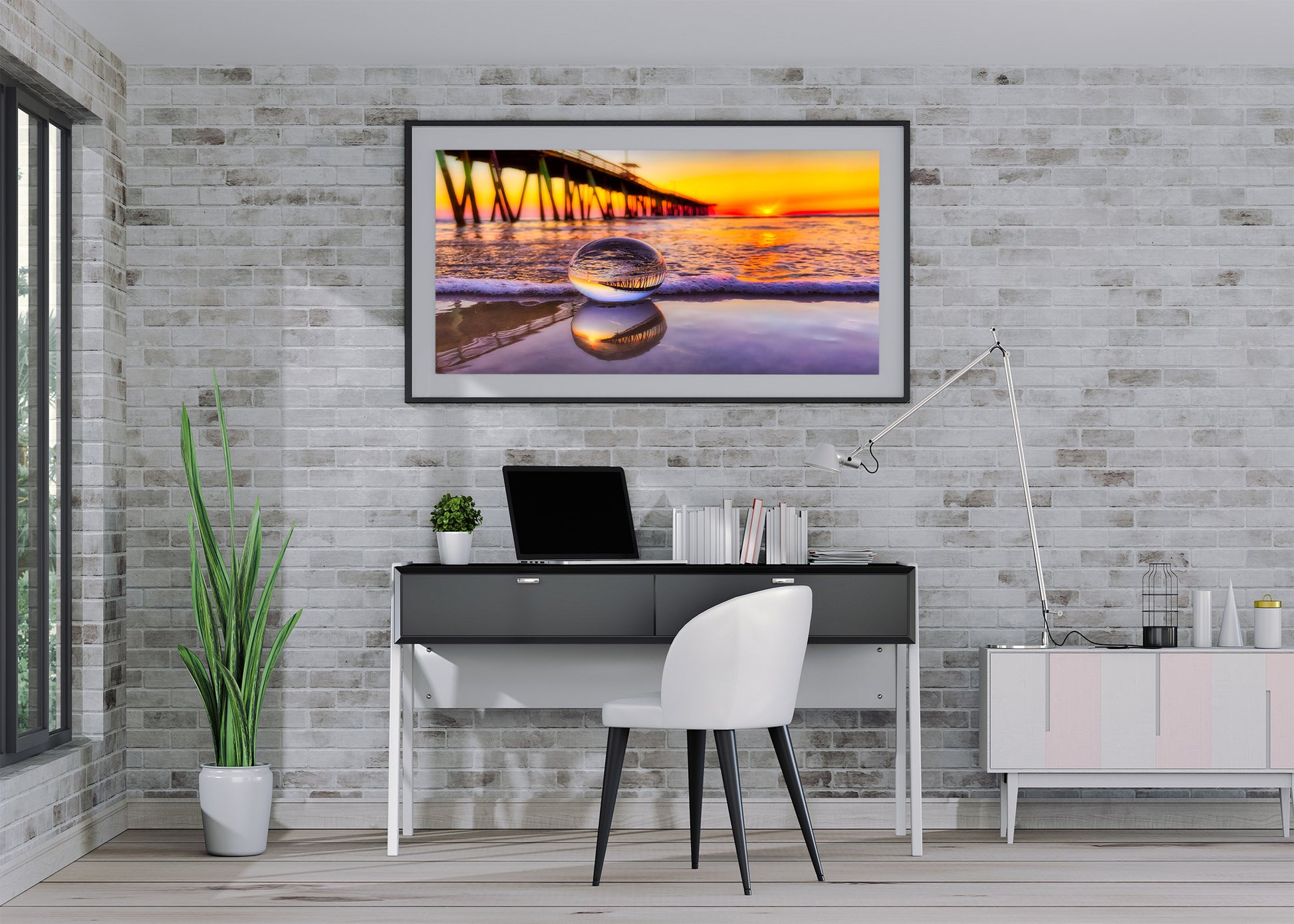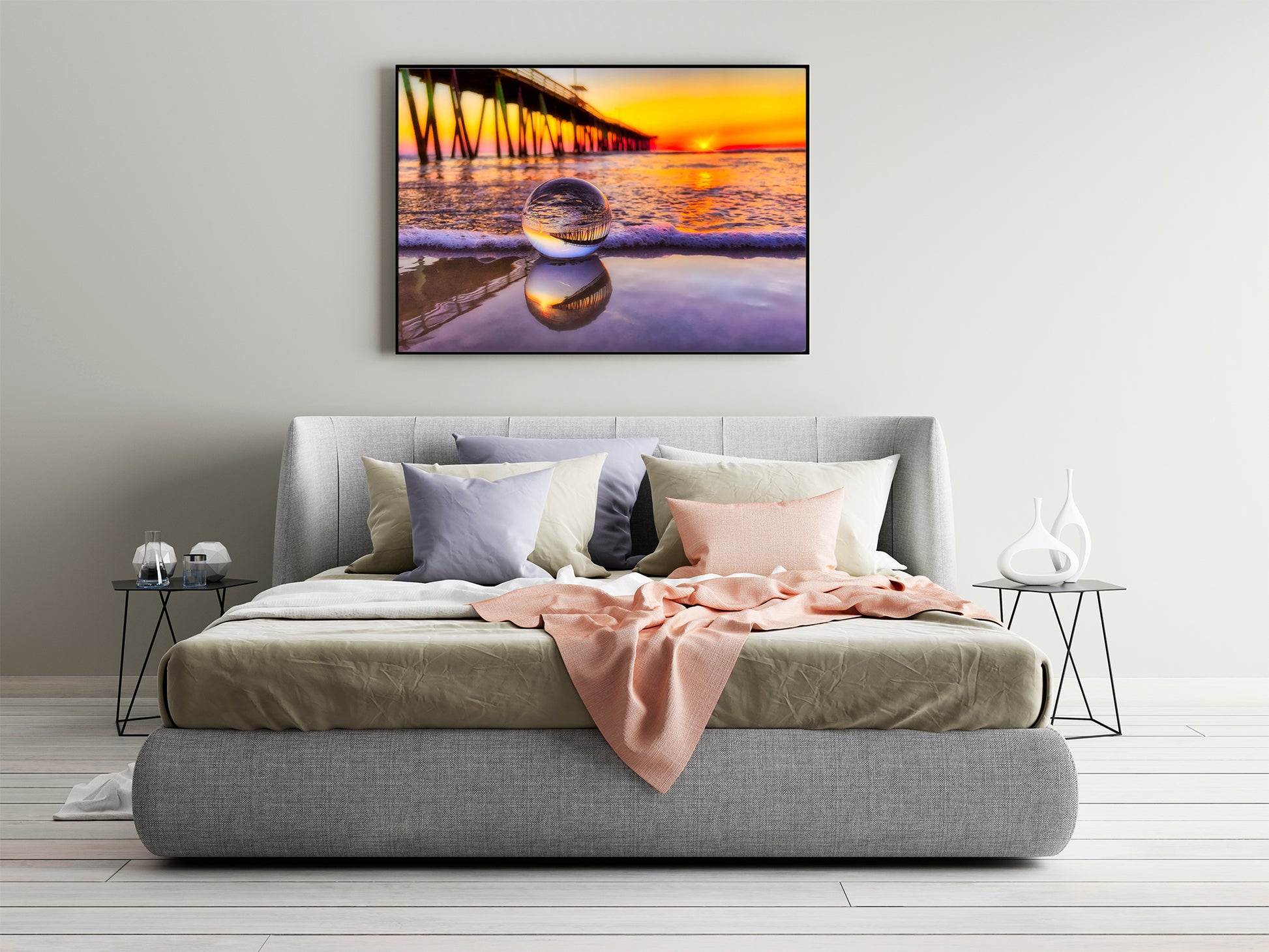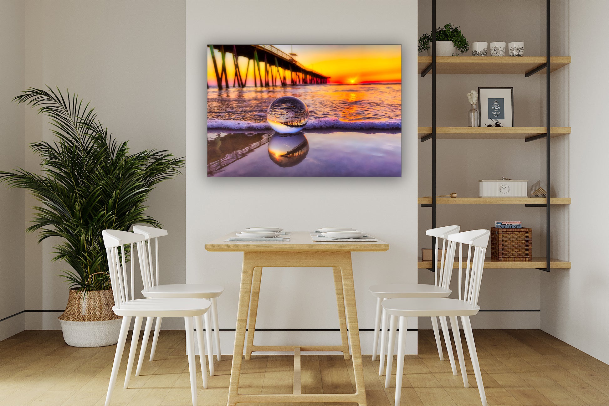 Al amanecer en Virginia Beach, una lente de bola captura el icónico muelle pesquero en una miniatura perfecta, su reflejo brilla con los cálidos colores del amanecer. Descansando suavemente sobre la arena mojada, la lente de bola se refleja en las aguas poco profundas que se encuentran debajo, creando un reflejo en capas que fusiona realidad y arte. Los tonos naranja y dorado del amanecer crean un fondo radiante, creando una perspectiva costera verdaderamente única.