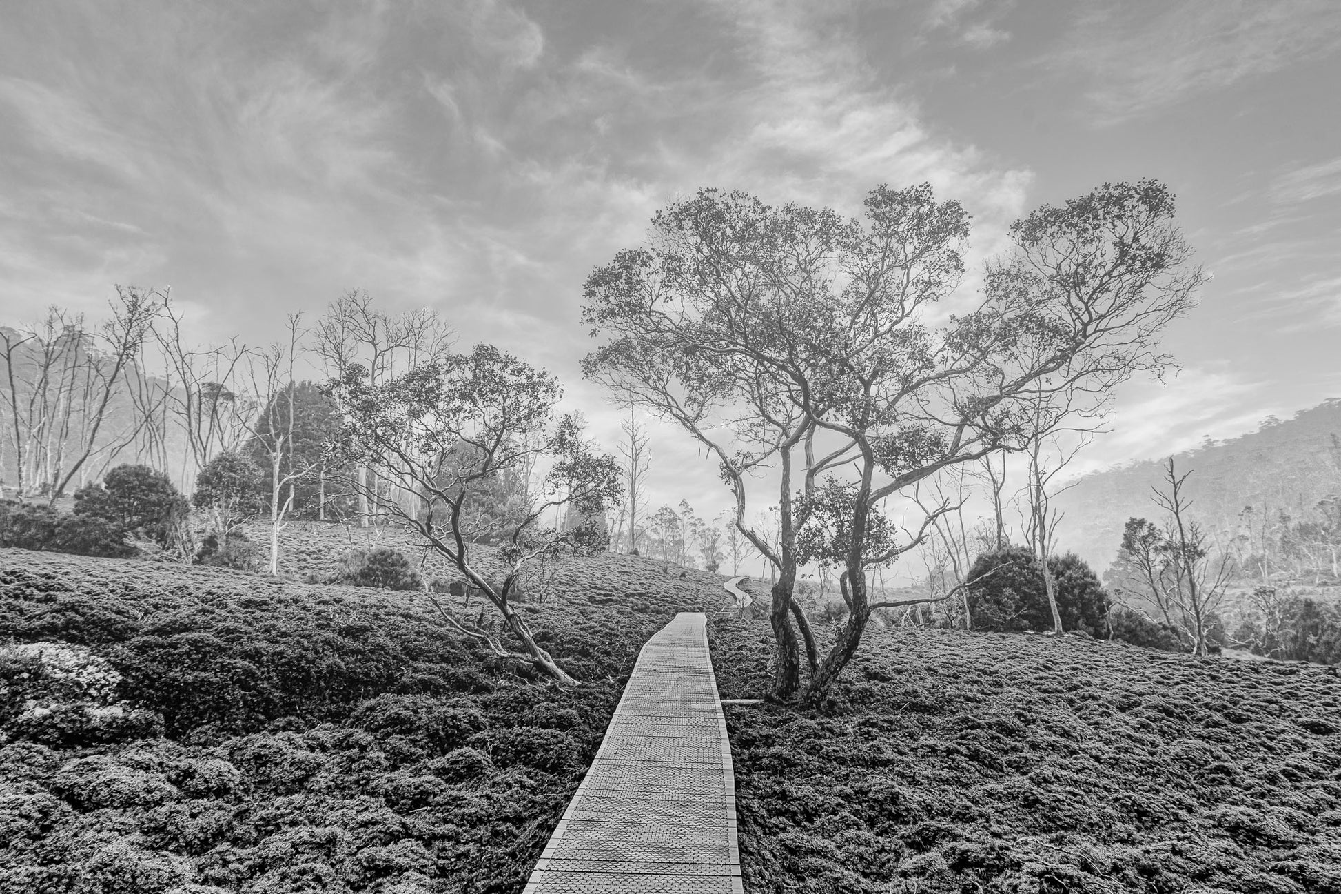 No hay nada mejor en unas vacaciones de julio que el frío y la nieve, supongo. Como antiguos residentes de Florida, siempre es raro que el frío se agrave al mudarse al sur, pero así es el hemisferio sur. Tasmania es el lugar más meridional, pero los increíbles paisajes compensan el frío. El cielo nublado creó el ambiente perfecto para practicar senderismo en la montaña. Foto disponible en color y en blanco y negro.