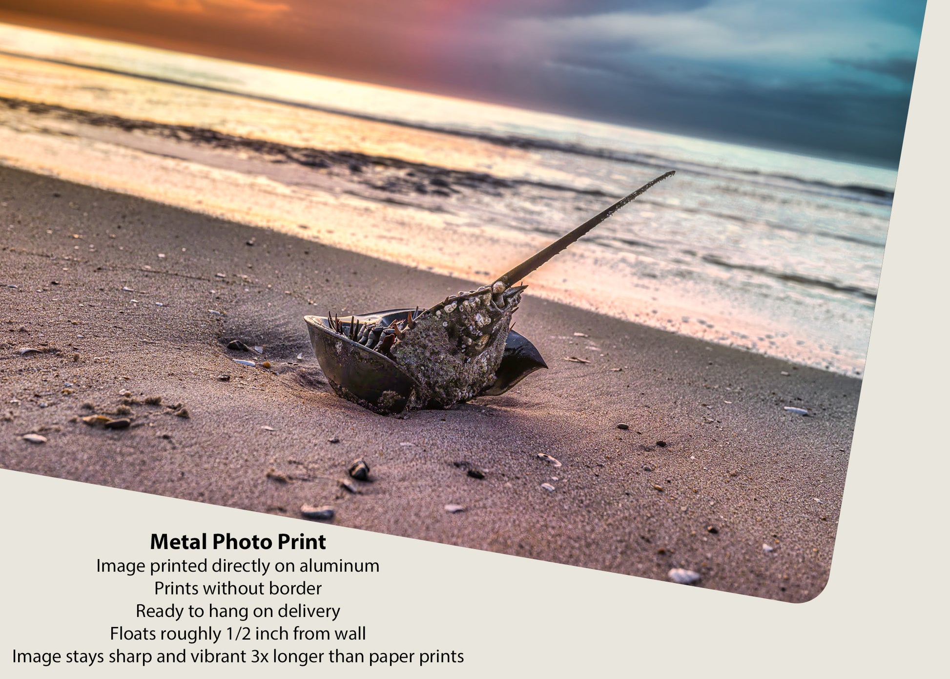 An upside-down horseshoe crab rests on the sand in Ocean City, Maryland as the sky above erupts in dramatic red and blue tones. The creature’s curved shell and delicate legs are illuminated by the rising sun, creating a striking contrast between the calm of the beach and the intensity of the dawn sky.