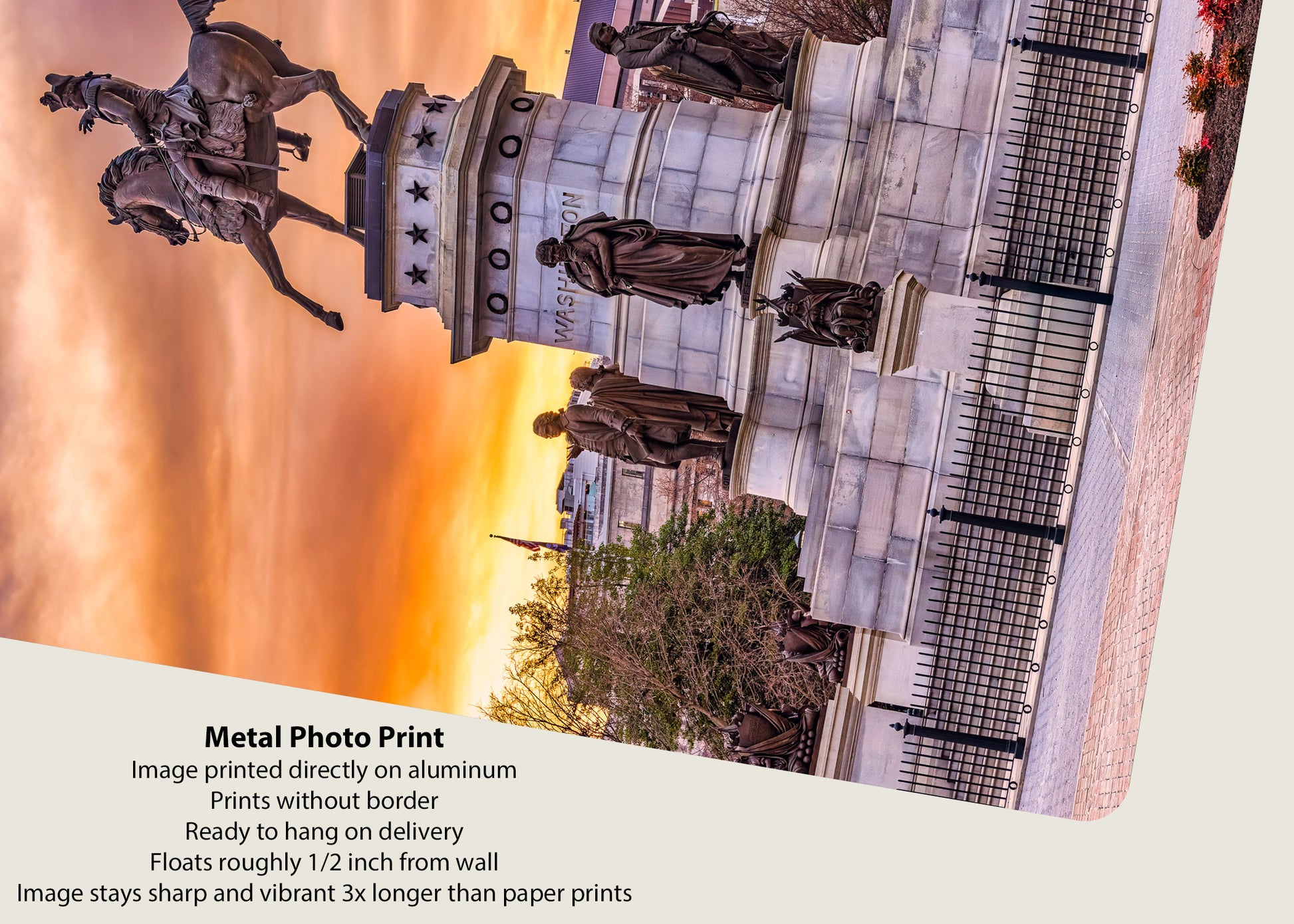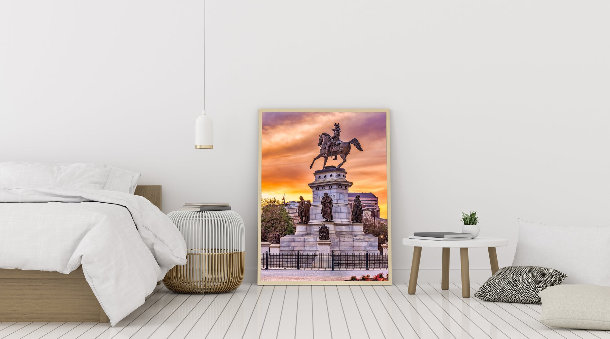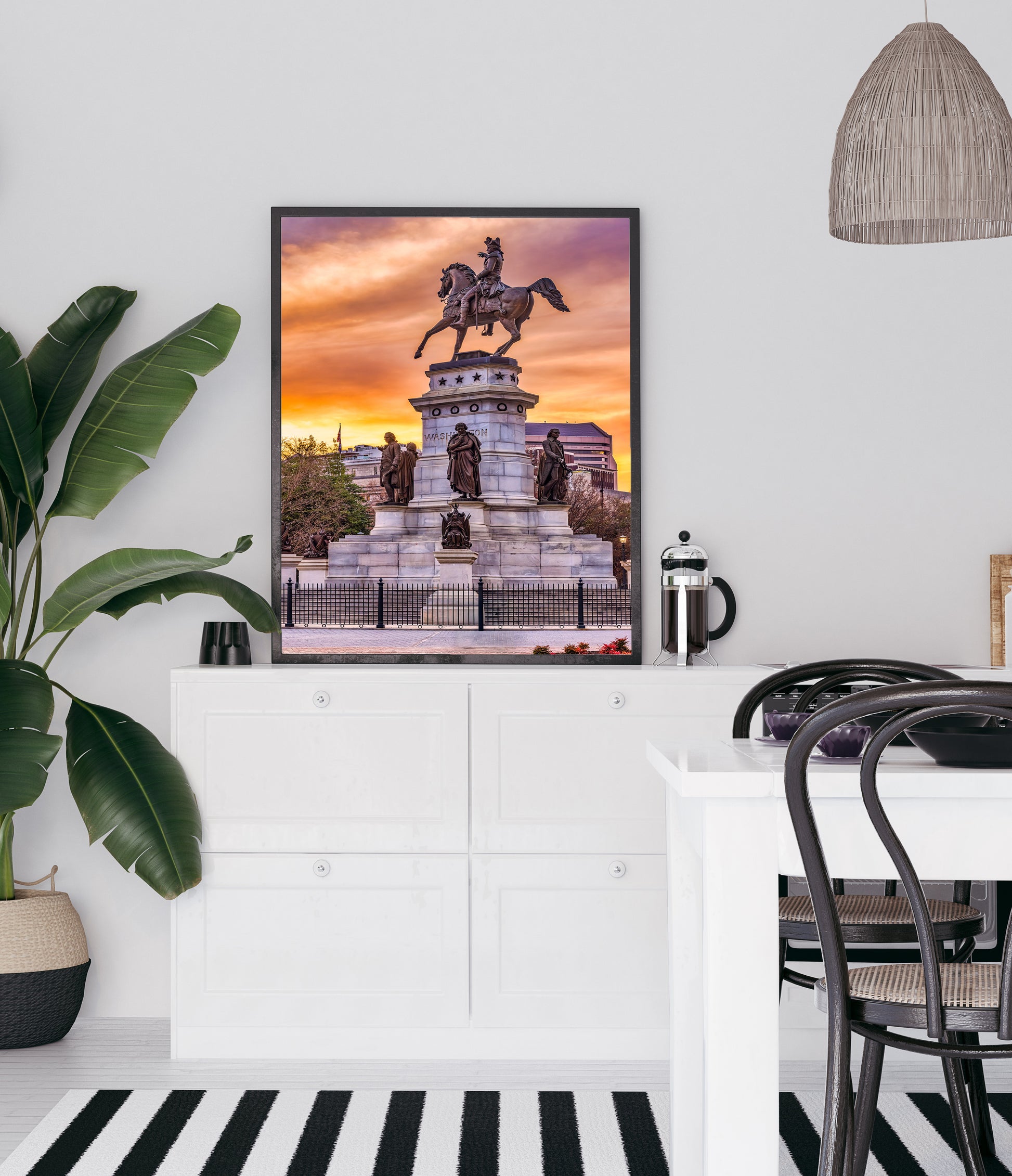 Bathed in the warm glow of sunset, the statue of George Washington stands with quiet authority outside the Virginia State Capitol building. The golden light casts soft shadows across the historic grounds, highlighting the careful craftsmanship of the monument and the timeless architecture behind it. This striking composition honors both the legacy of leadership and the enduring beauty of Richmond’s civic heart.