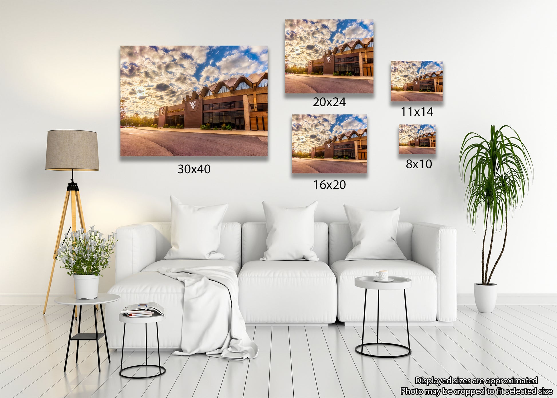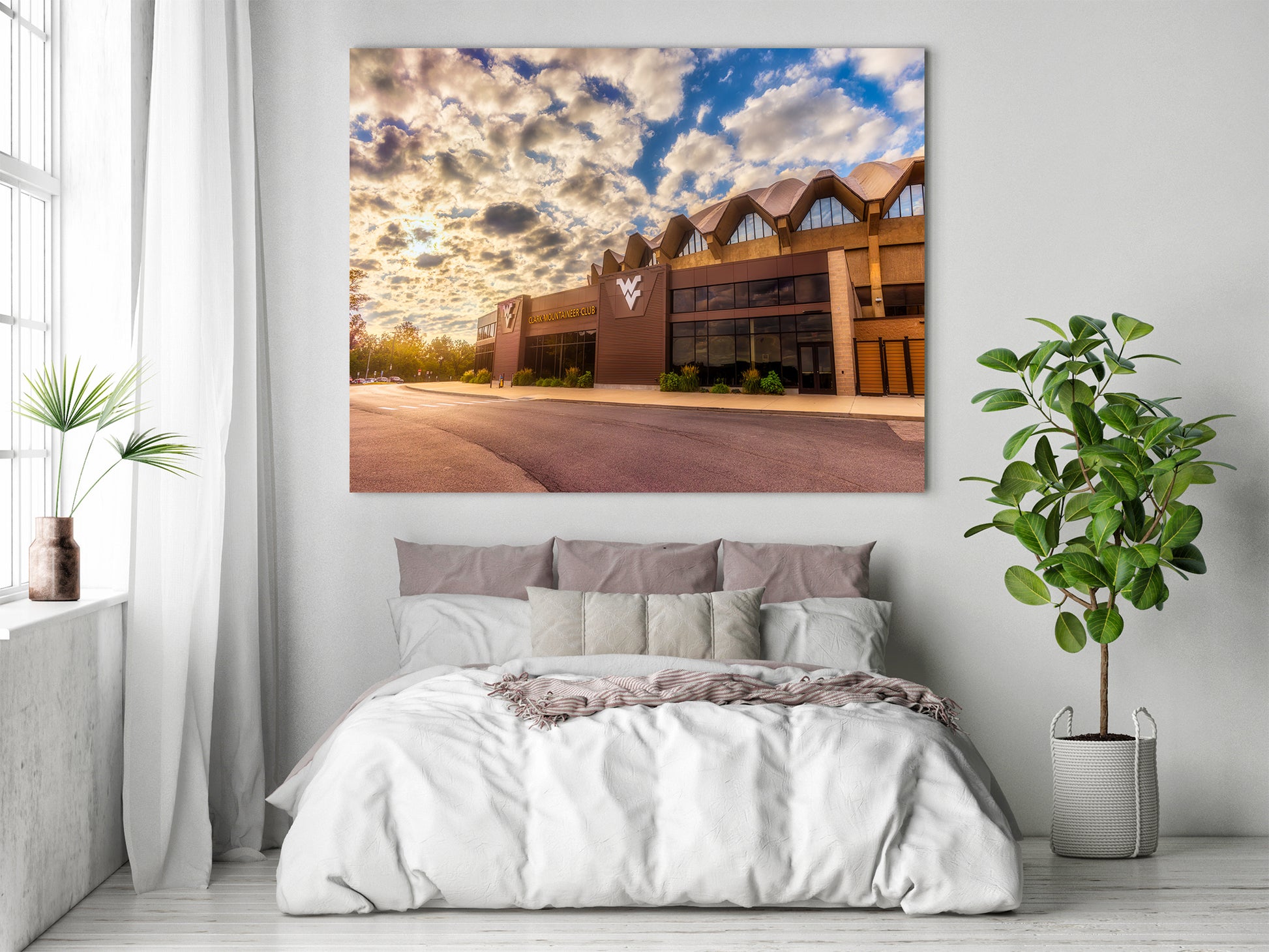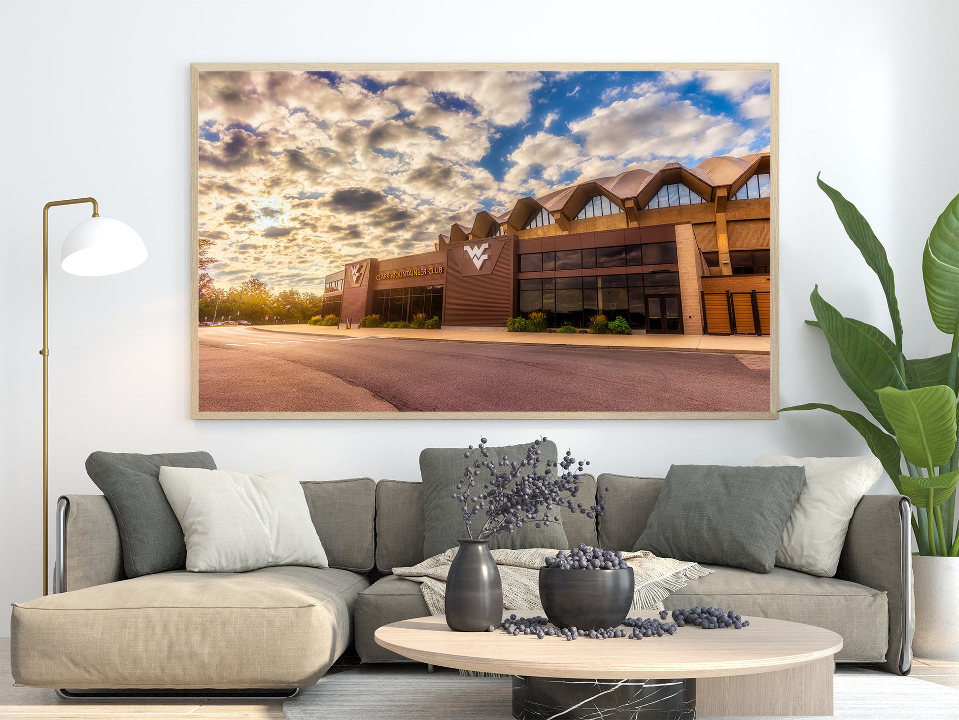 This print makes a striking addition for Mountaineer fans, alumni, or anyone with a love for college basketball. Its mix of architectural detail and natural color brings a bold yet calming presence to any wall, perfect for display in a home, office, or fan space. Professionally printed, it celebrates the pride and tradition of WVU athletics.