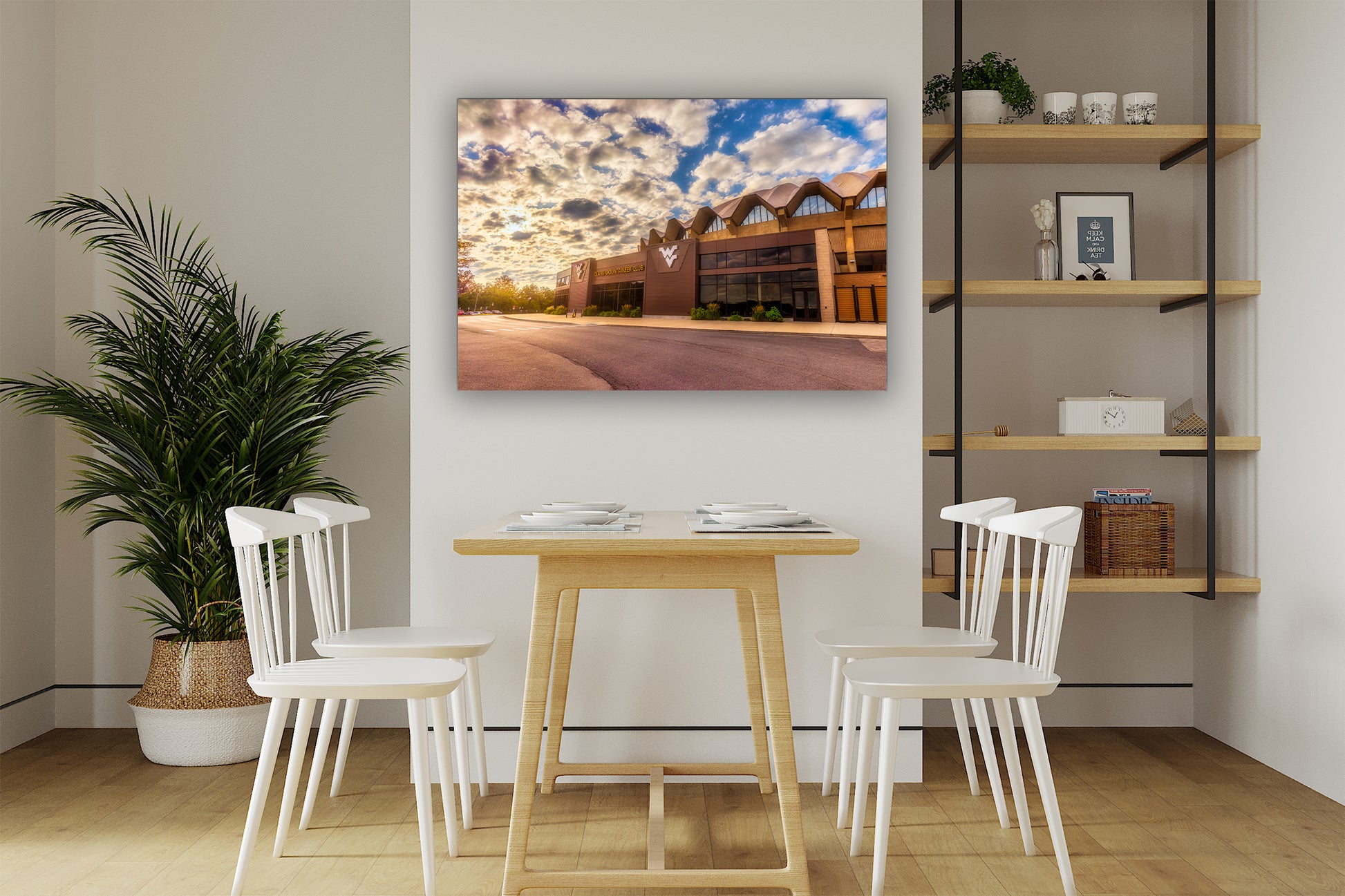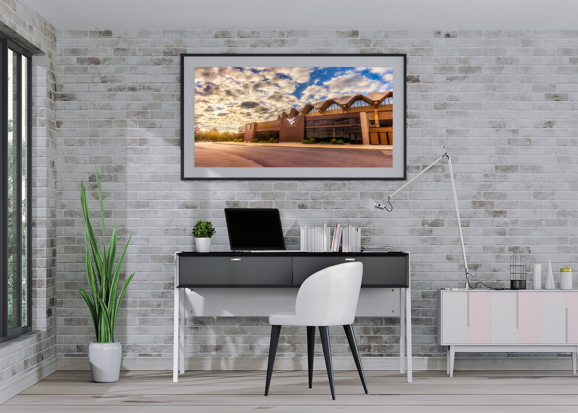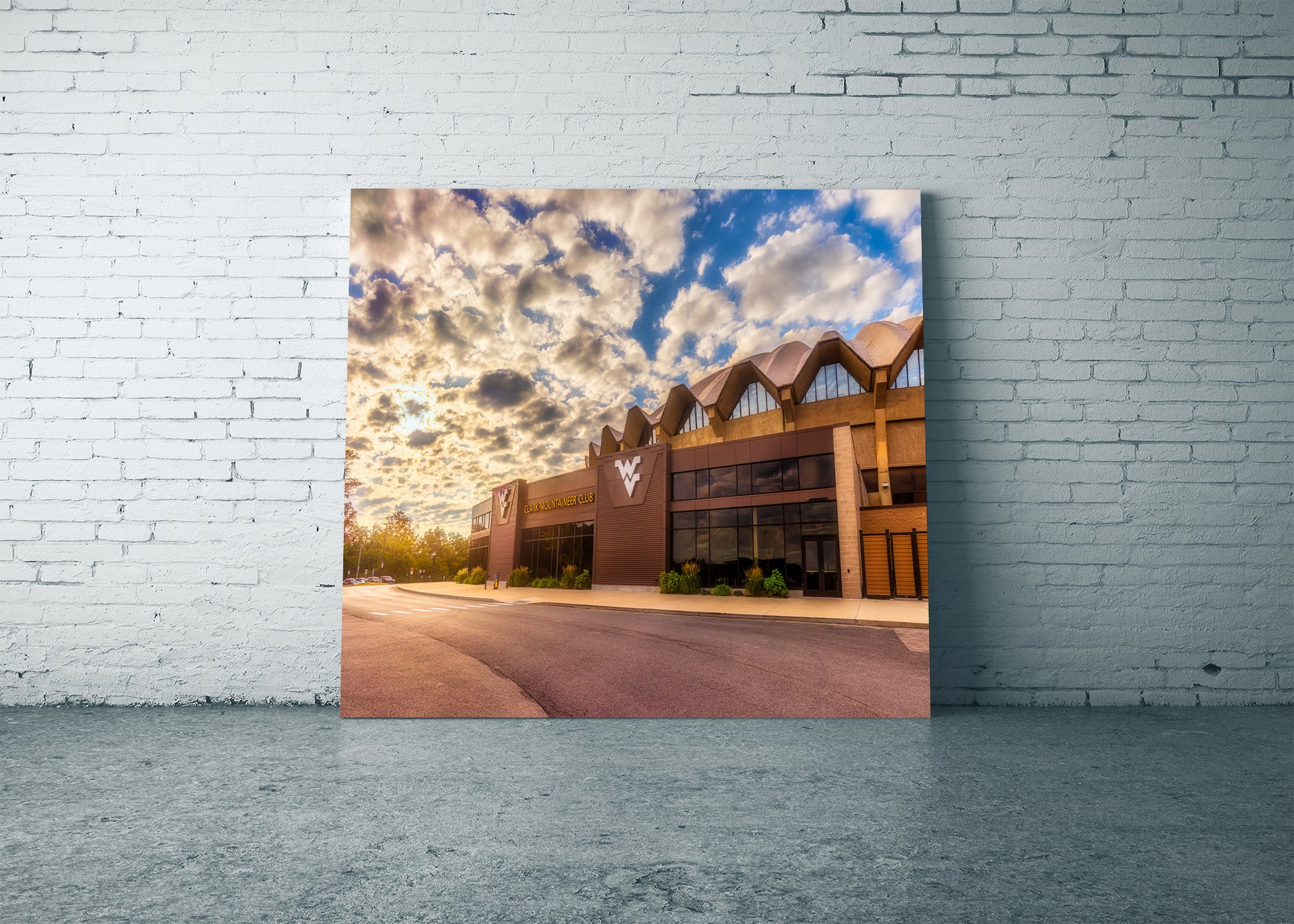 This print makes a striking addition for Mountaineer fans, alumni, or anyone with a love for college basketball. Its mix of architectural detail and natural color brings a bold yet calming presence to any wall, perfect for display in a home, office, or fan space. Professionally printed, it celebrates the pride and tradition of WVU athletics.