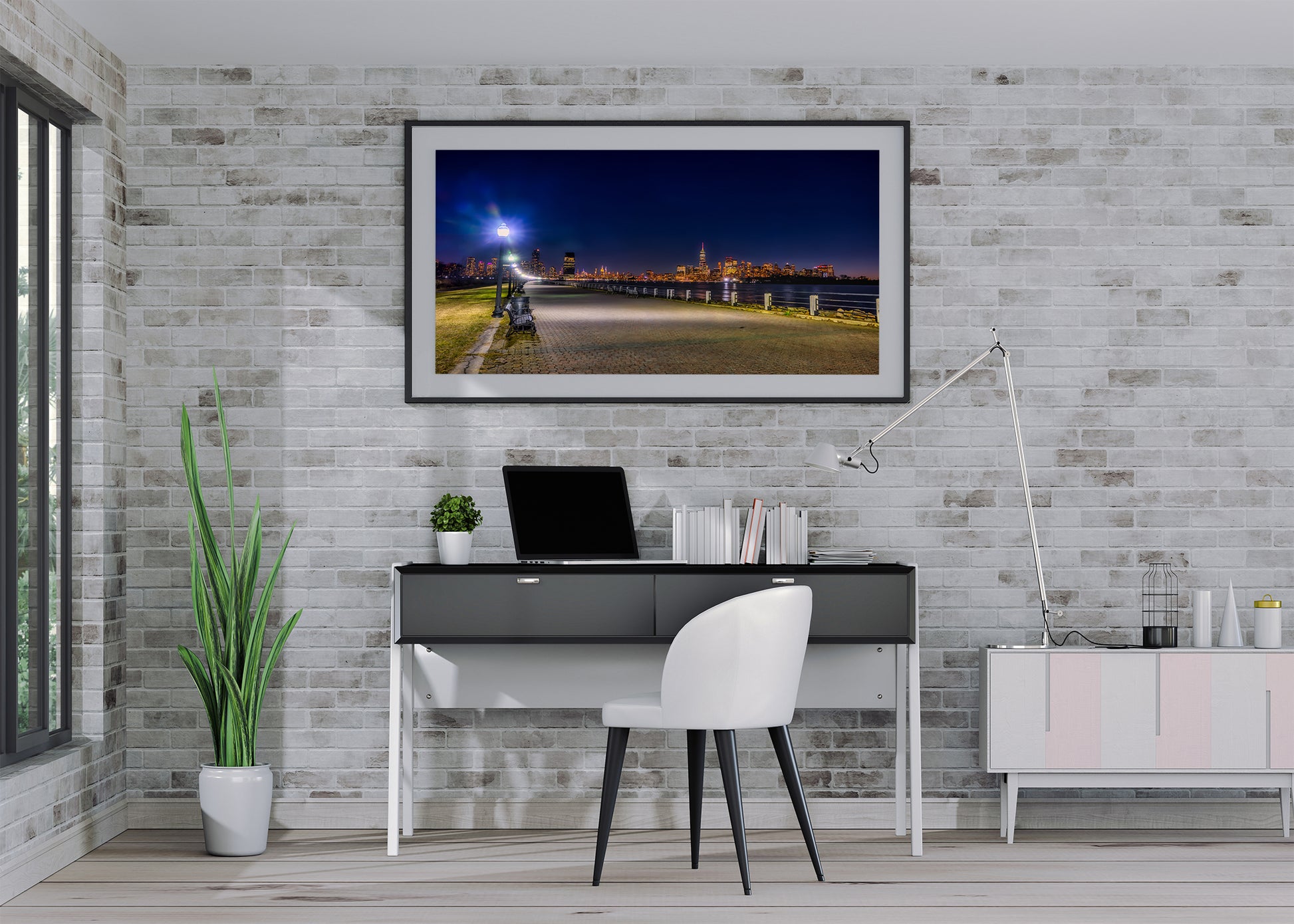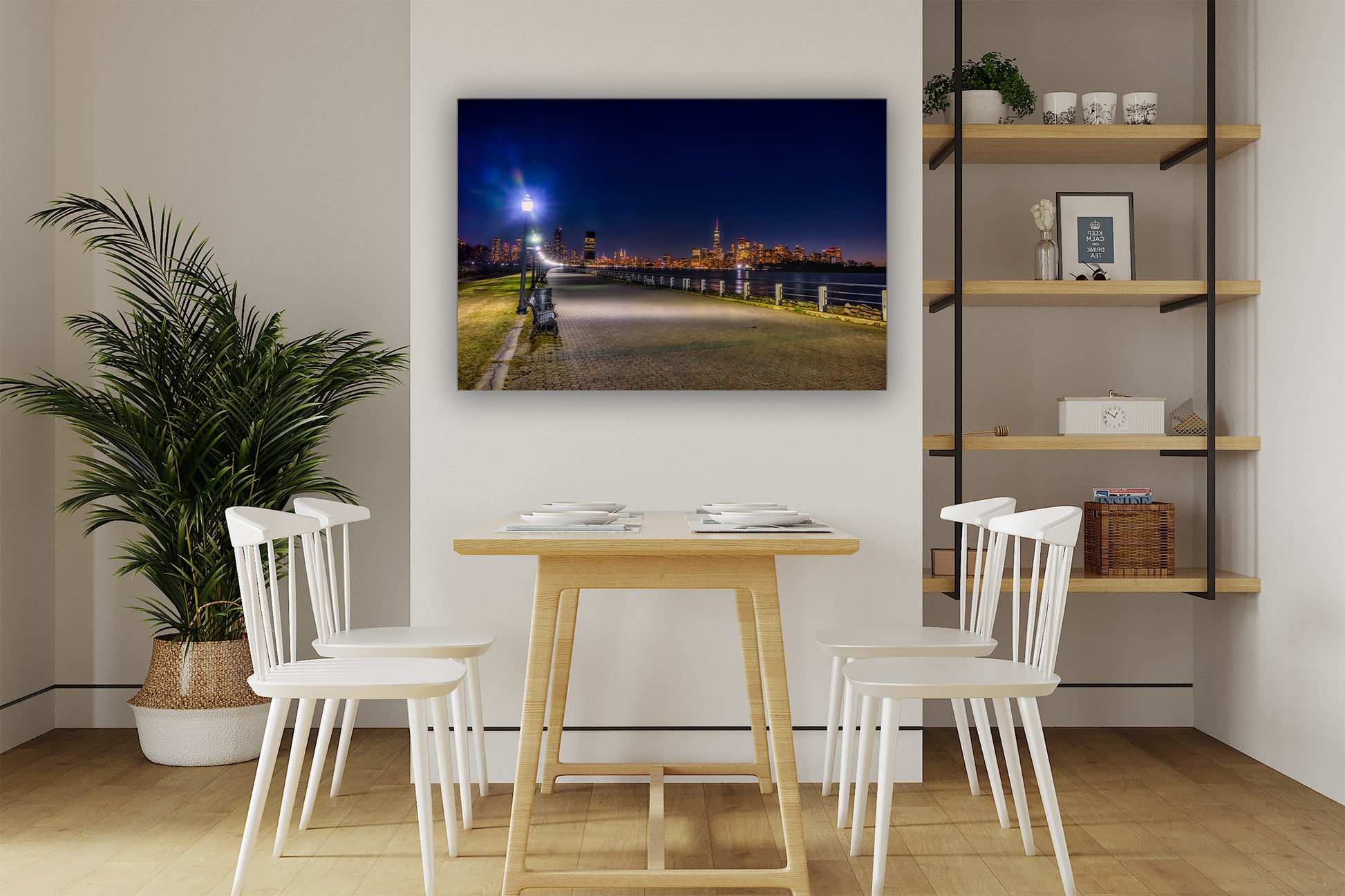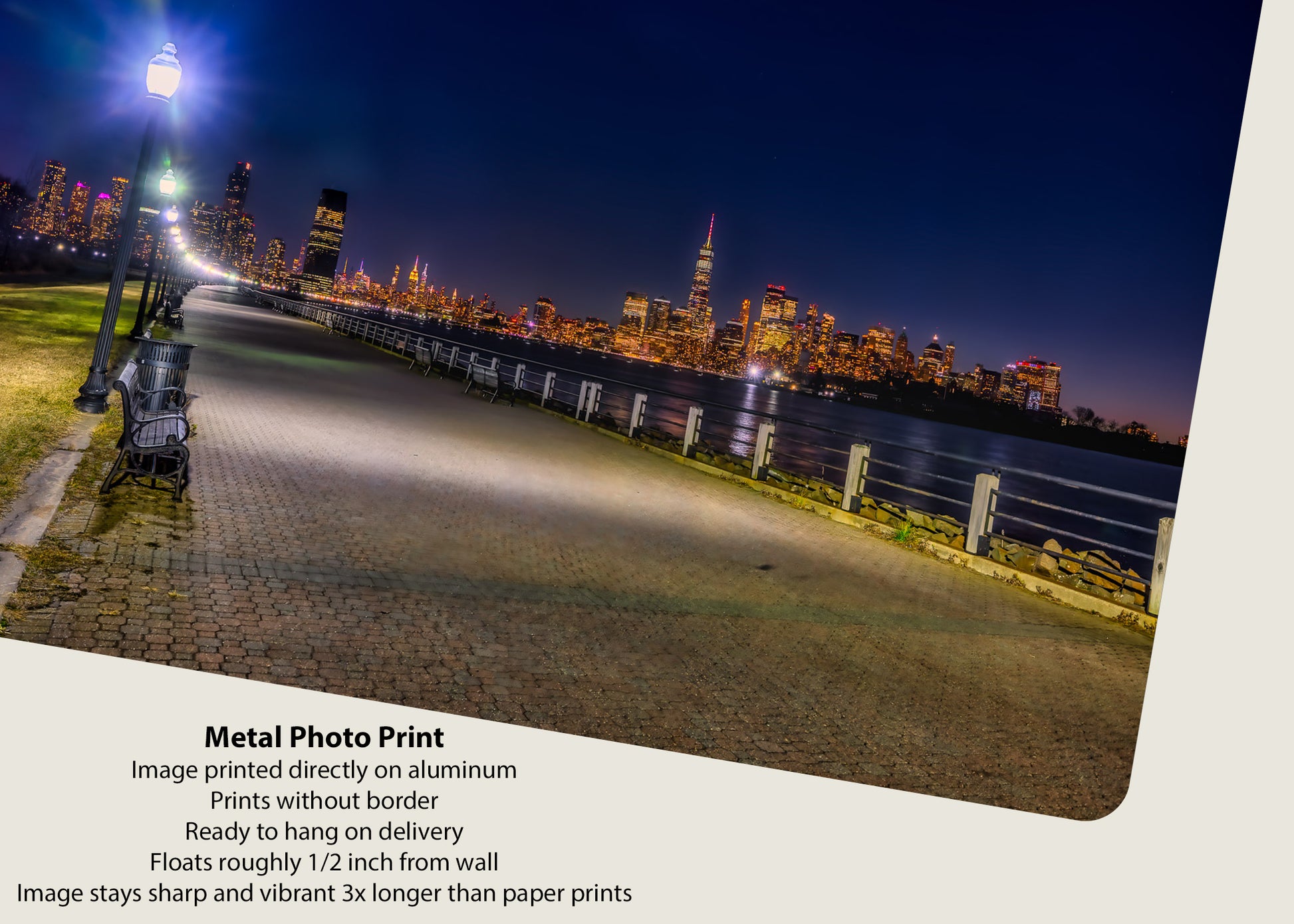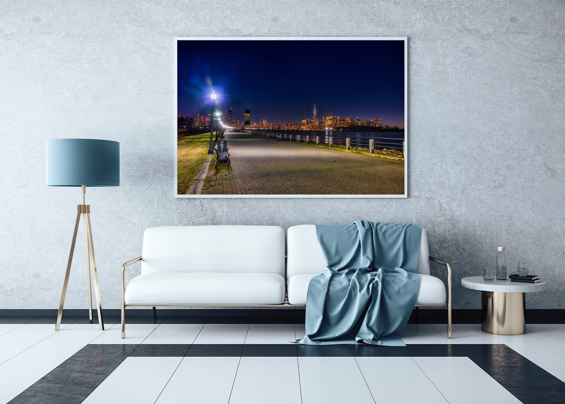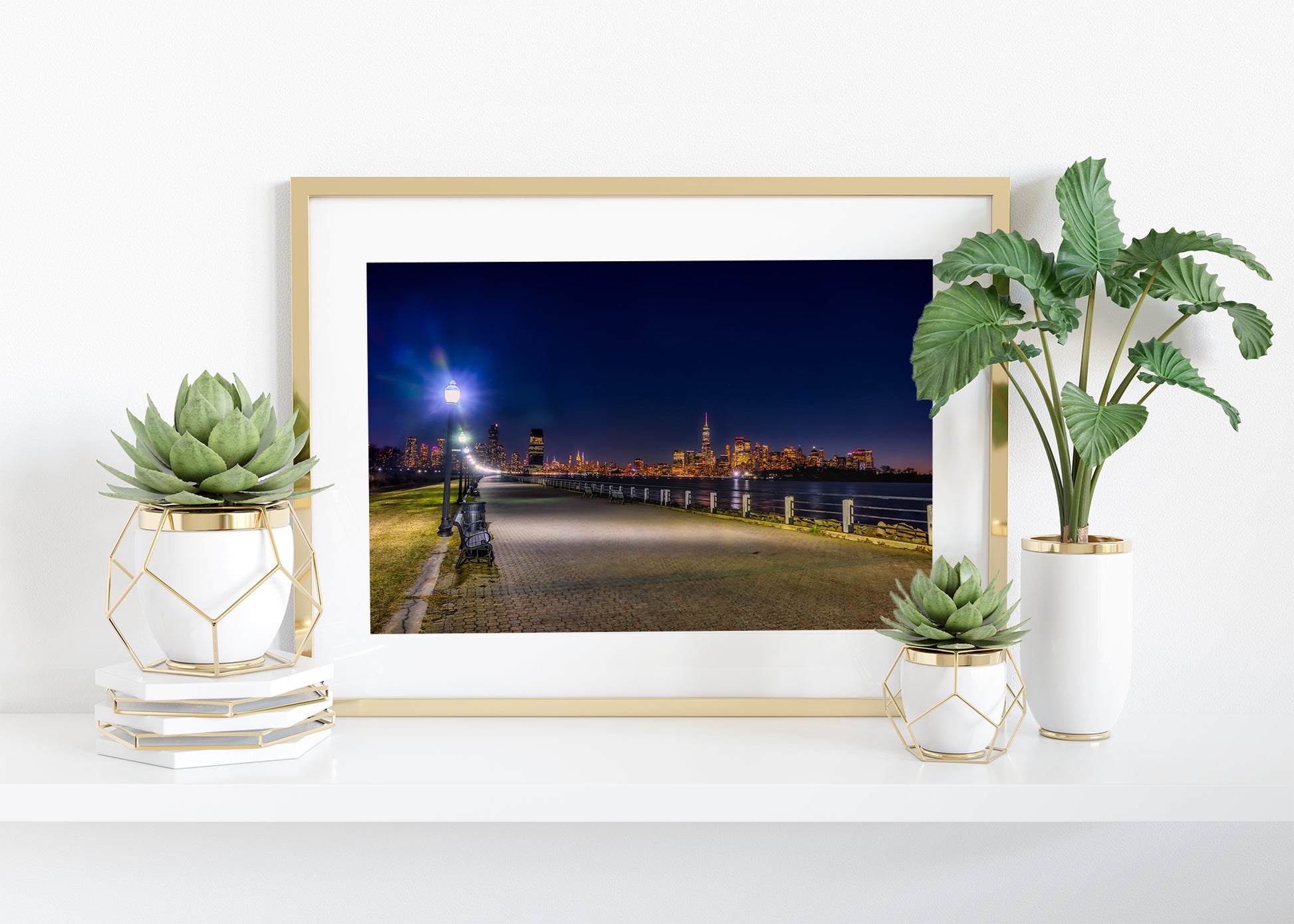 The Liberty State Park walkway glows under the night sky, with gentle lights guiding the path toward the majestic New York City skyline. Towering in the distance, the illuminated buildings stand as a testament to ambition and possibility. This composition beautifully merges tranquility with the vibrant energy of the city that never sleeps.
