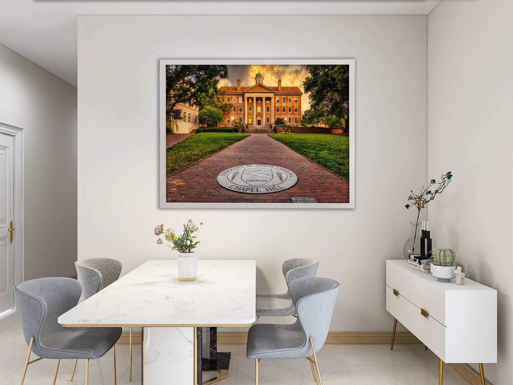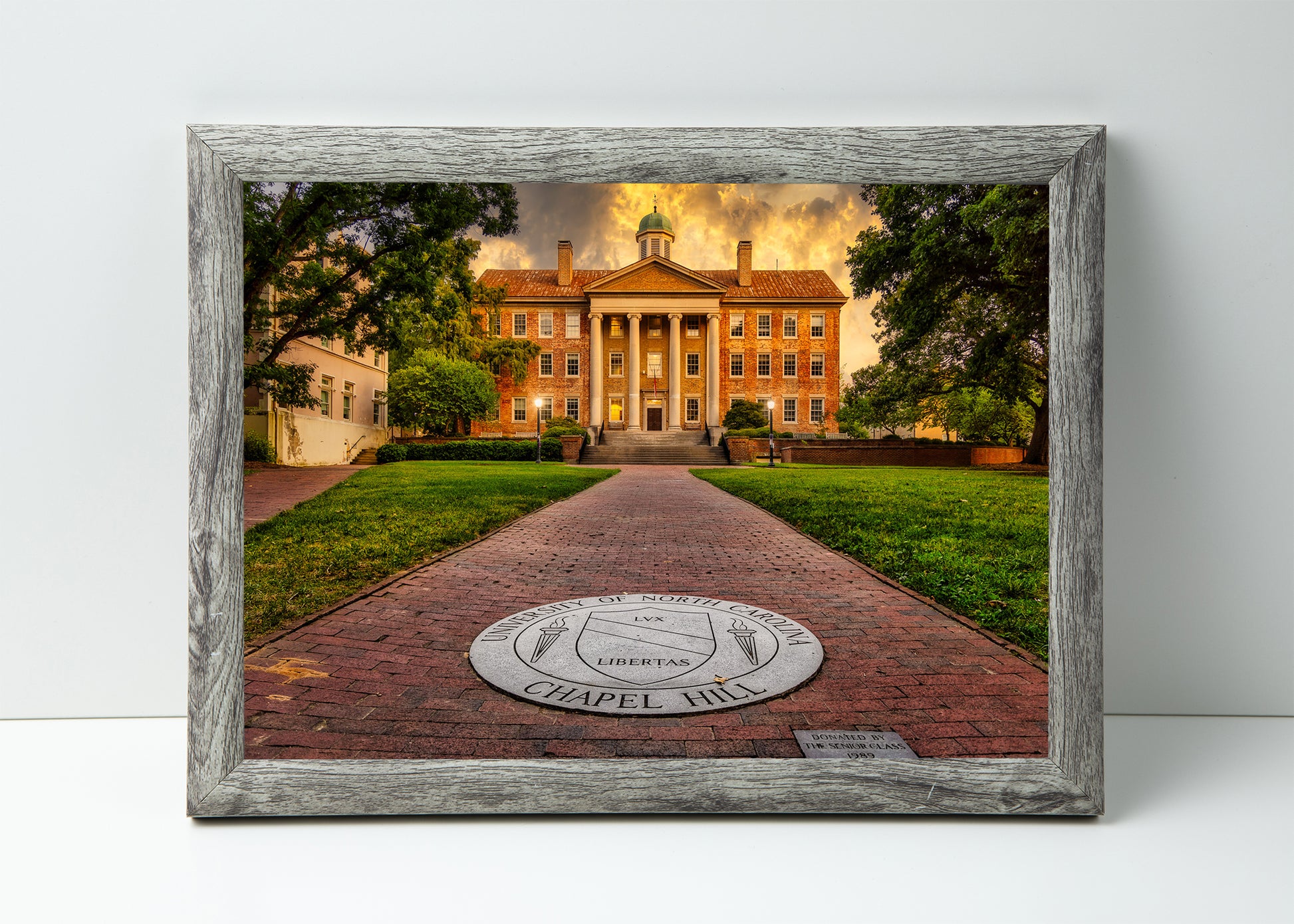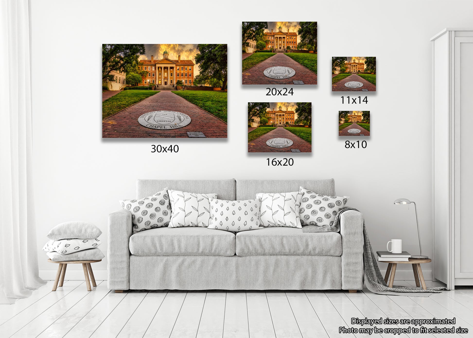 Bring a piece of your alma mater into your home with this stunning print of the South Building at the University of North Carolina at Chapel Hill. Captured in gorgeous detail, this image showcases the sun setting behind the iconic structure, casting a warm glow over the entire scene. The perfect addition to any Tar Heel's wall decor collection, this print is sure to inspire fond memories of your time in Chapel Hill.