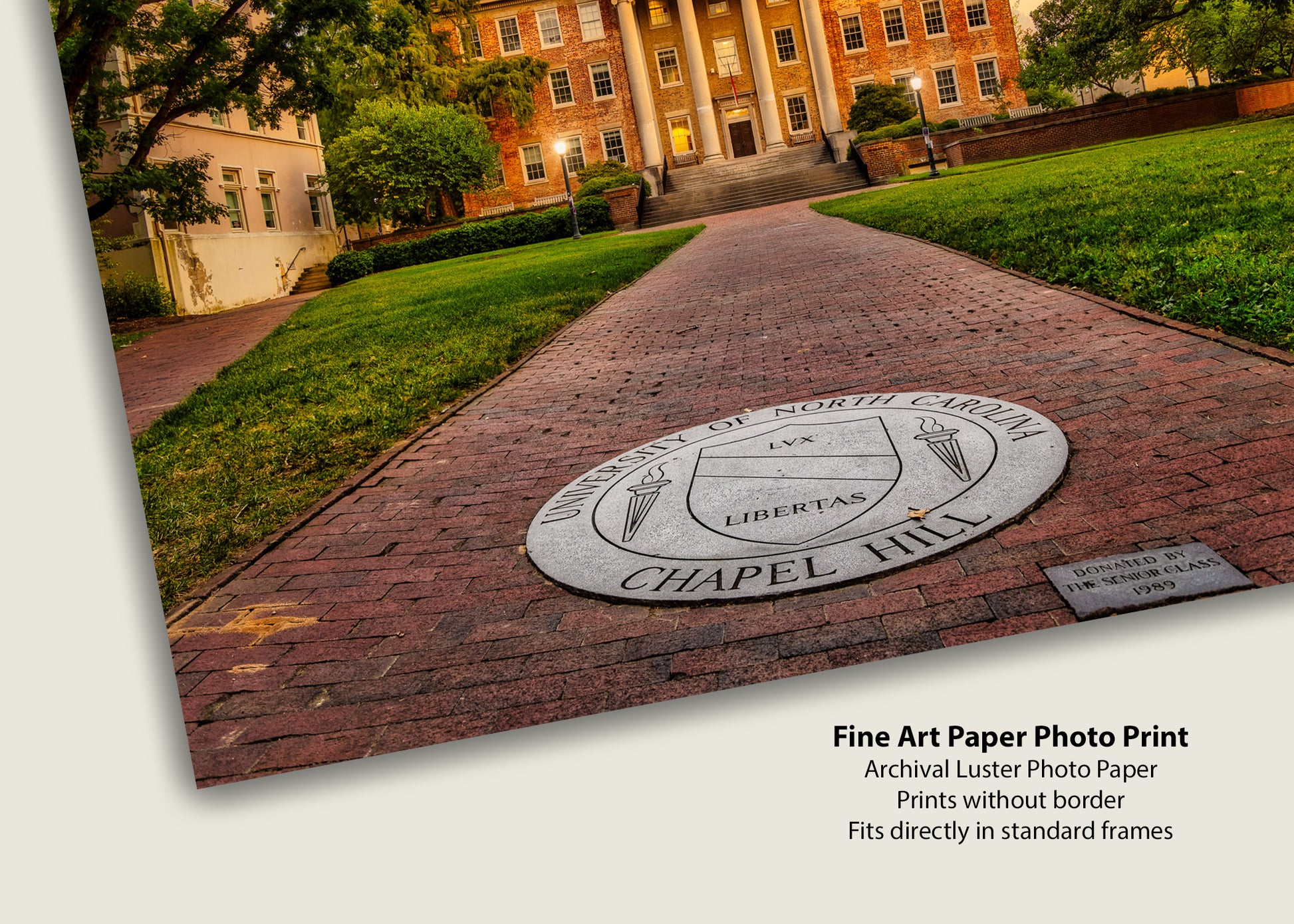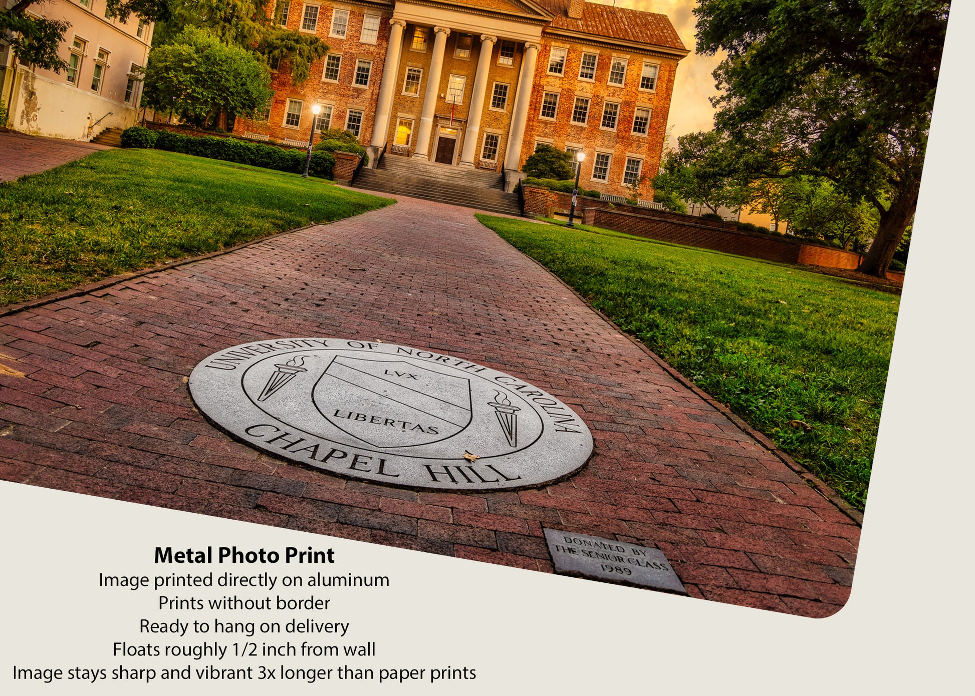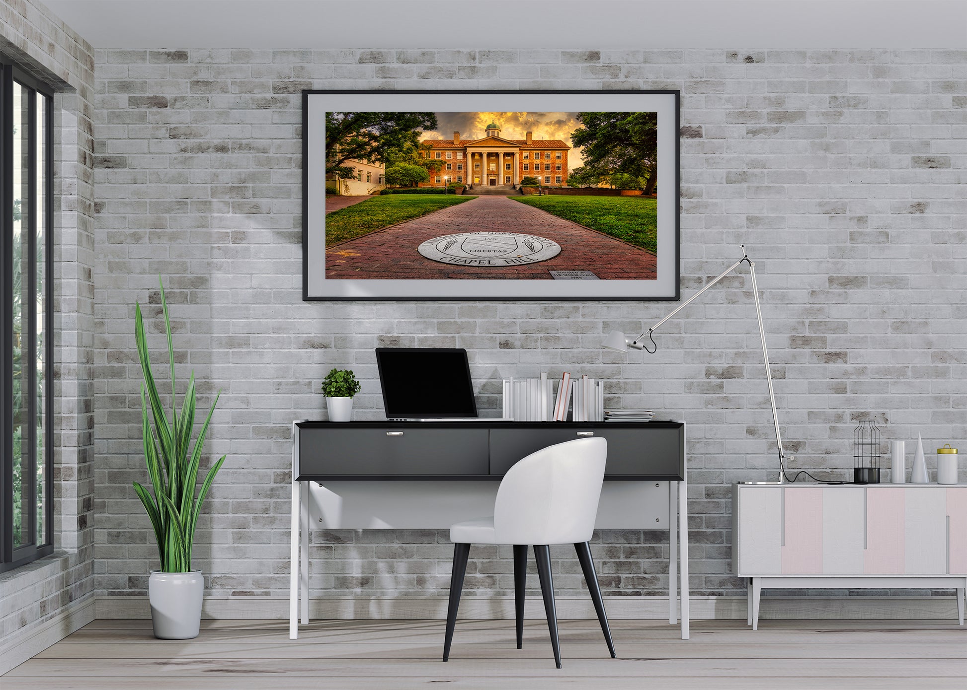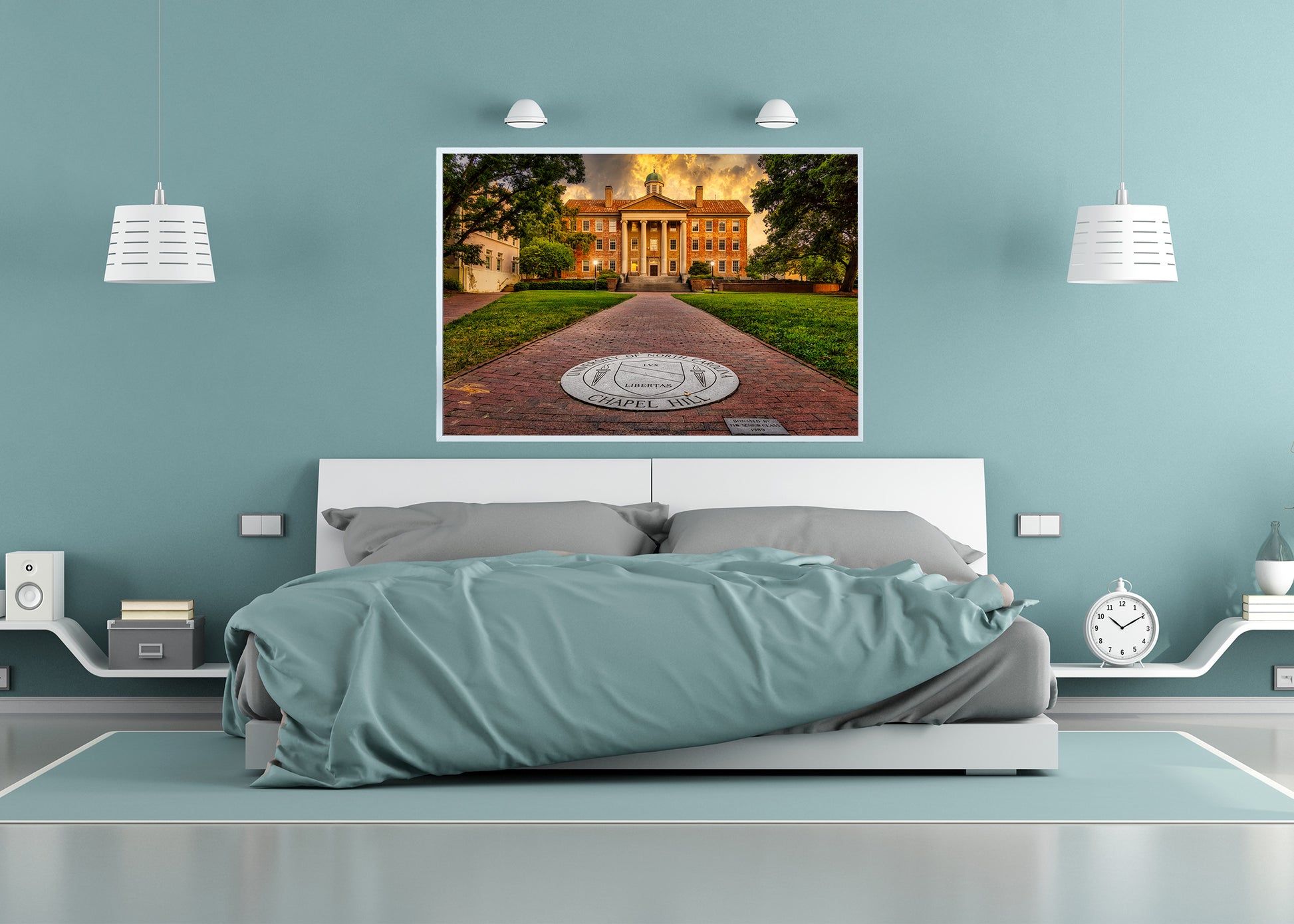 Bring a piece of your alma mater into your home with this stunning print of the South Building at the University of North Carolina at Chapel Hill. Captured in gorgeous detail, this image showcases the sun setting behind the iconic structure, casting a warm glow over the entire scene. The perfect addition to any Tar Heel's wall decor collection, this print is sure to inspire fond memories of your time in Chapel Hill.