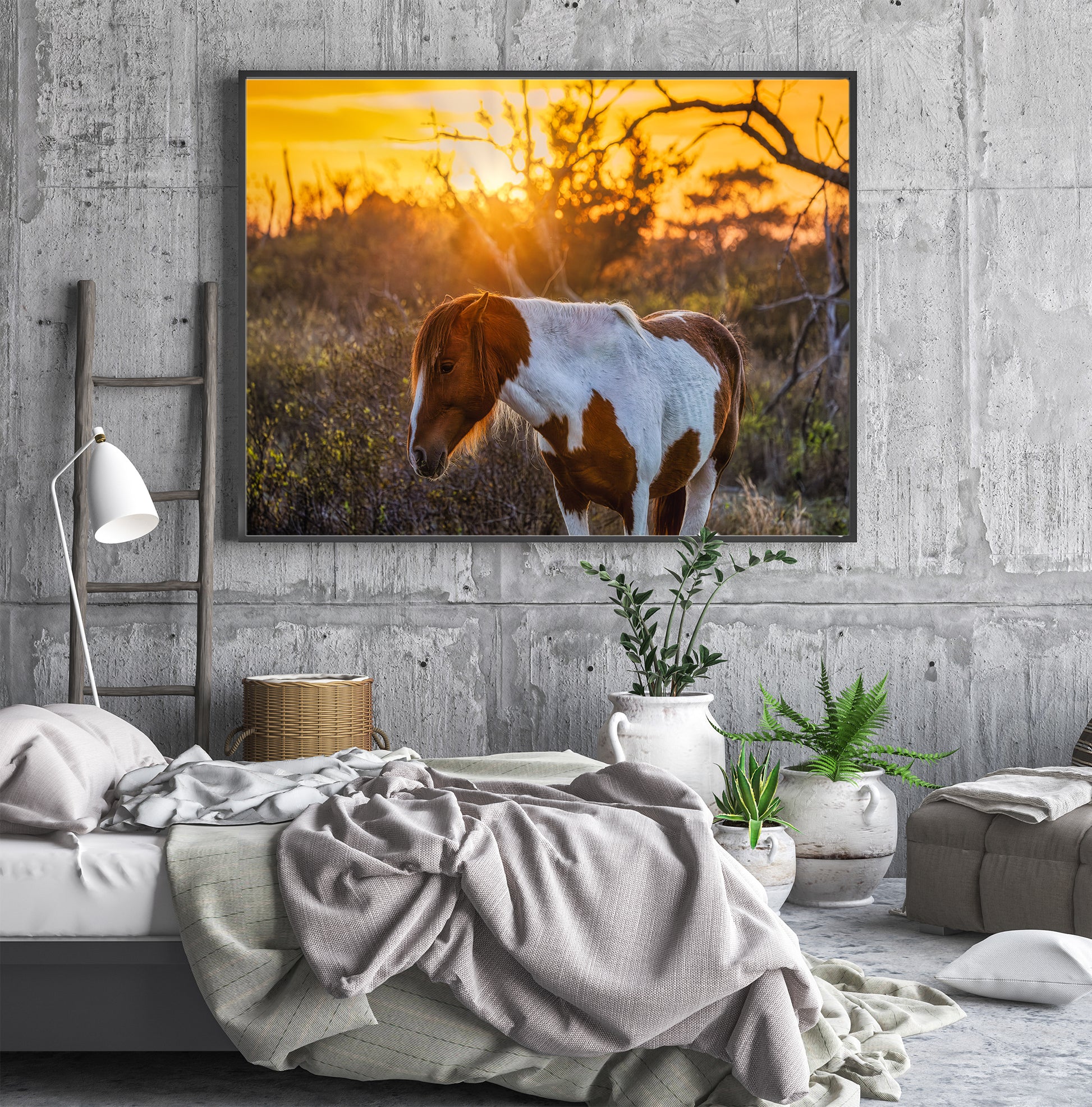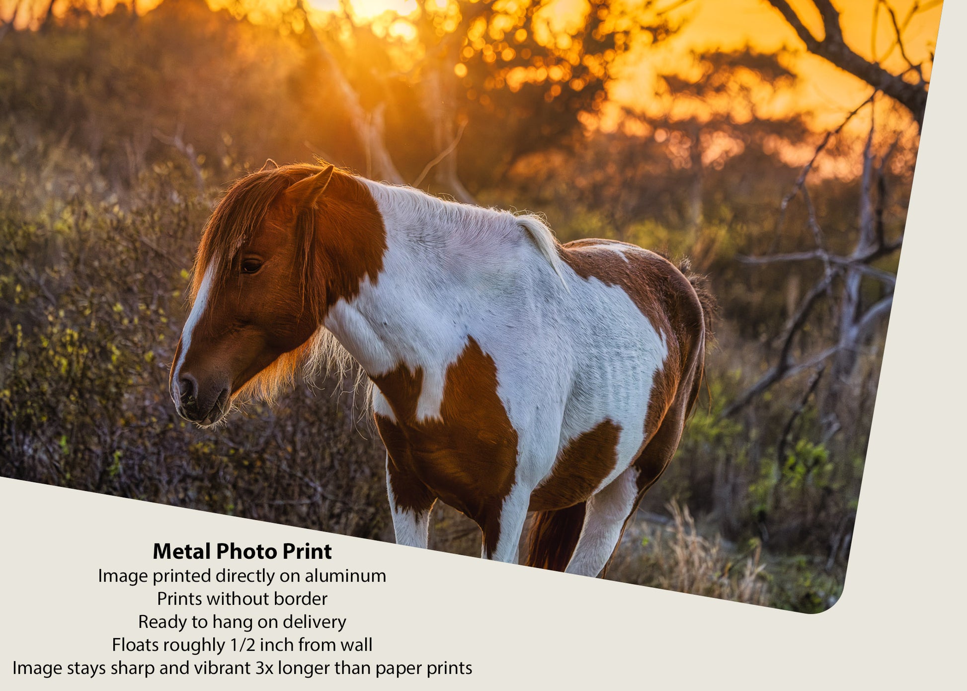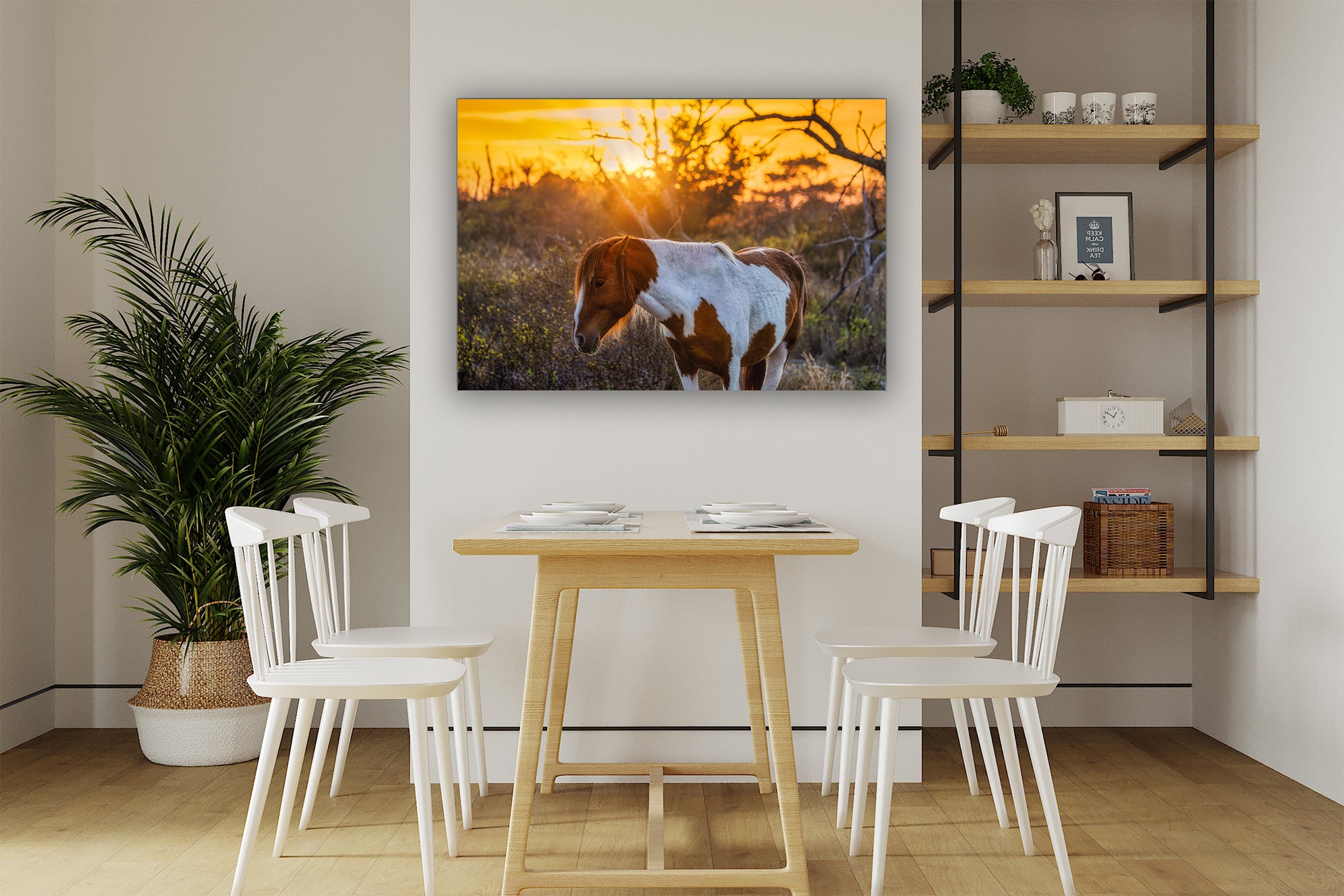 Bathed in the warm glow of sunset, a wild horse wander through the wooded paths of Assateague Island. Dappled light filters through the trees, casting long shadows as the day draws to a close. The scene feels timeless—quiet, untamed, and deeply connected to nature’s rhythms.