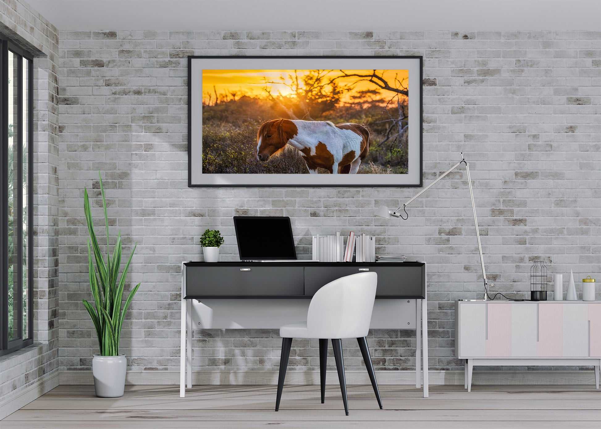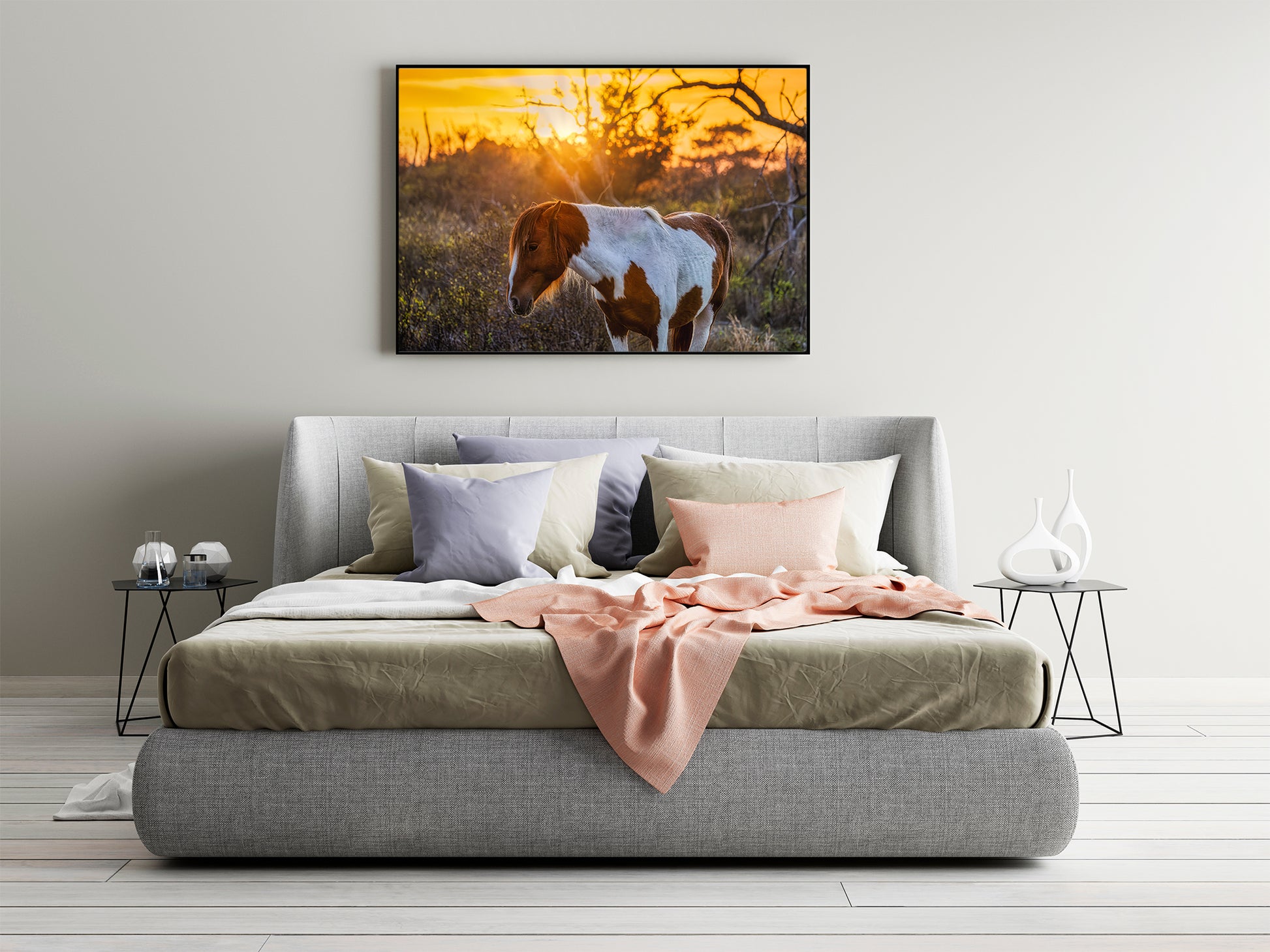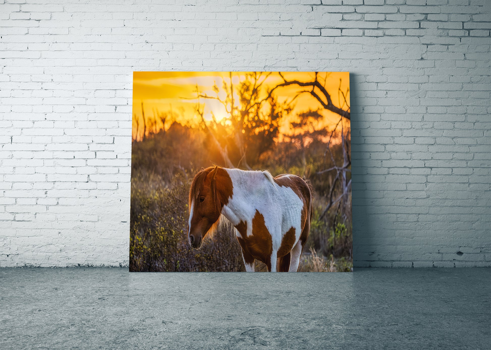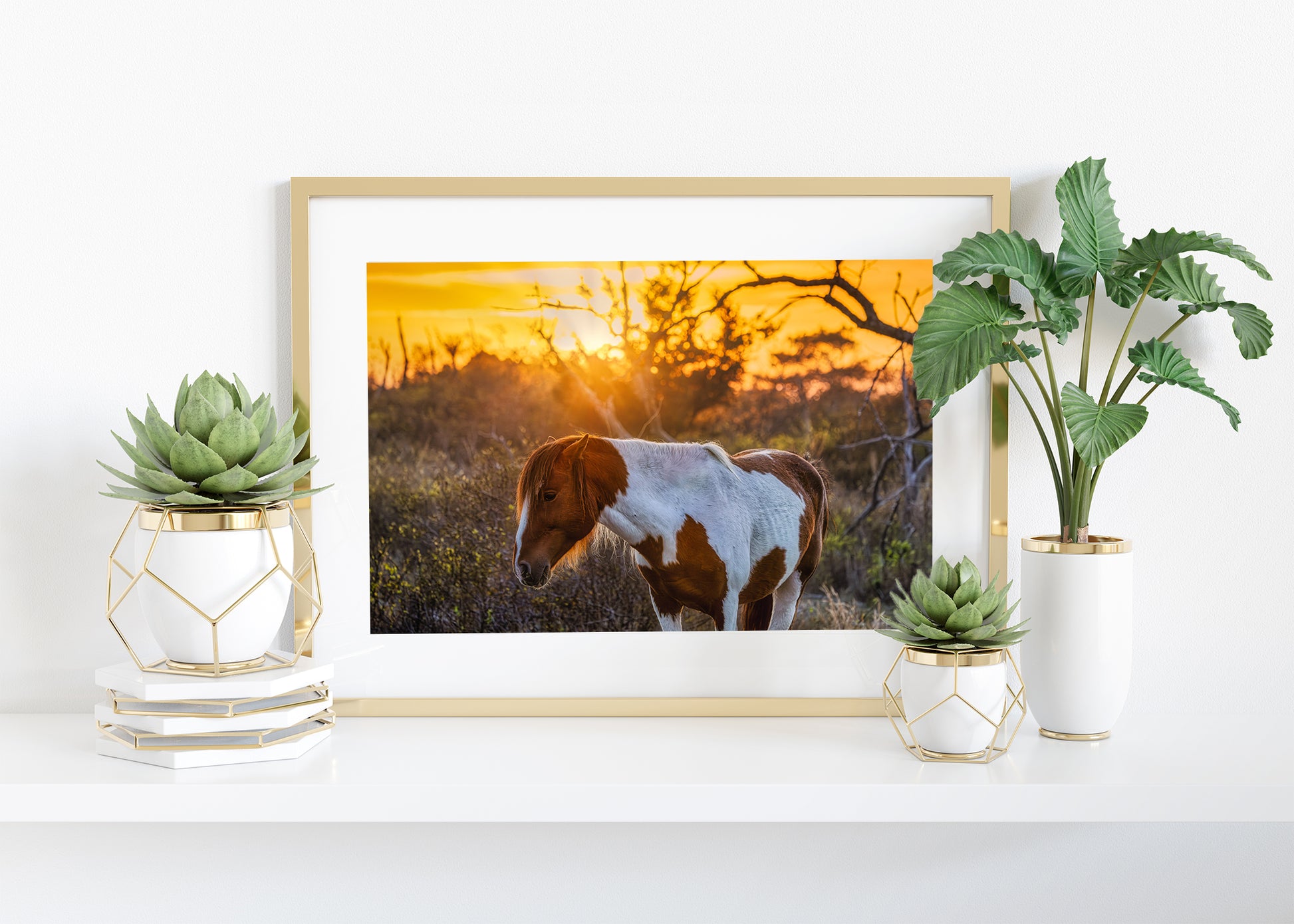 Bathed in the warm glow of sunset, a wild horse wander through the wooded paths of Assateague Island. Dappled light filters through the trees, casting long shadows as the day draws to a close. The scene feels timeless—quiet, untamed, and deeply connected to nature’s rhythms.