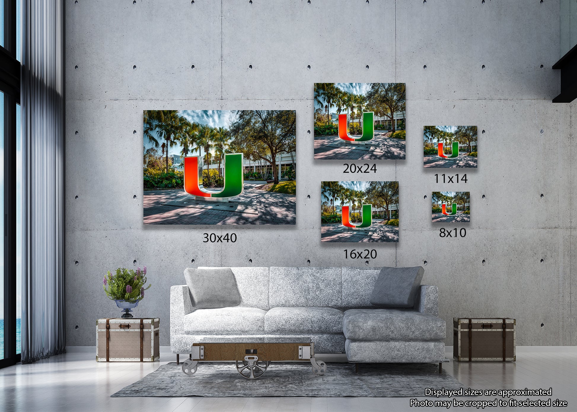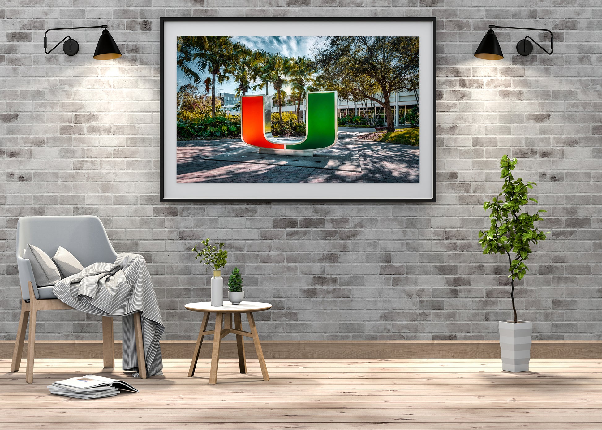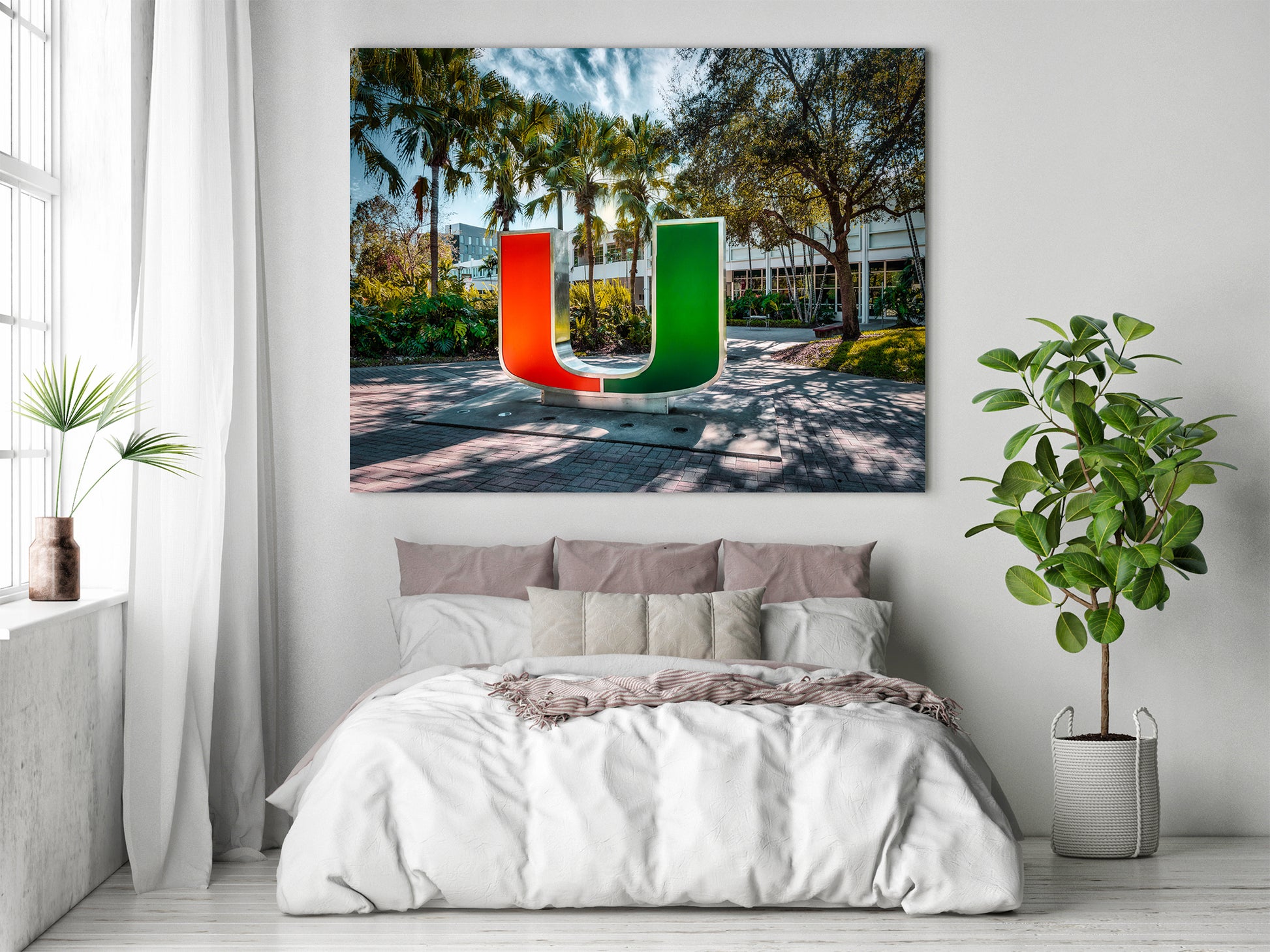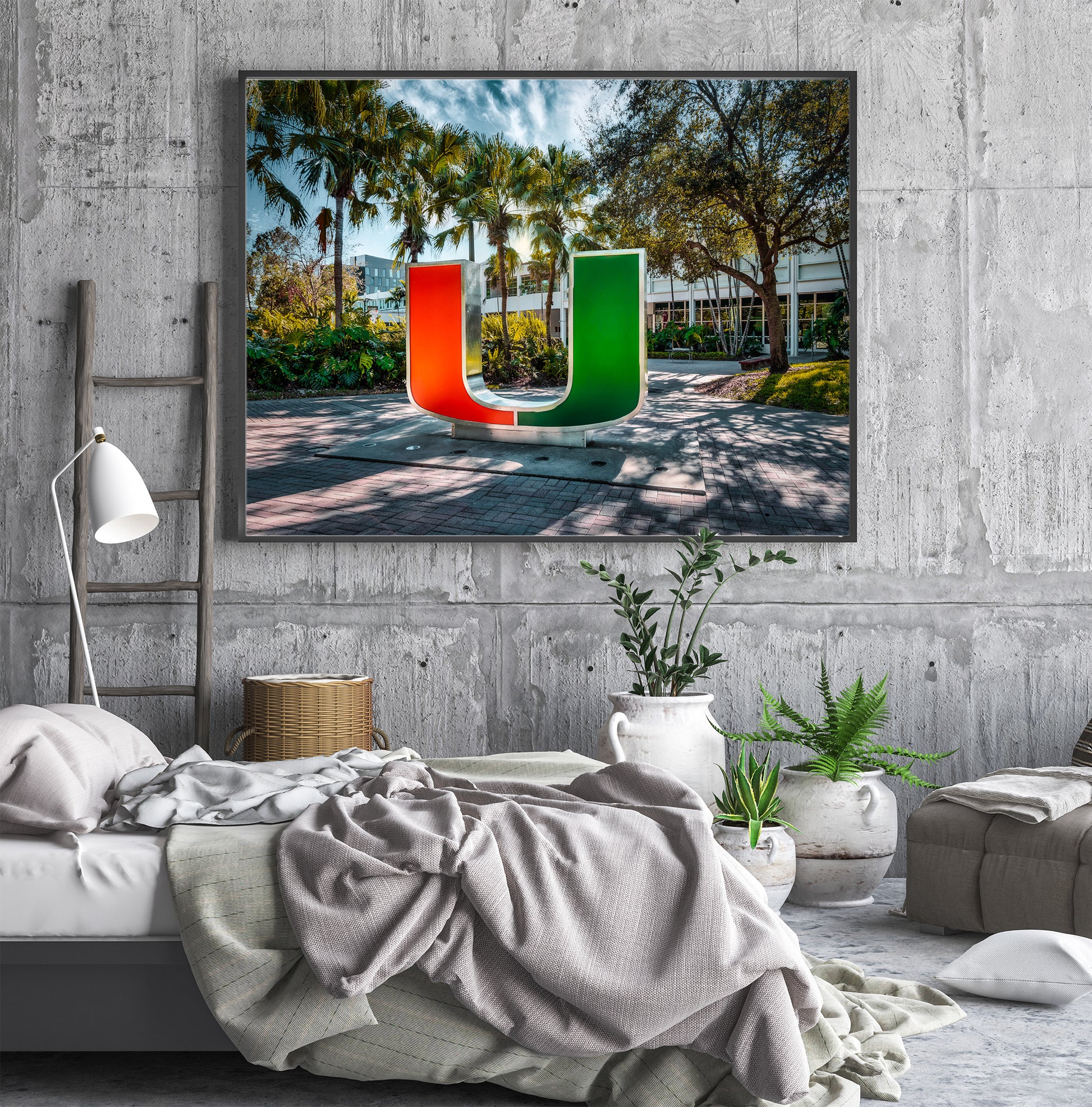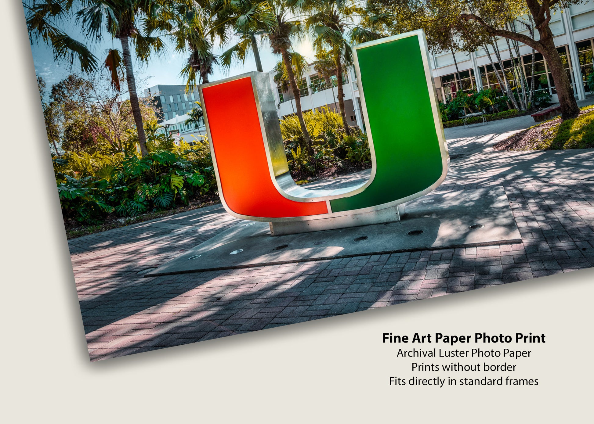 The iconic U statue at the University of Miami stands bold and proud, dramatically lit against the surrounding shadows. Vivid colors and deep contrasts bring the symbol to life, showcasing the energy and pride that define the Hurricane spirit. The lighting enhances its sleek form, turning a simple landmark into a powerful visual centerpiece.