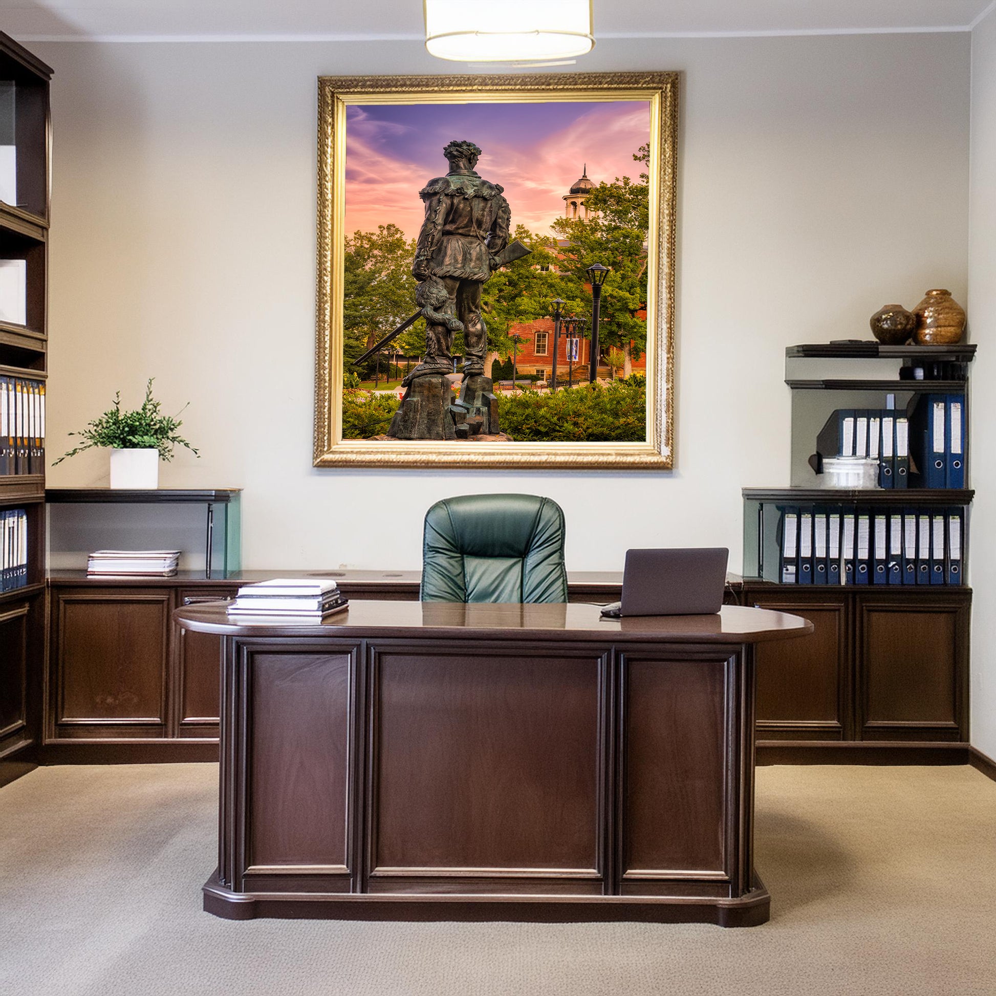 The Mountaineer statue at West Virginia University is bathed in the soft, golden light of sunrise, with Woodburn Hall visible in the background. The early morning glow highlights the statue’s details while casting a warm tone across the historic campus architecture. This image captures both the spirit of the Mountaineers and the timeless beauty of WVU’s heart.