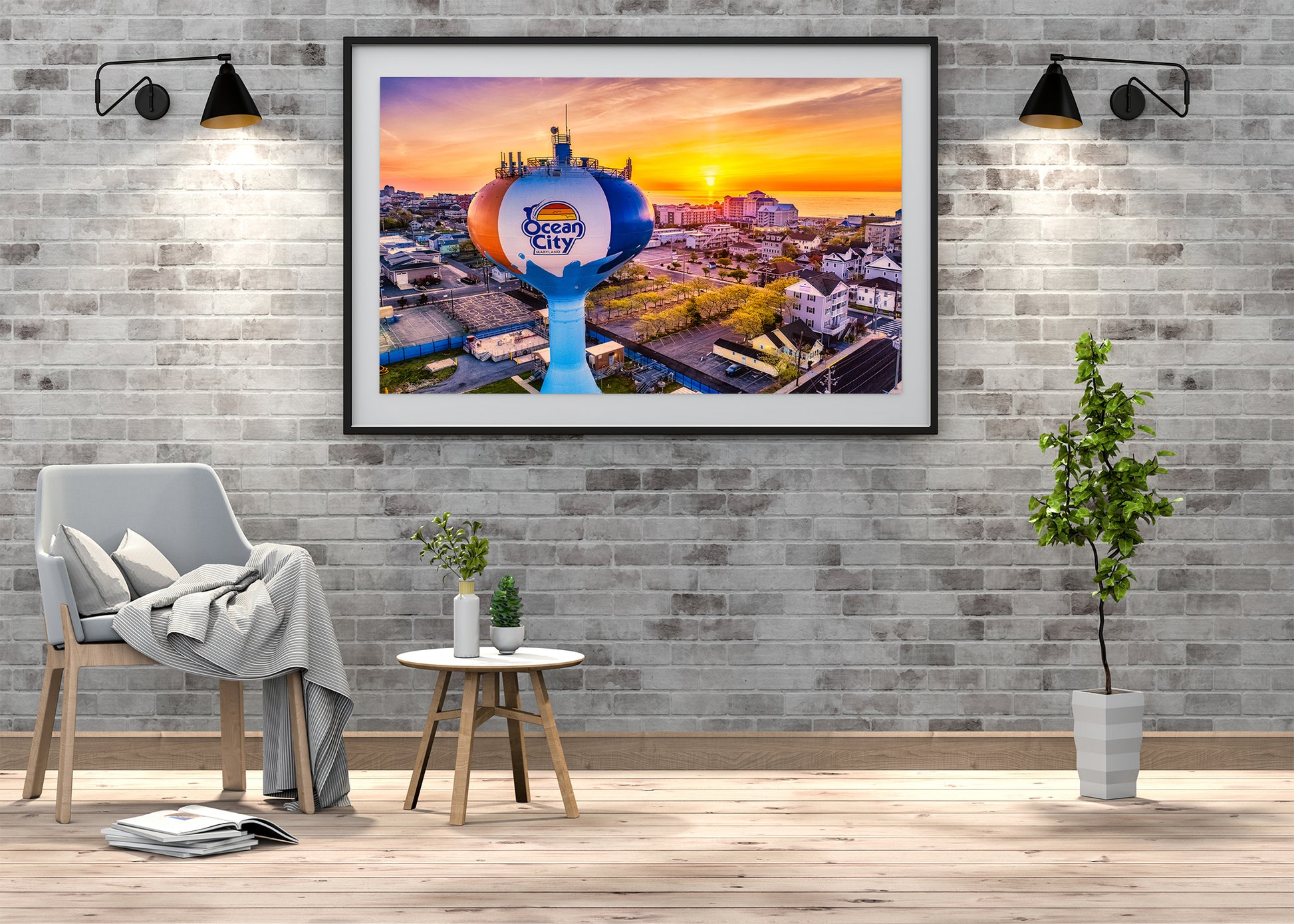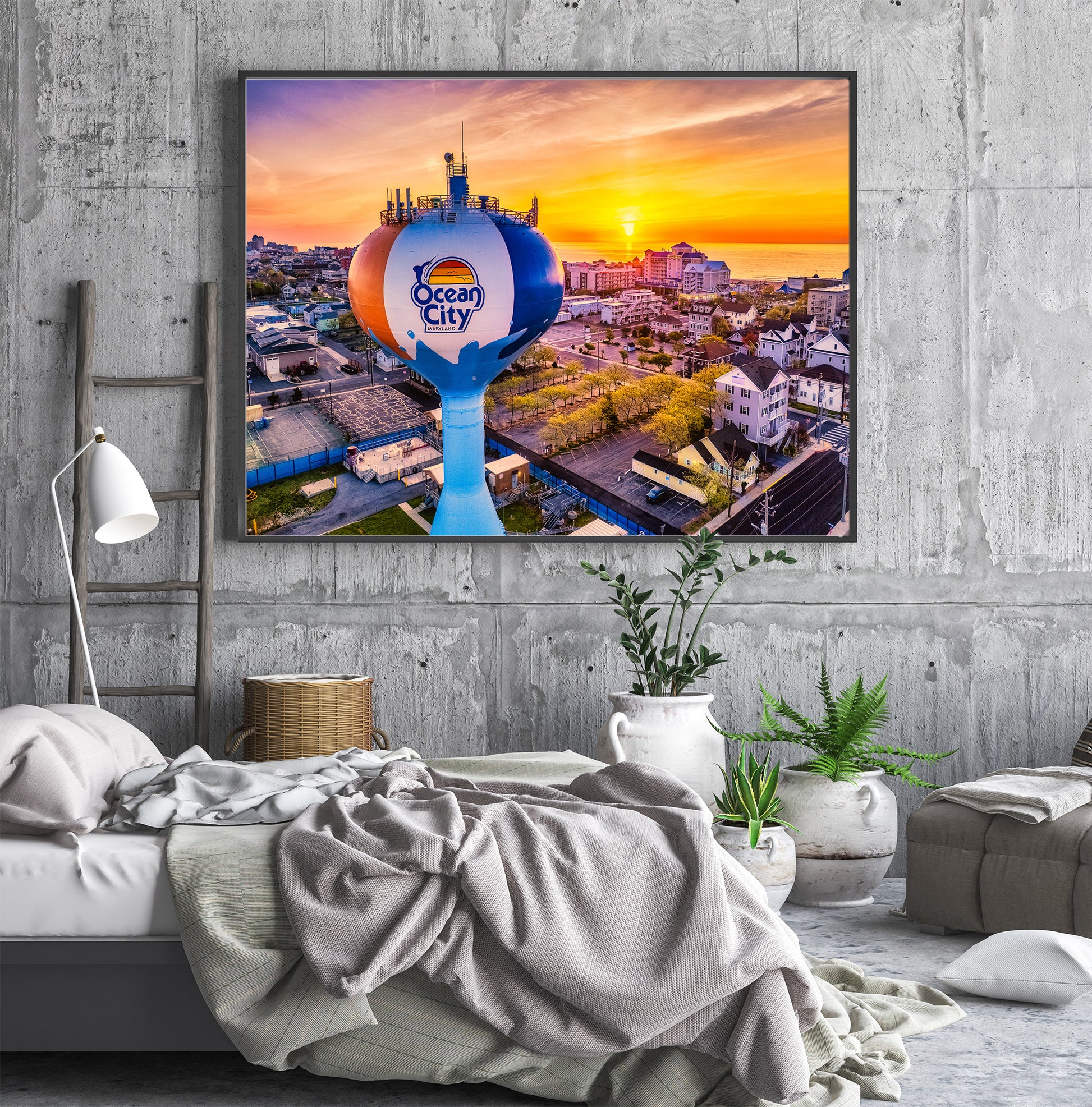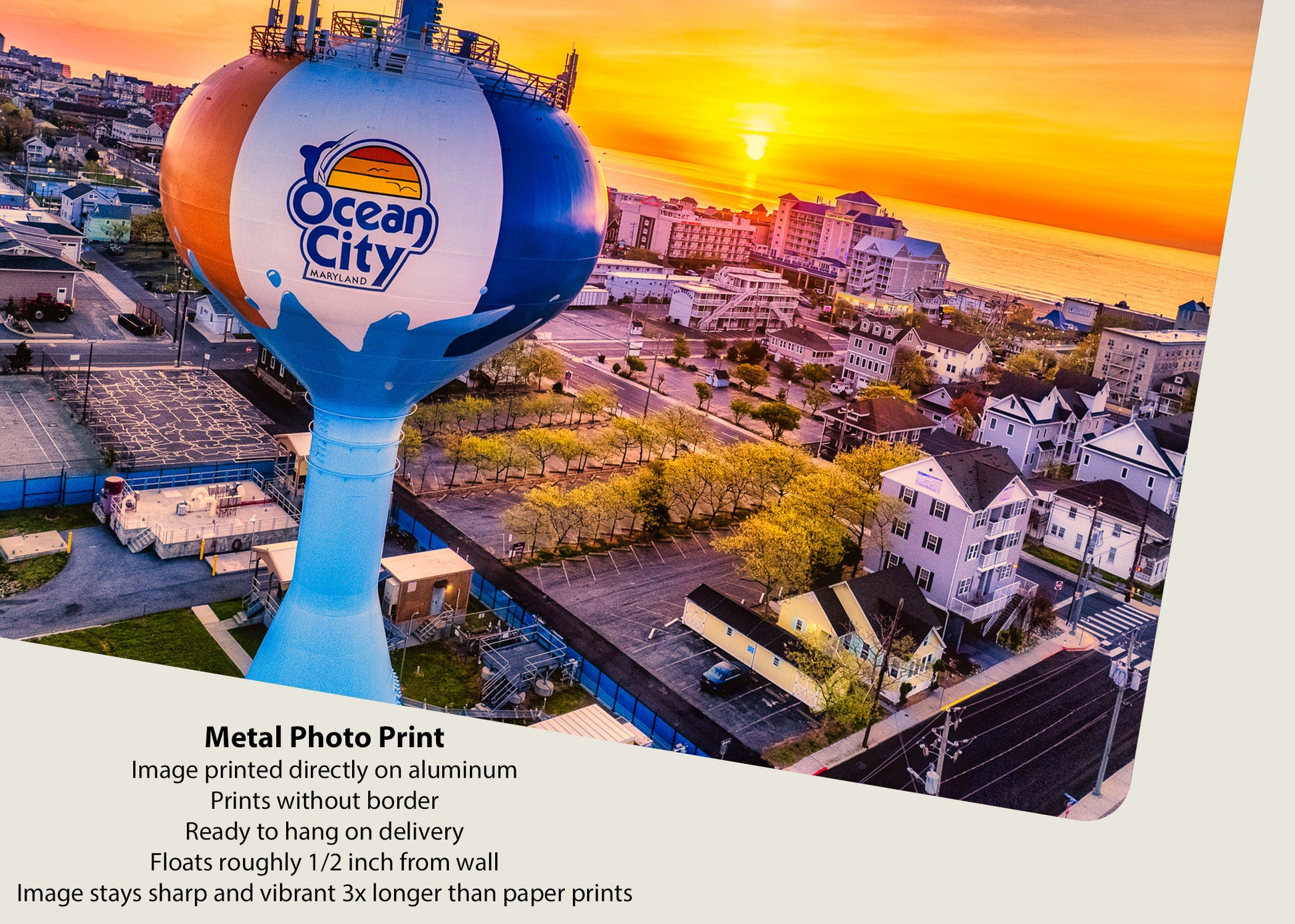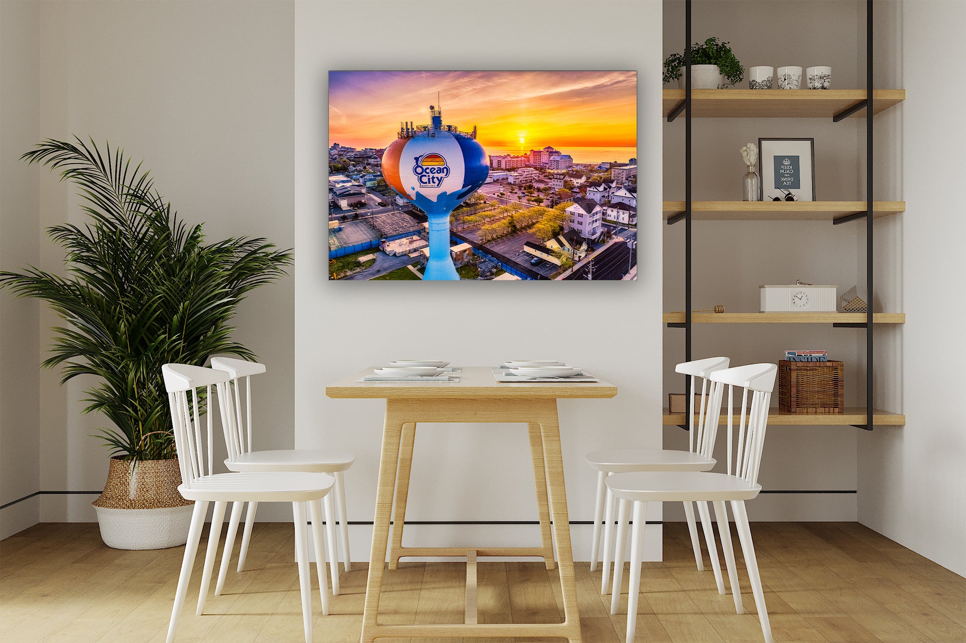 The Ocean City, Maryland water tower stands tall against a radiant sunrise, its iconic blue shape silhouetted by warm hues of orange and gold. The early morning light reflects softly off the structure, blending the colors of the sky with the familiar landmark that welcomes visitors to the shore.