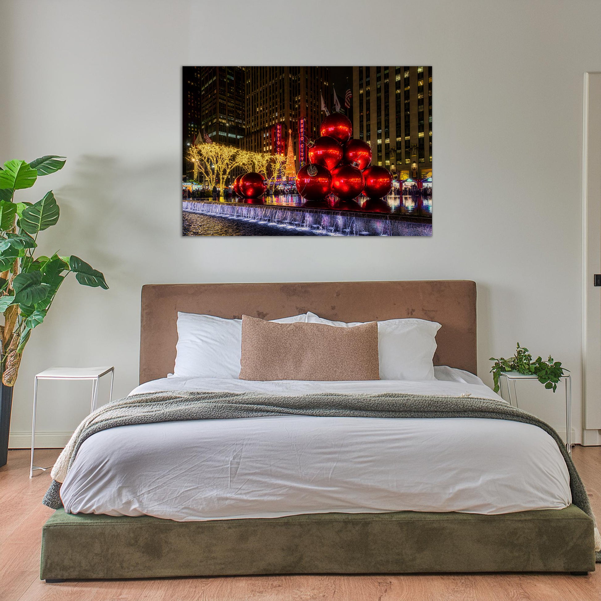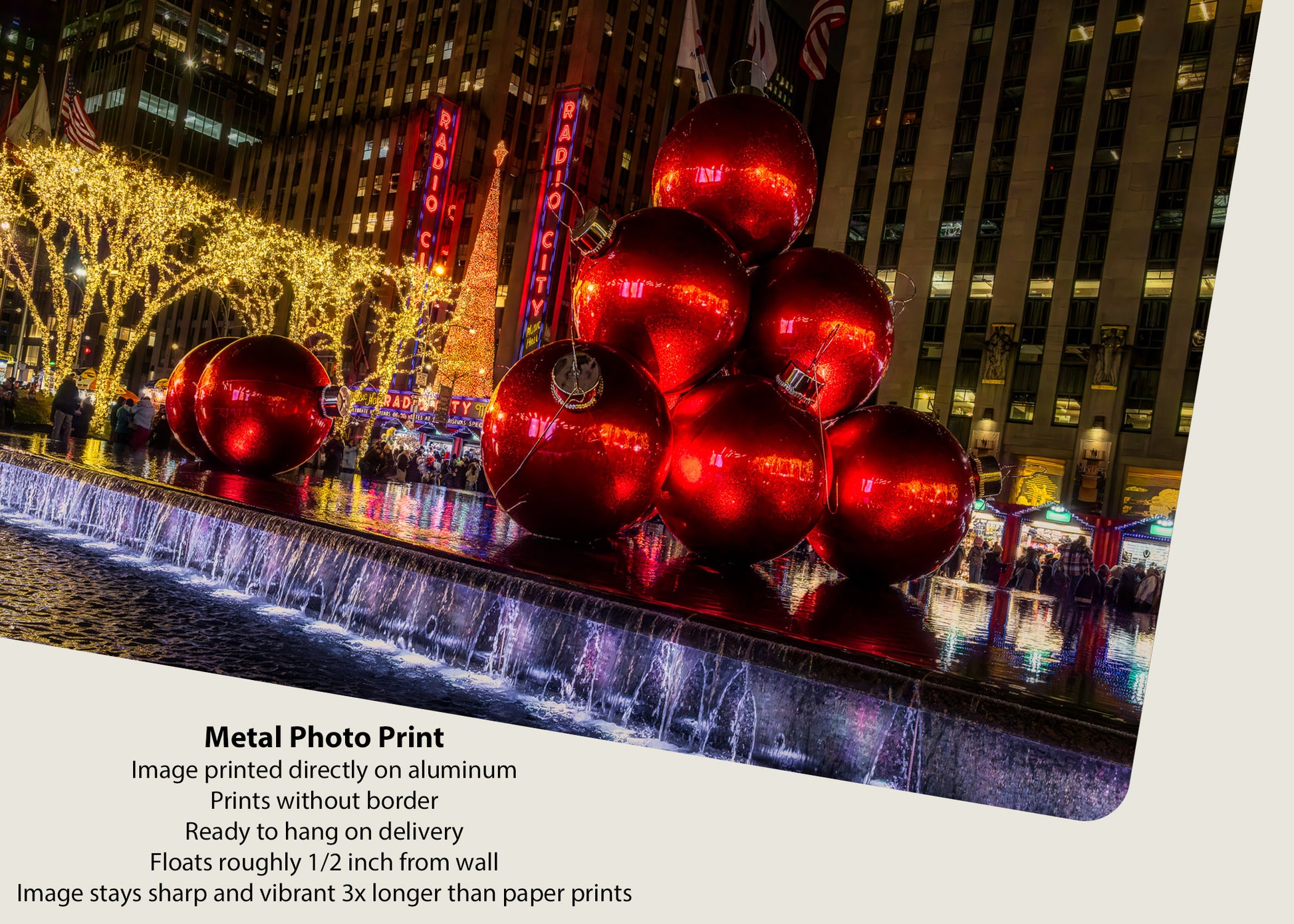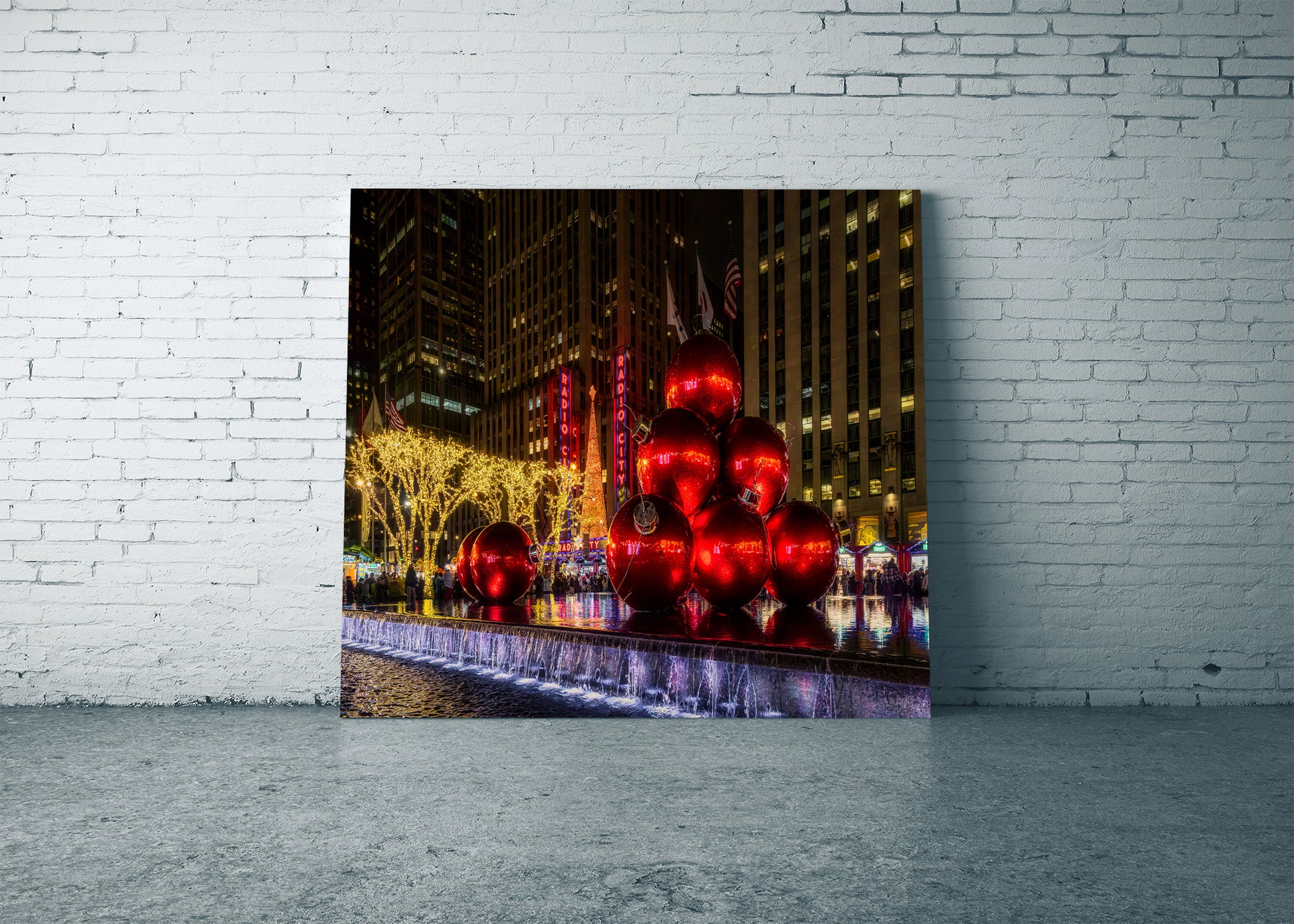 This festive nighttime photograph features the giant red ornaments floating in the Lilholts Pooley Pool, with Radio City Music Hall glowing in the background. The bright holiday decorations contrast beautifully with the surrounding city lights, creating a lively and unmistakably New York winter scene filled with color, reflections, and seasonal energy.