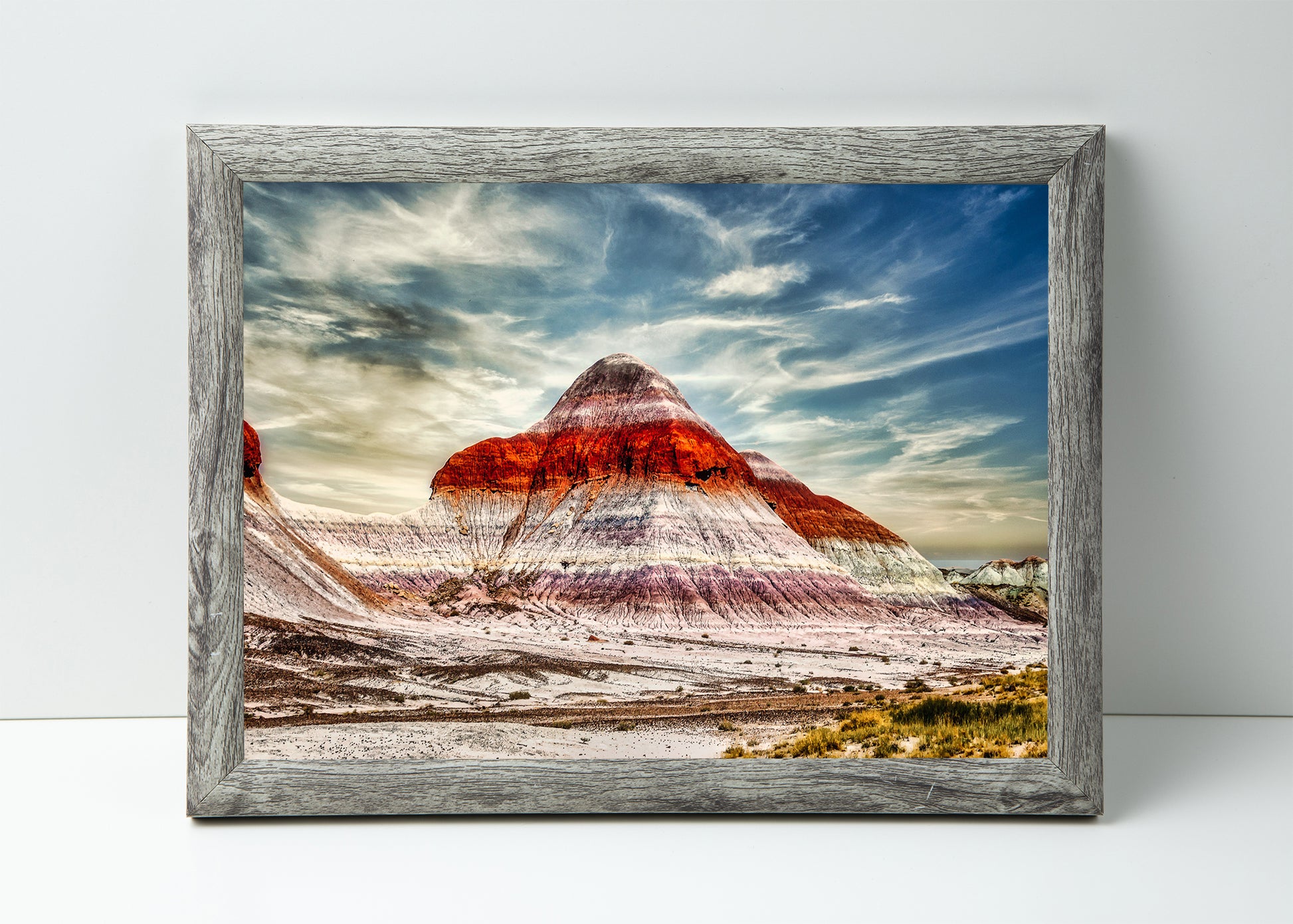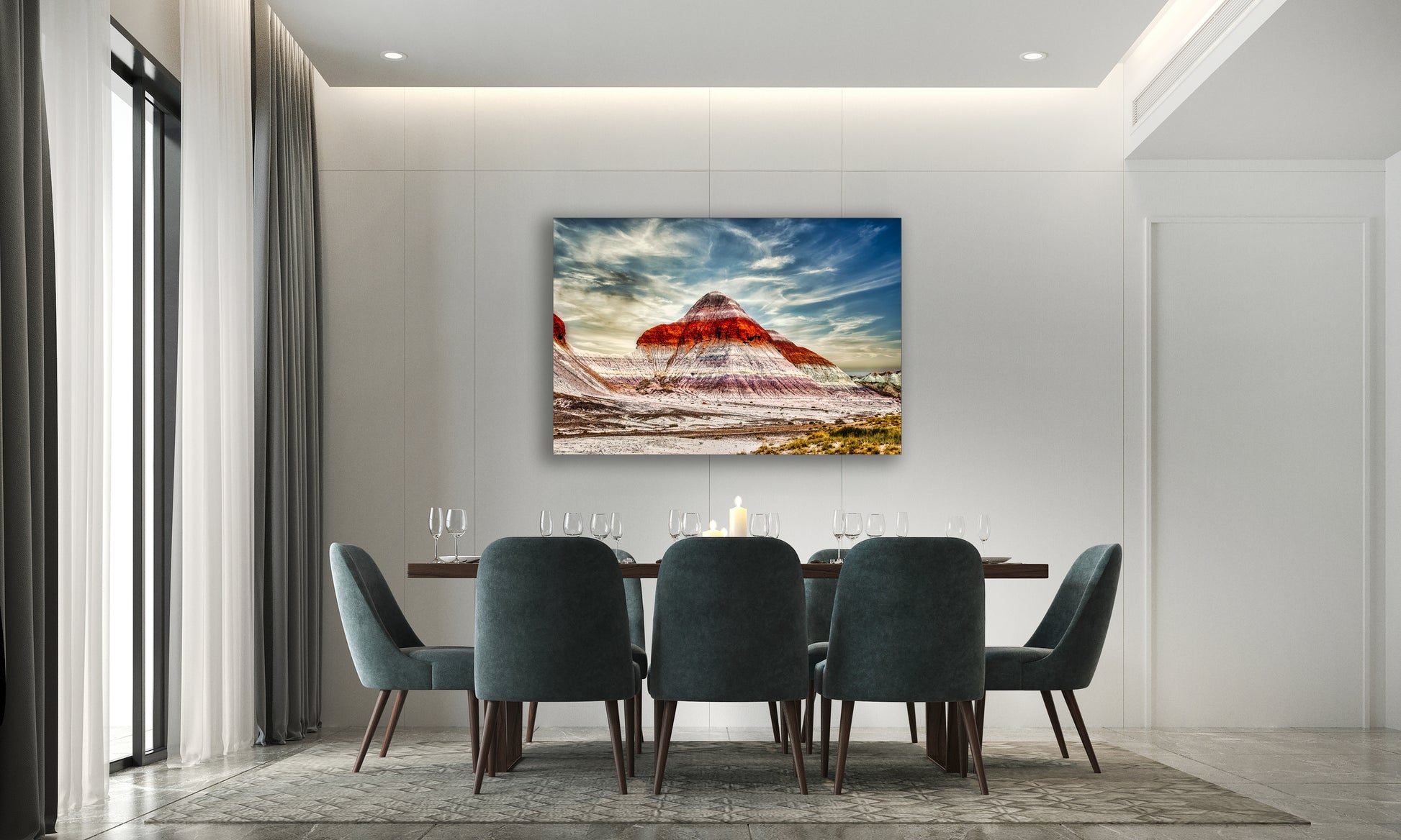 View of the mountain group know of the Tepees in Petrified Forest National Park. The layered sediments provides a colorful foreground against a dramatic blue sky.