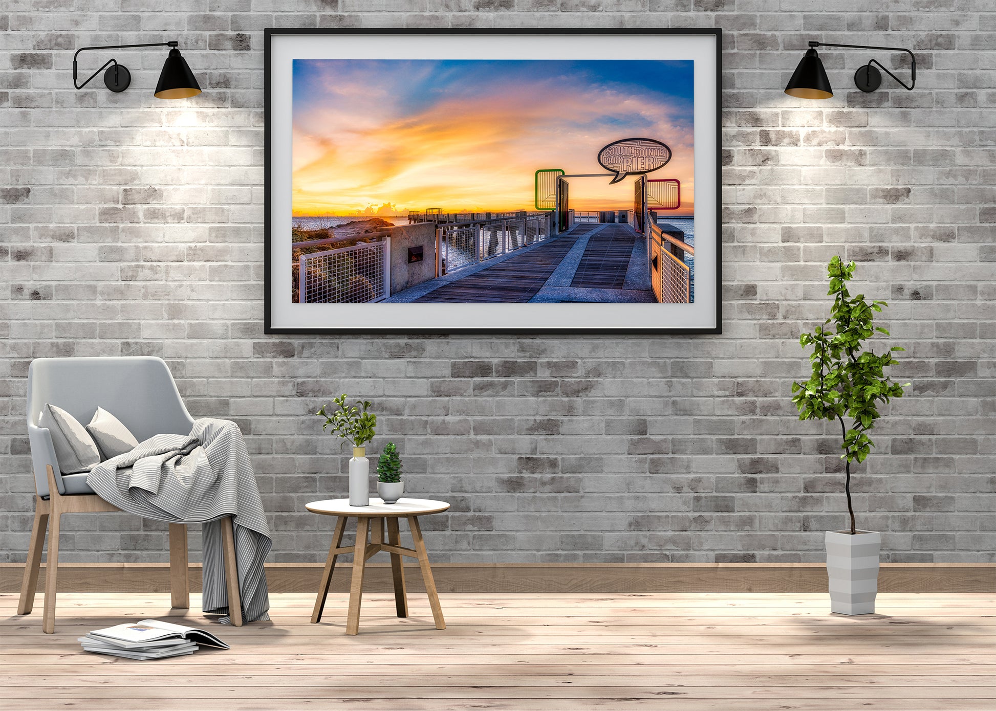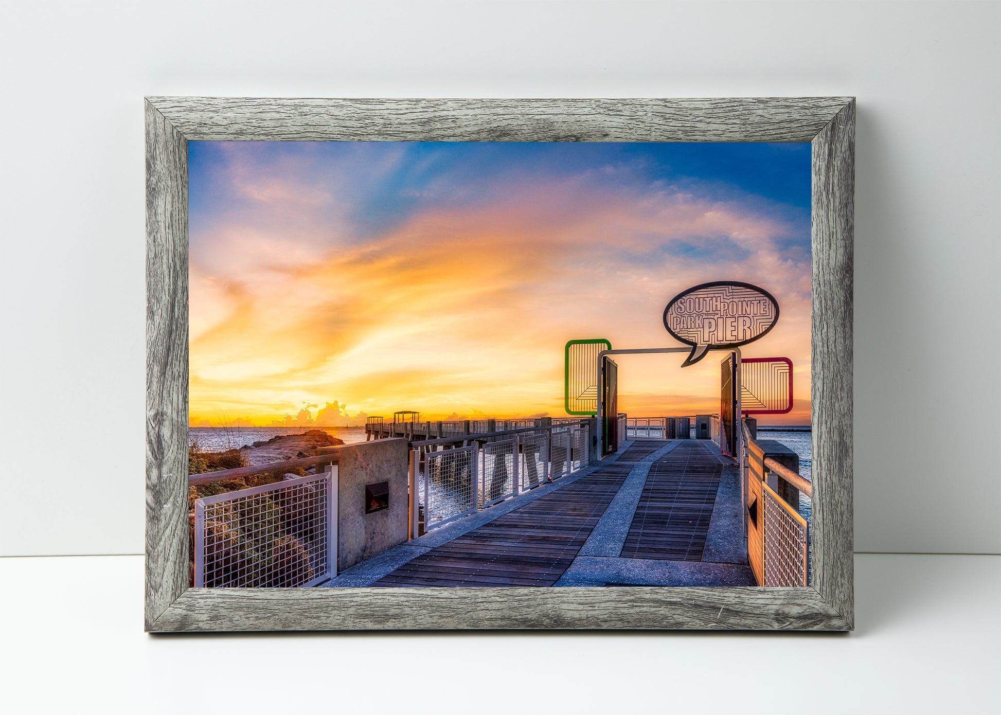 The sun rises over the horizon, casting a golden glow across the sky as South Pointe Park Pier stretches into the calm morning waters. Gentle waves lap against the structure, reflecting the warm hues of dawn. The pier’s modern design contrasts beautifully with the natural serenity of the ocean, creating a peaceful yet striking composition.
