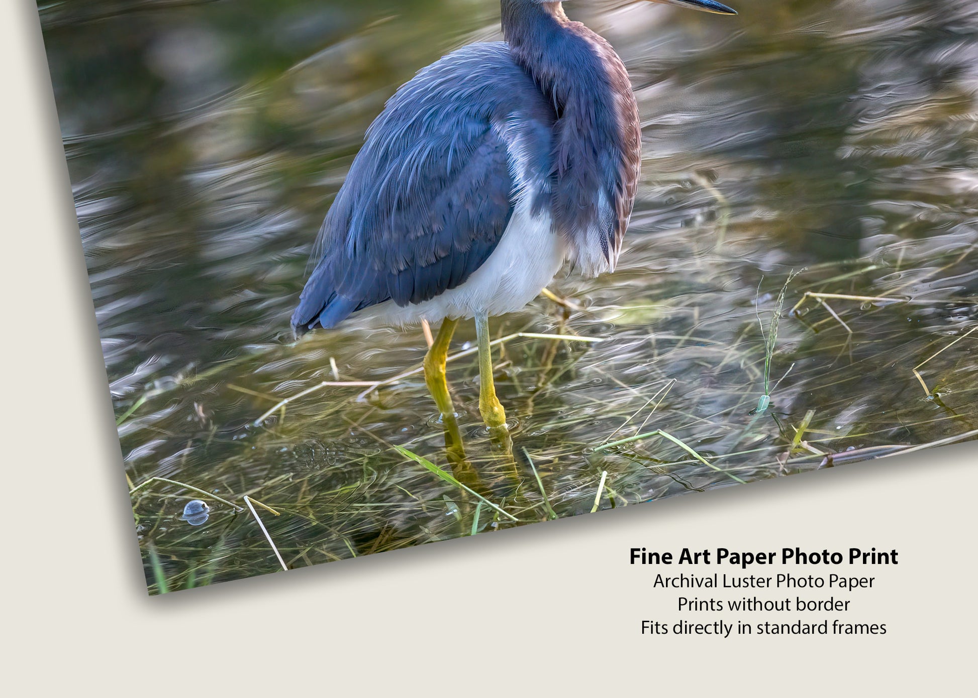 A Tricolored Heron wades gracefully through the shallow waters of Everglades National Park, its slender frame reflected in the still surface. Subtle shades of blue, gray, and white blend seamlessly with the natural surroundings as the bird patiently hunts for its next meal. The golden light of the wetlands enhances the serene beauty of this delicate moment in nature.
