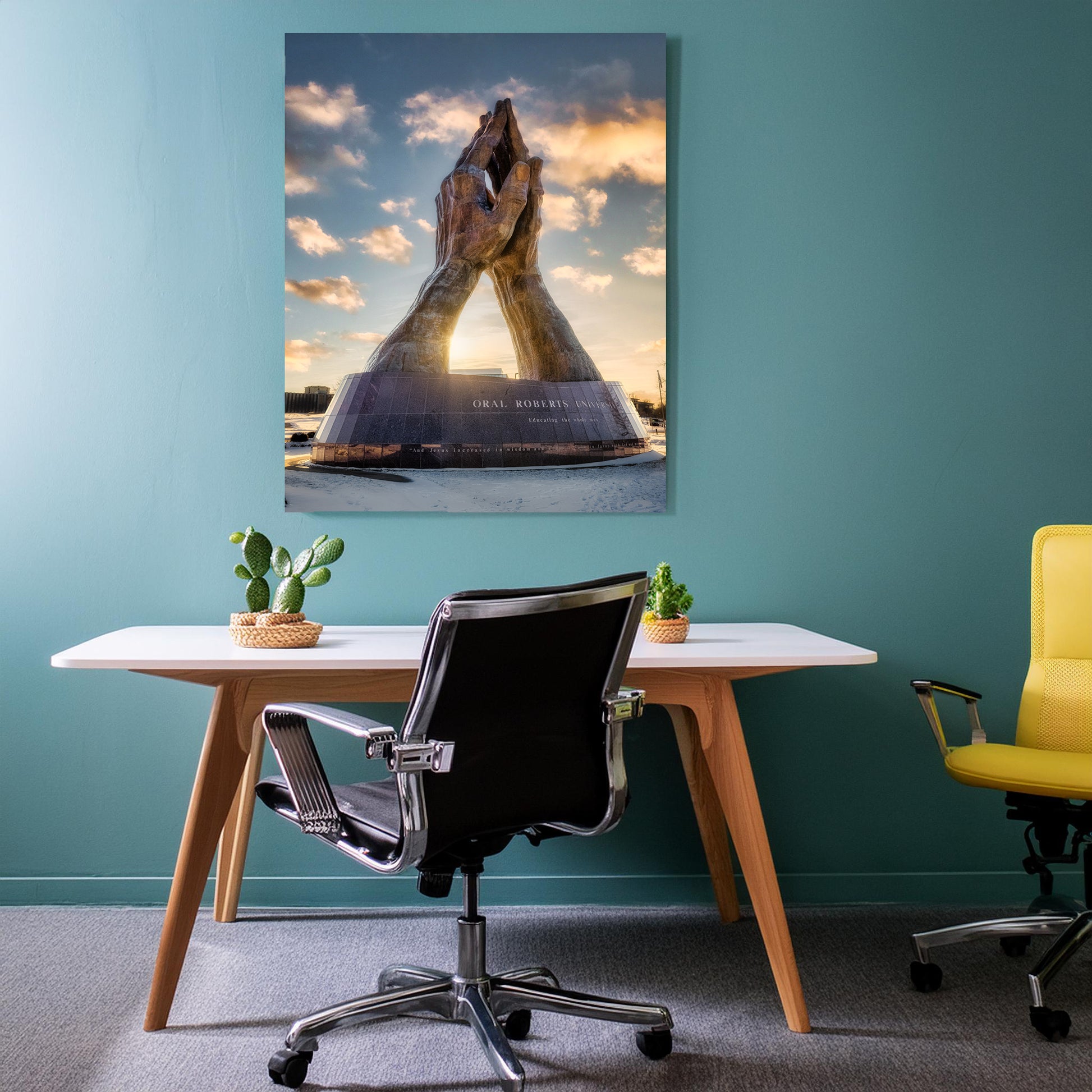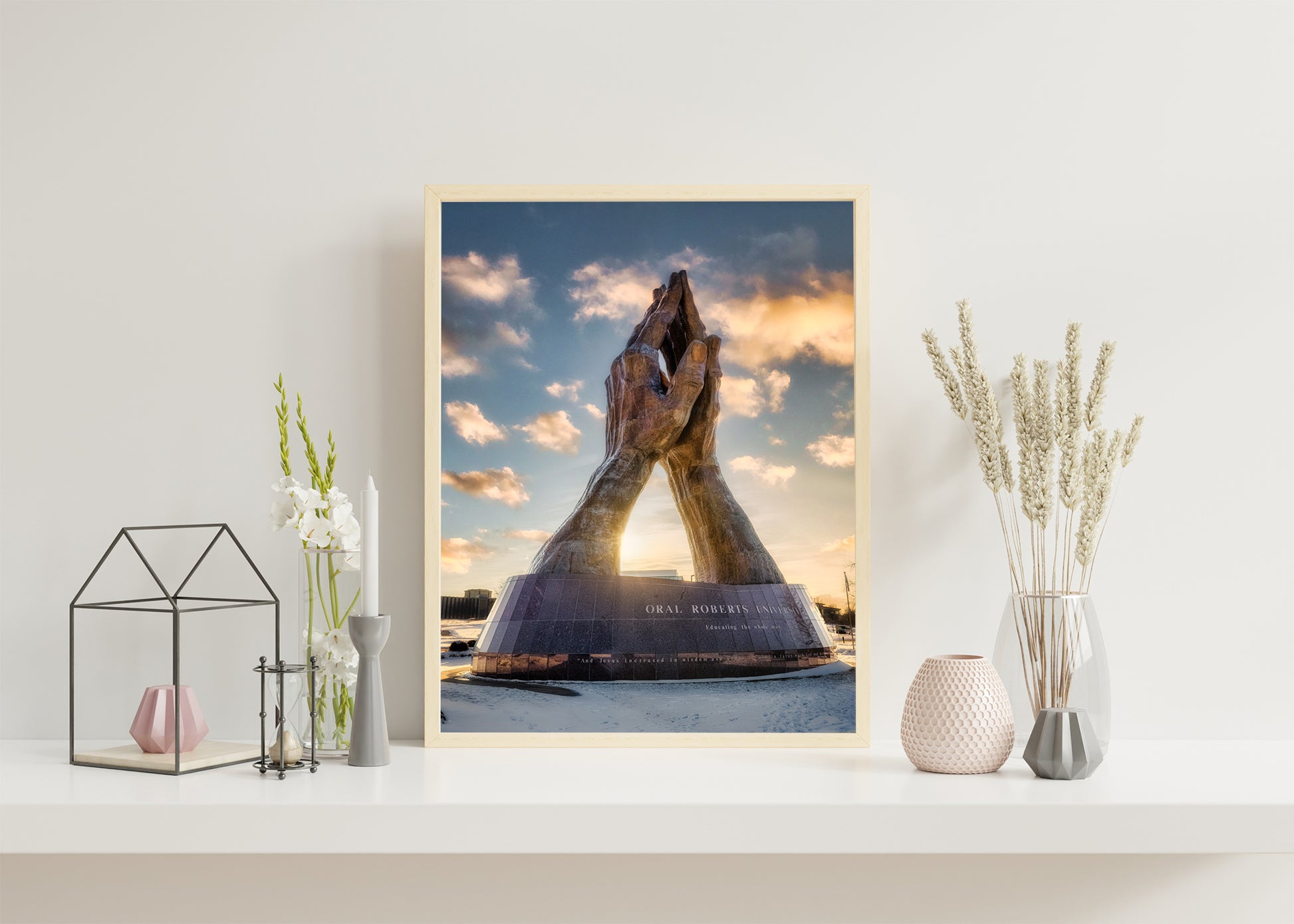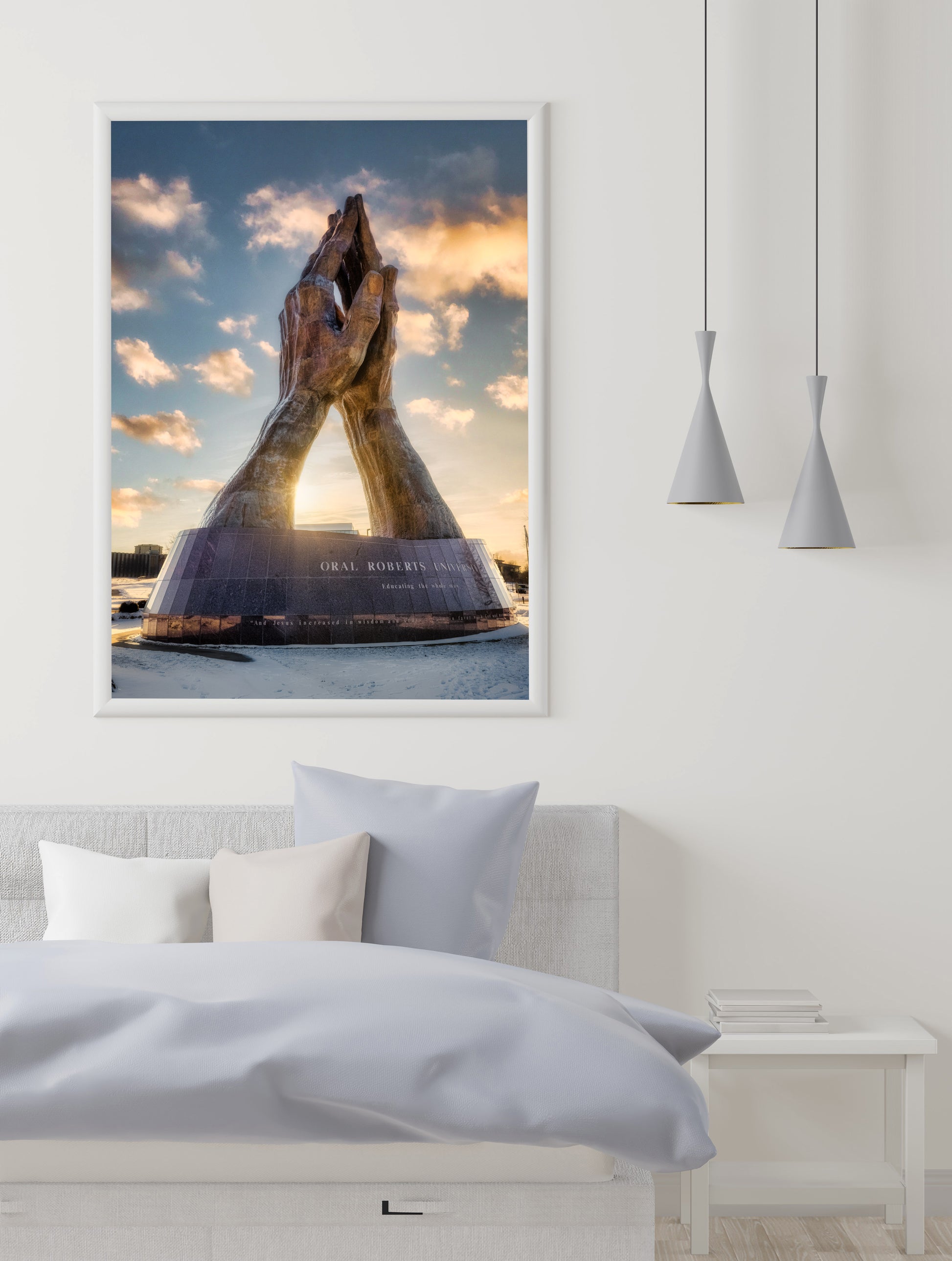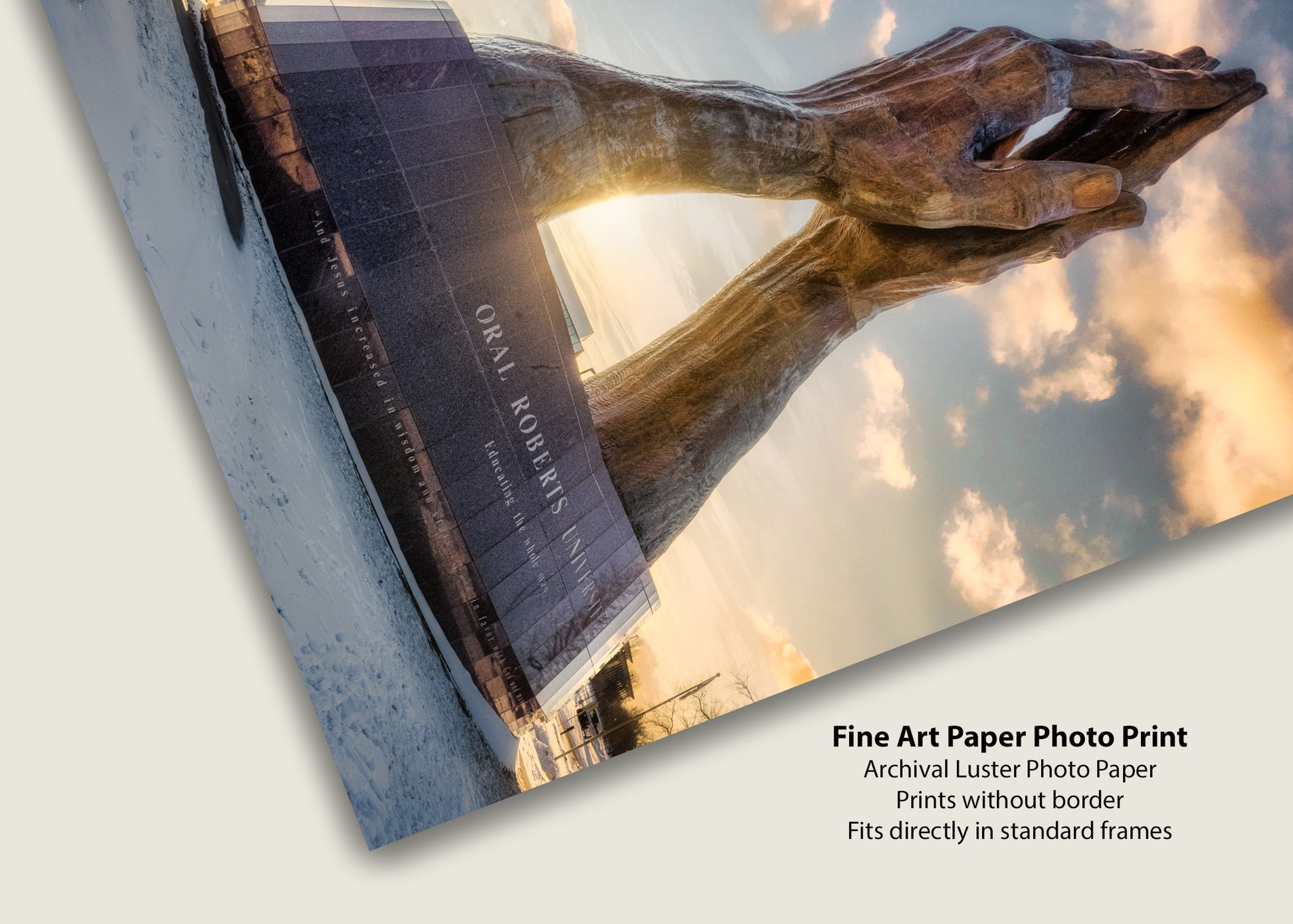 As the sun rises over Oral Roberts University, its rays peek through the iconic Praying Hands statue, casting a warm glow against the frosted landscape. The snow-covered ground sparkles in the soft morning light, creating a serene and reverent scene. The towering bronze hands, a symbol of faith and unity, stand strong against the vibrant sky, blending natural beauty with spiritual symbolism.