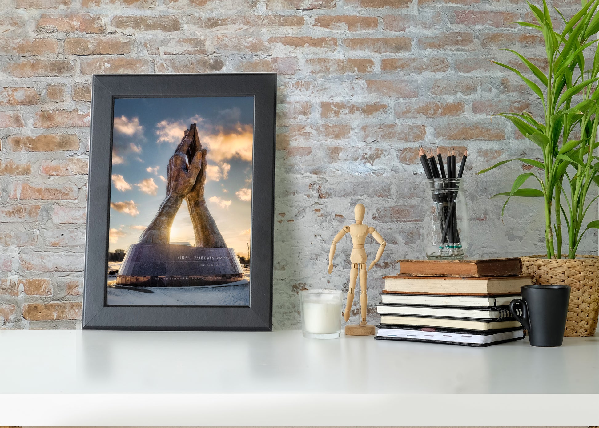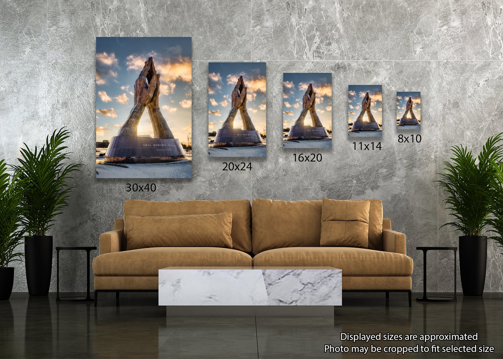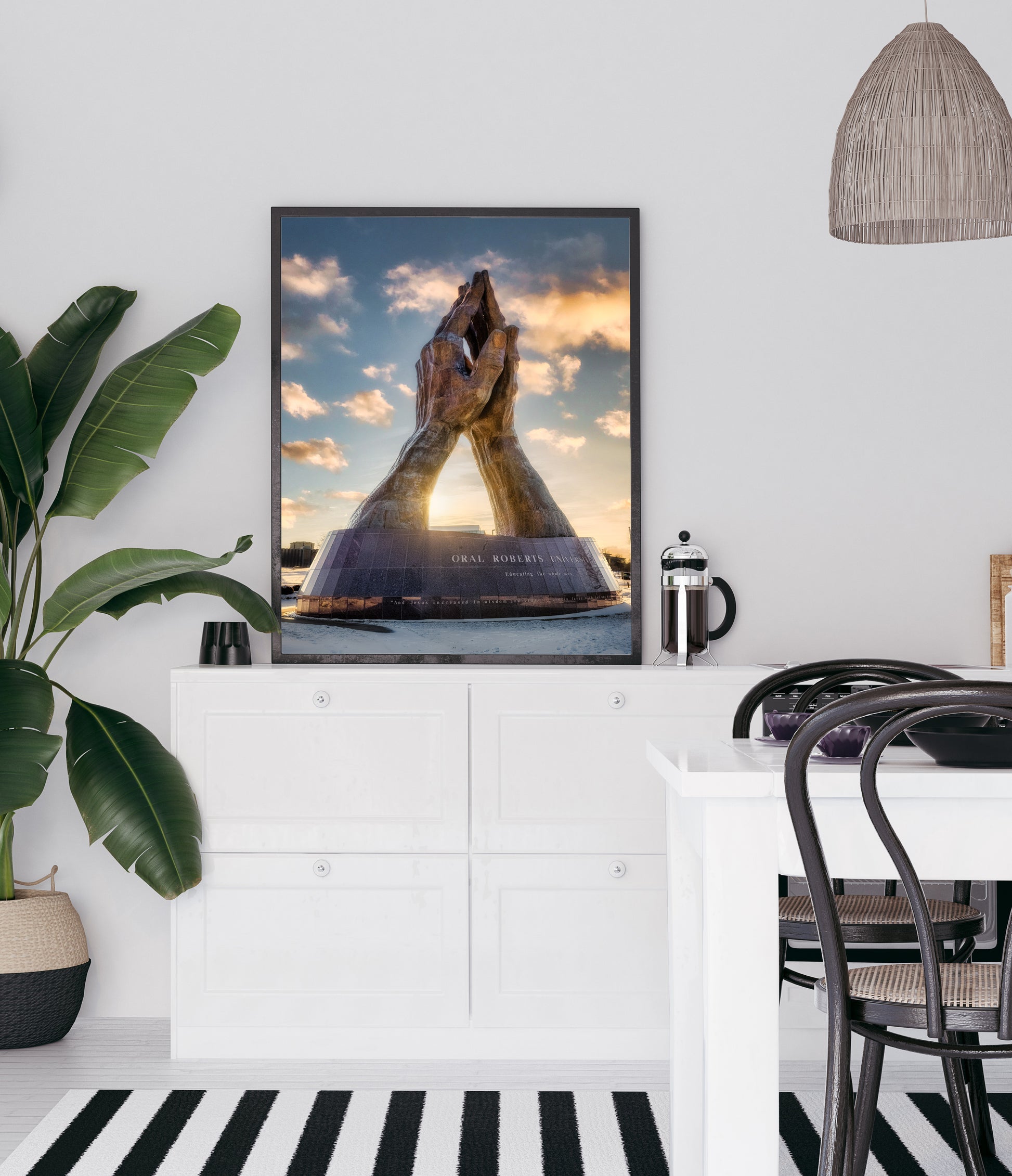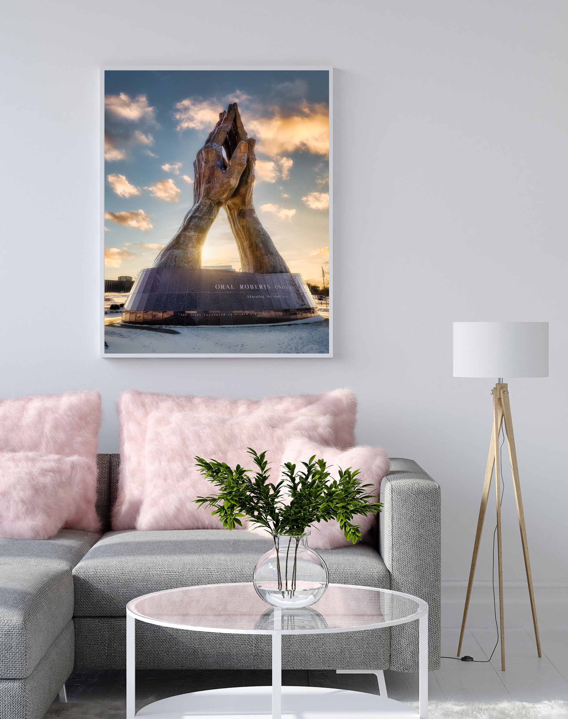 As the sun rises over Oral Roberts University, its rays peek through the iconic Praying Hands statue, casting a warm glow against the frosted landscape. The snow-covered ground sparkles in the soft morning light, creating a serene and reverent scene. The towering bronze hands, a symbol of faith and unity, stand strong against the vibrant sky, blending natural beauty with spiritual symbolism.