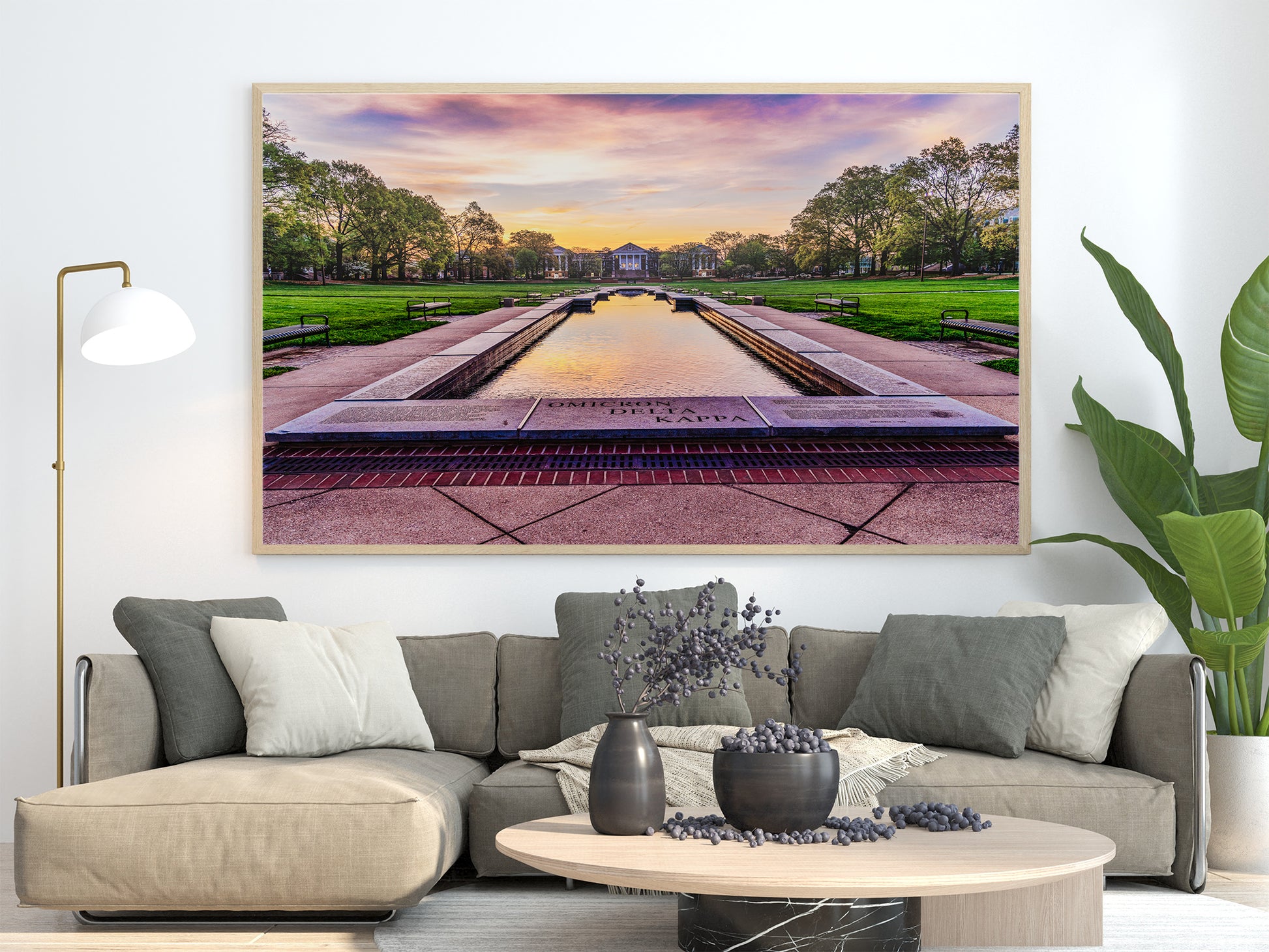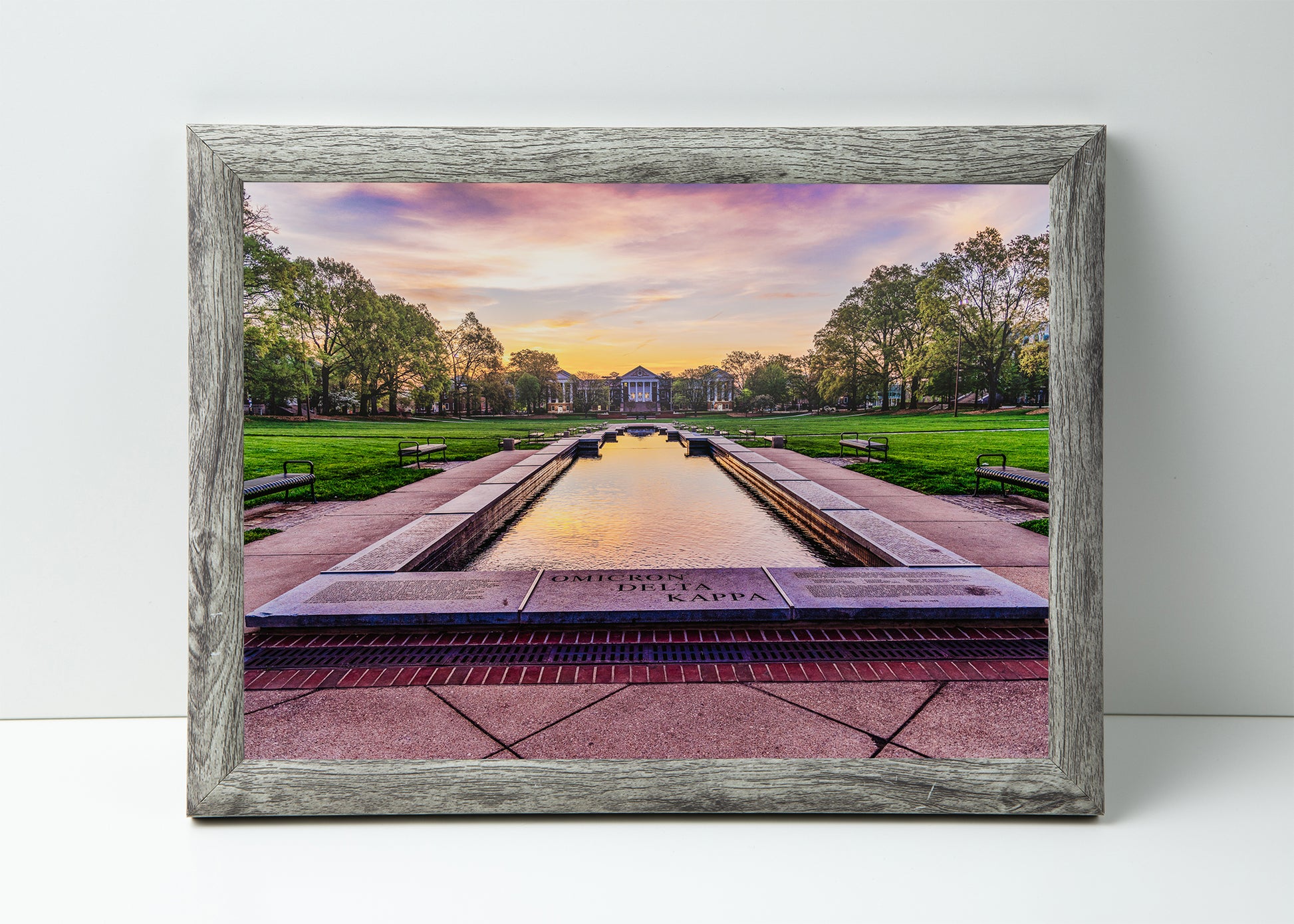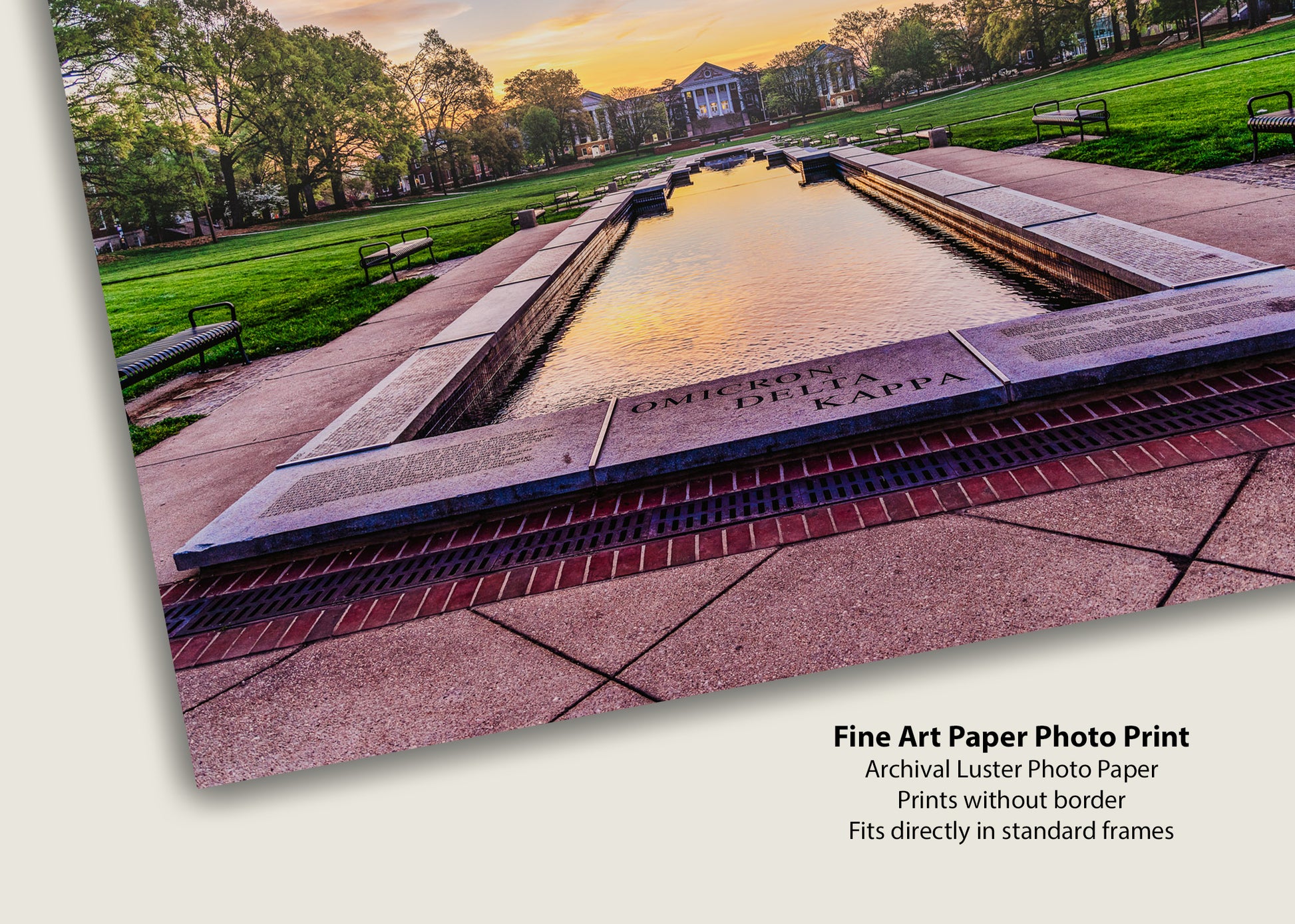 View of the ODK Fountain at the University of Maryland facing the sunrise on a warm spring morning.