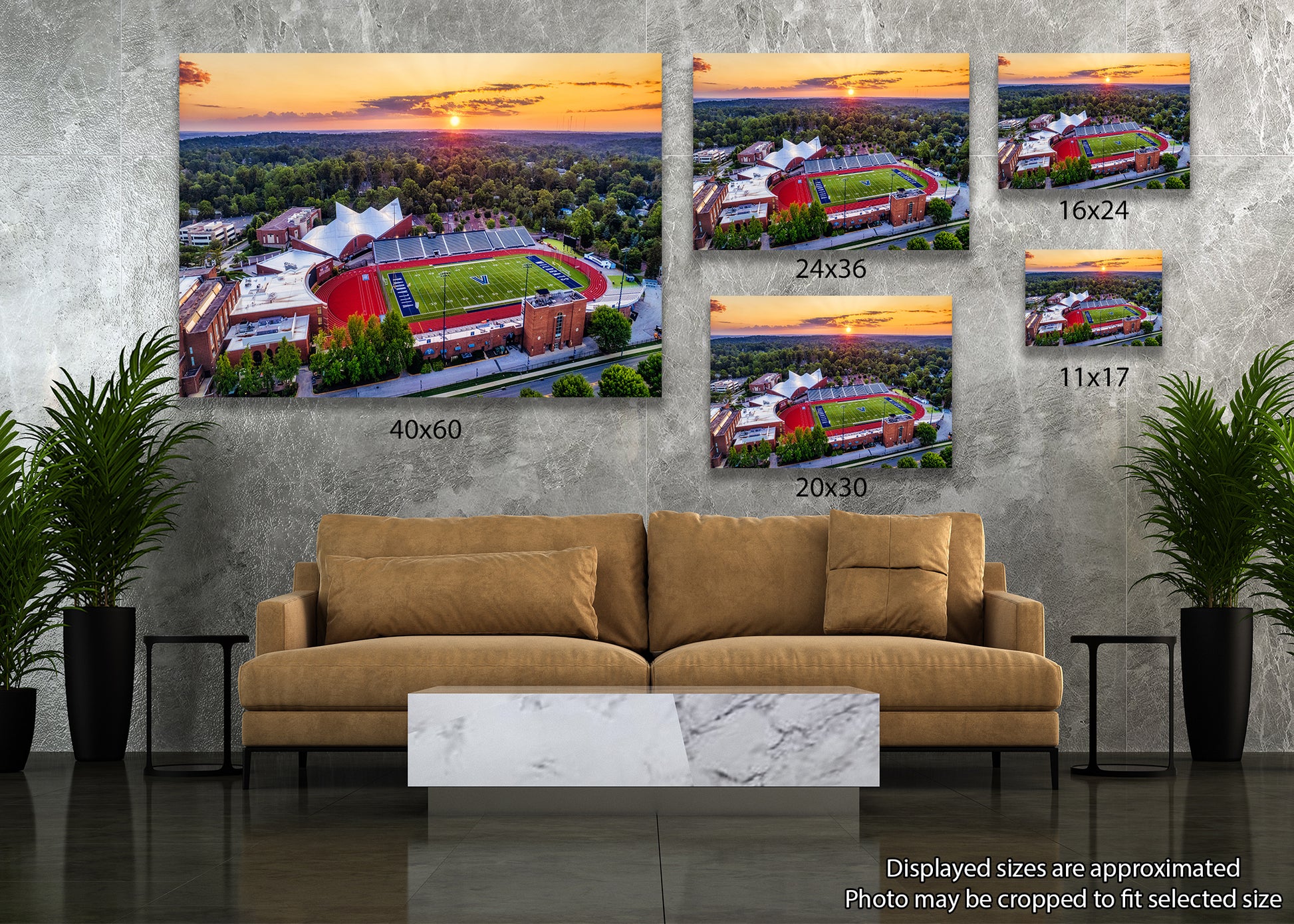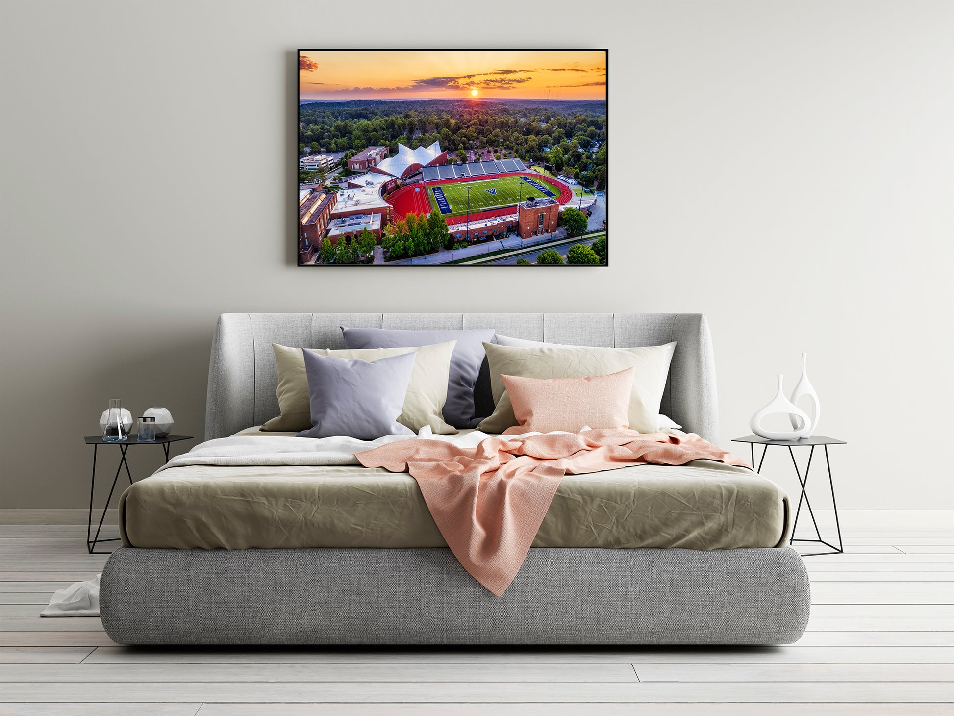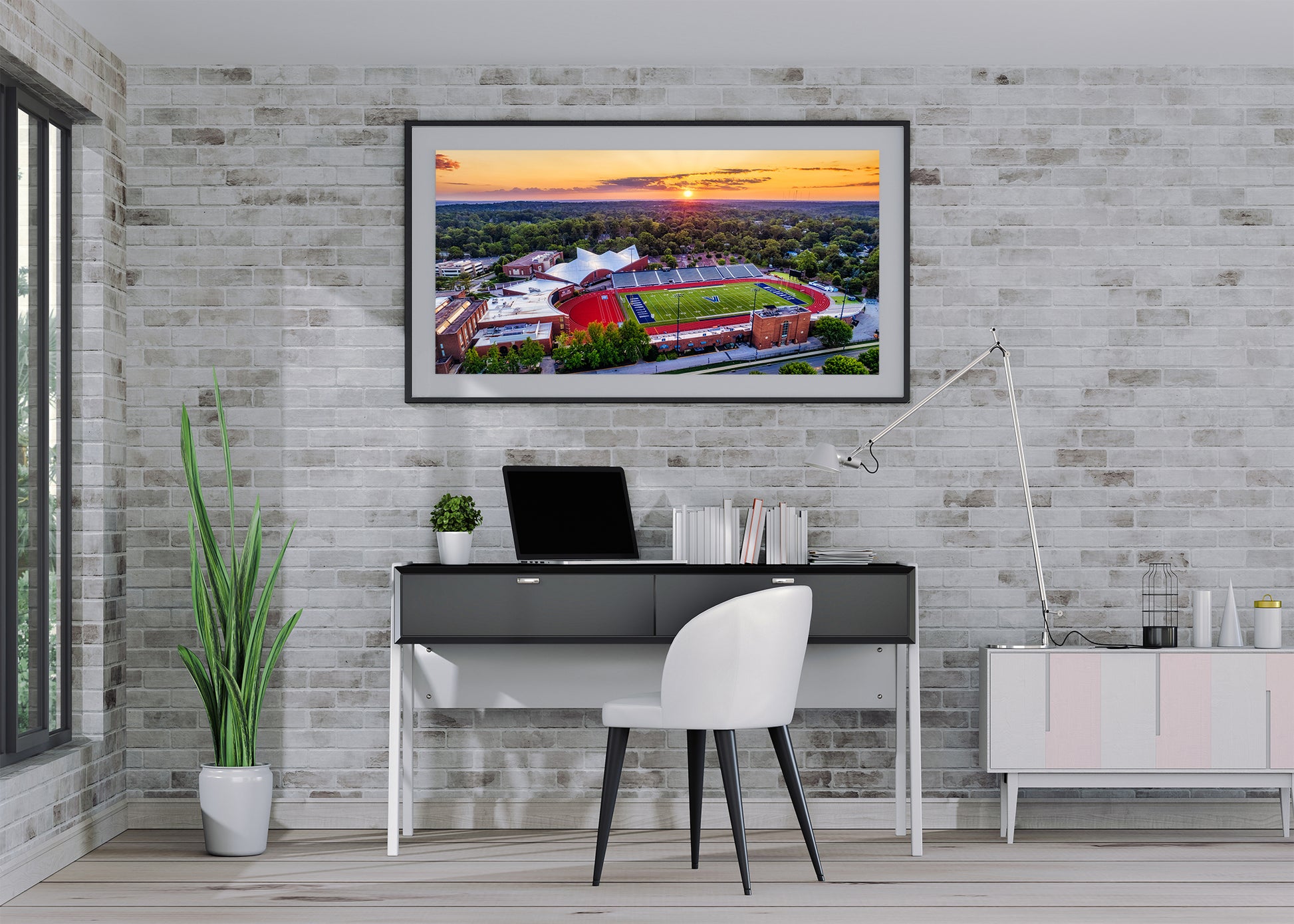 Image of the sky rising over the mountains at Villanova Stadium. The Pavilion stands nearby.