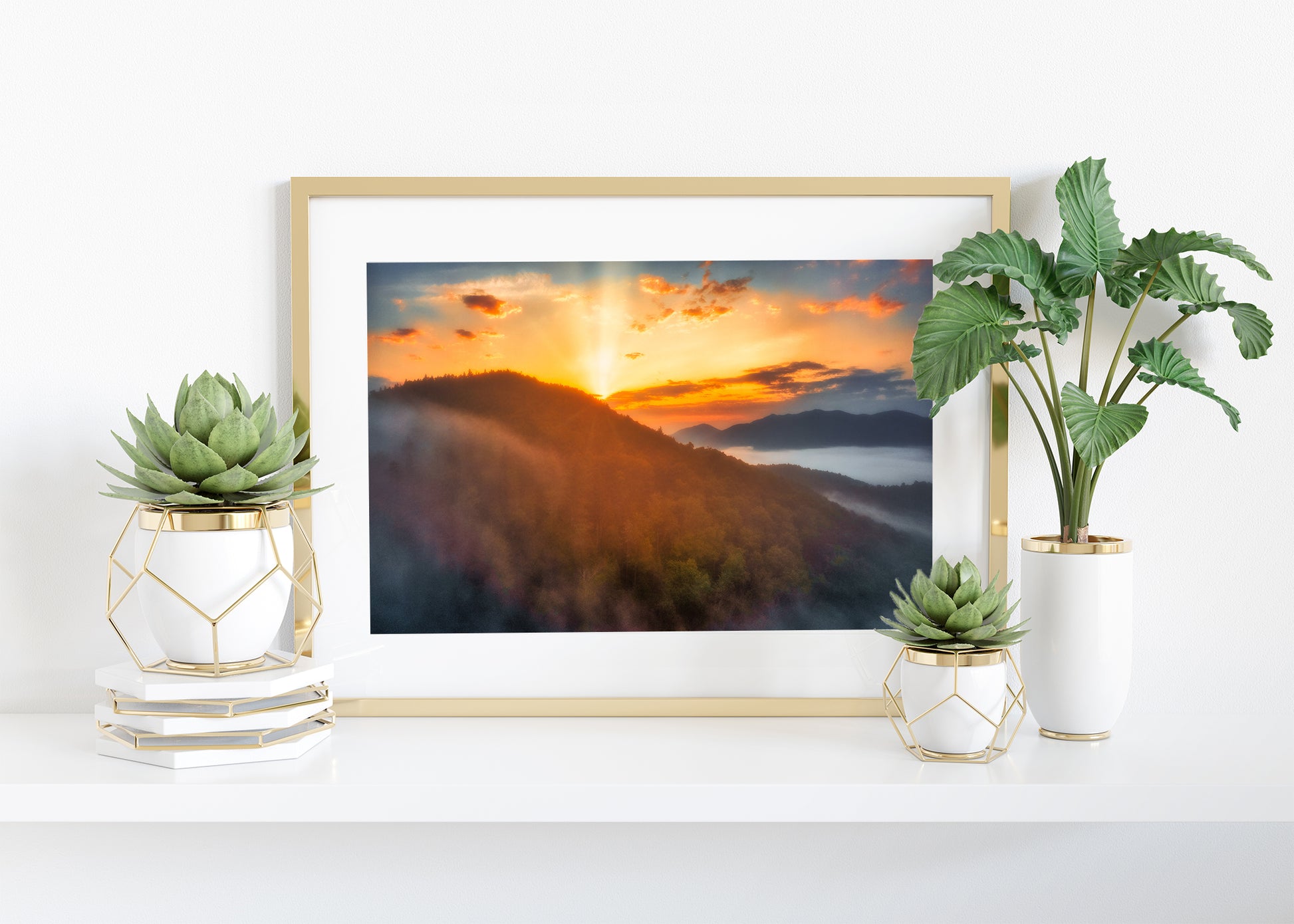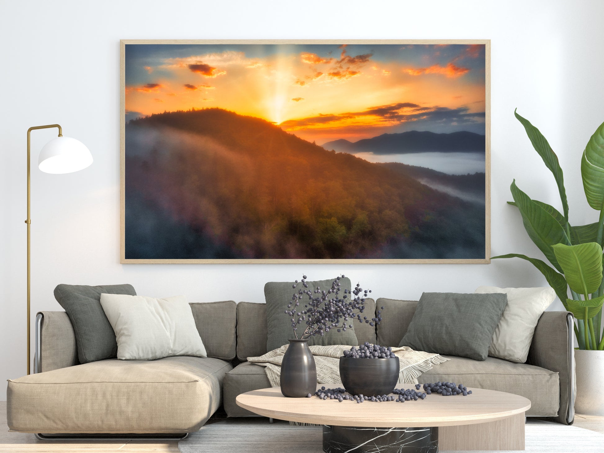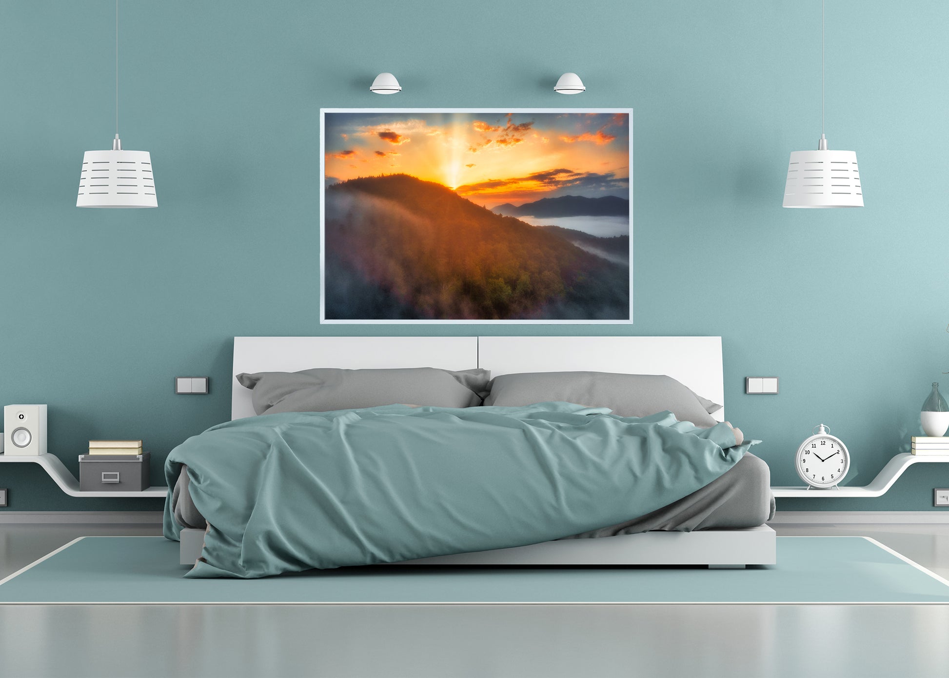 View of the sunrise bursting through the thick morning clouds over Lake Placid.