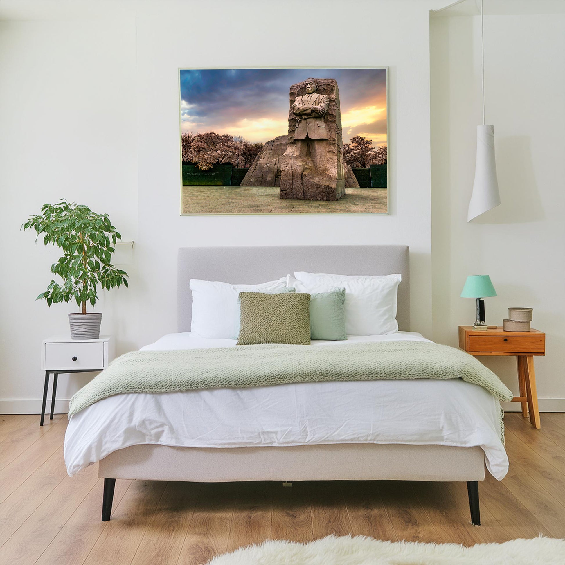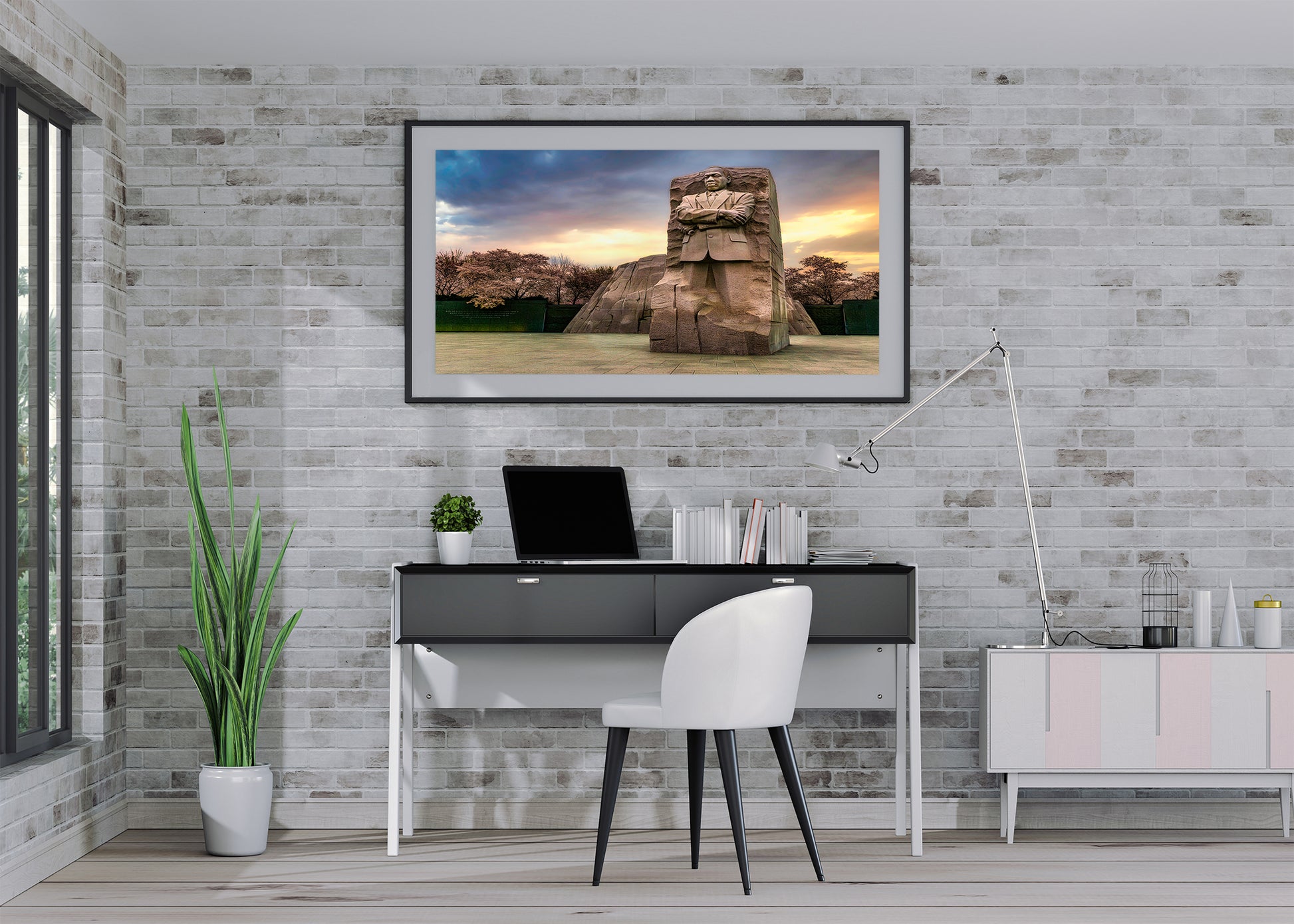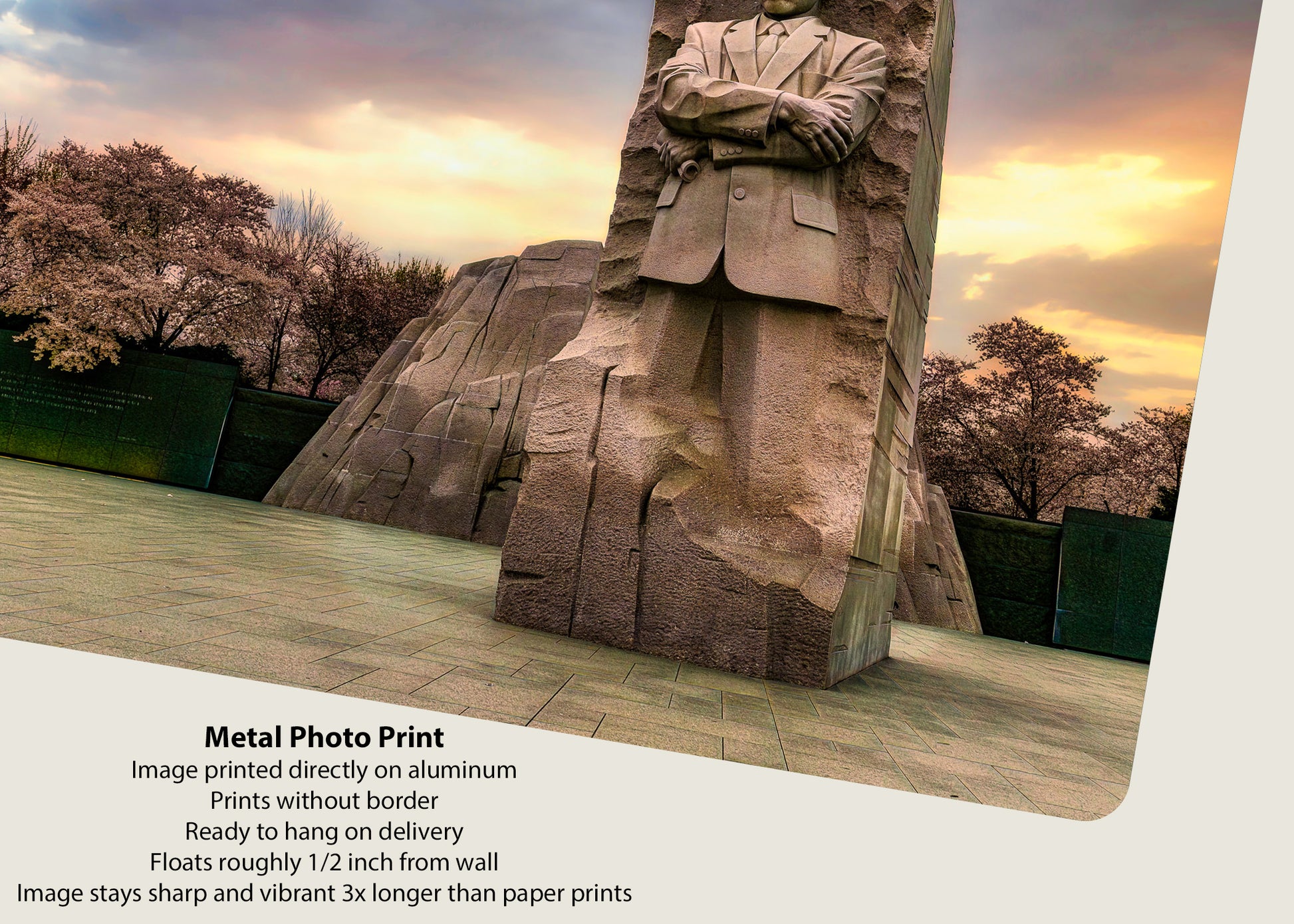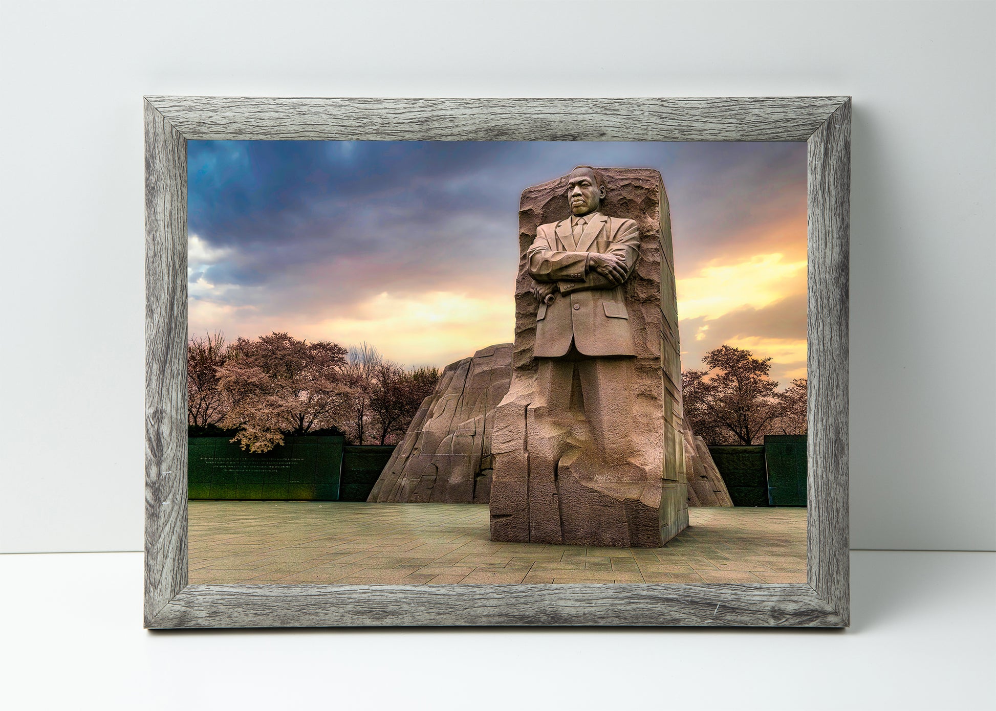 Portrait of the sun setting behind the Martin Luther King Jr Monument during the 2023 National Cherry Blossom Festival. It’s hard to drown out the brilliant color of the flowing trees, but this sunset succeeded.