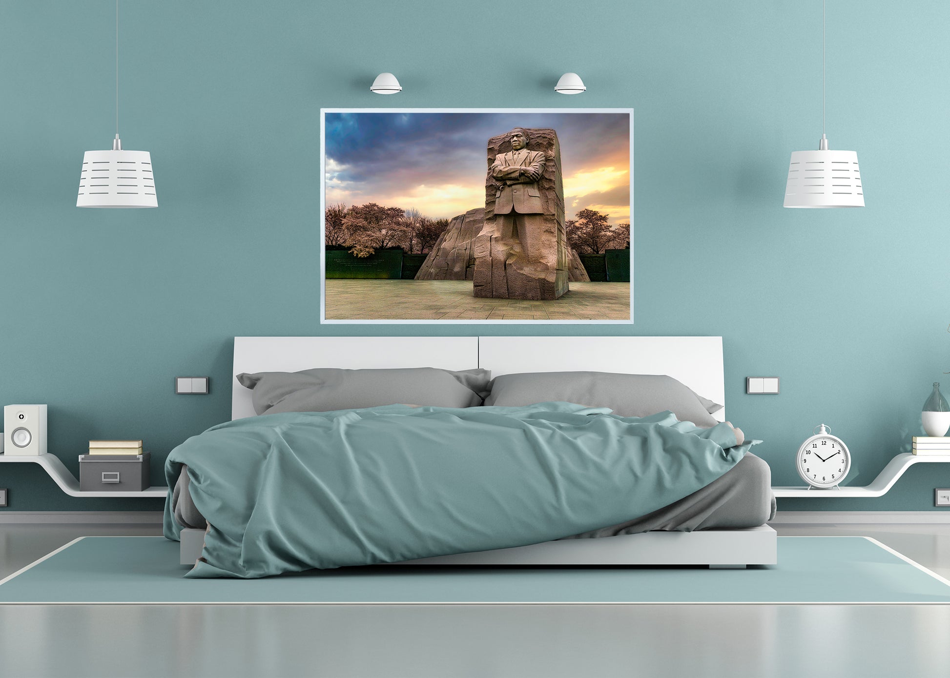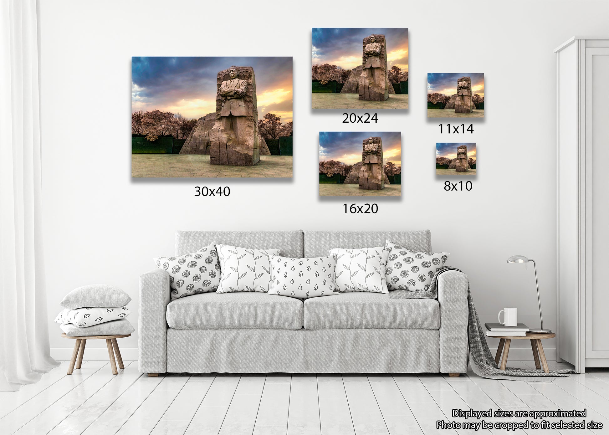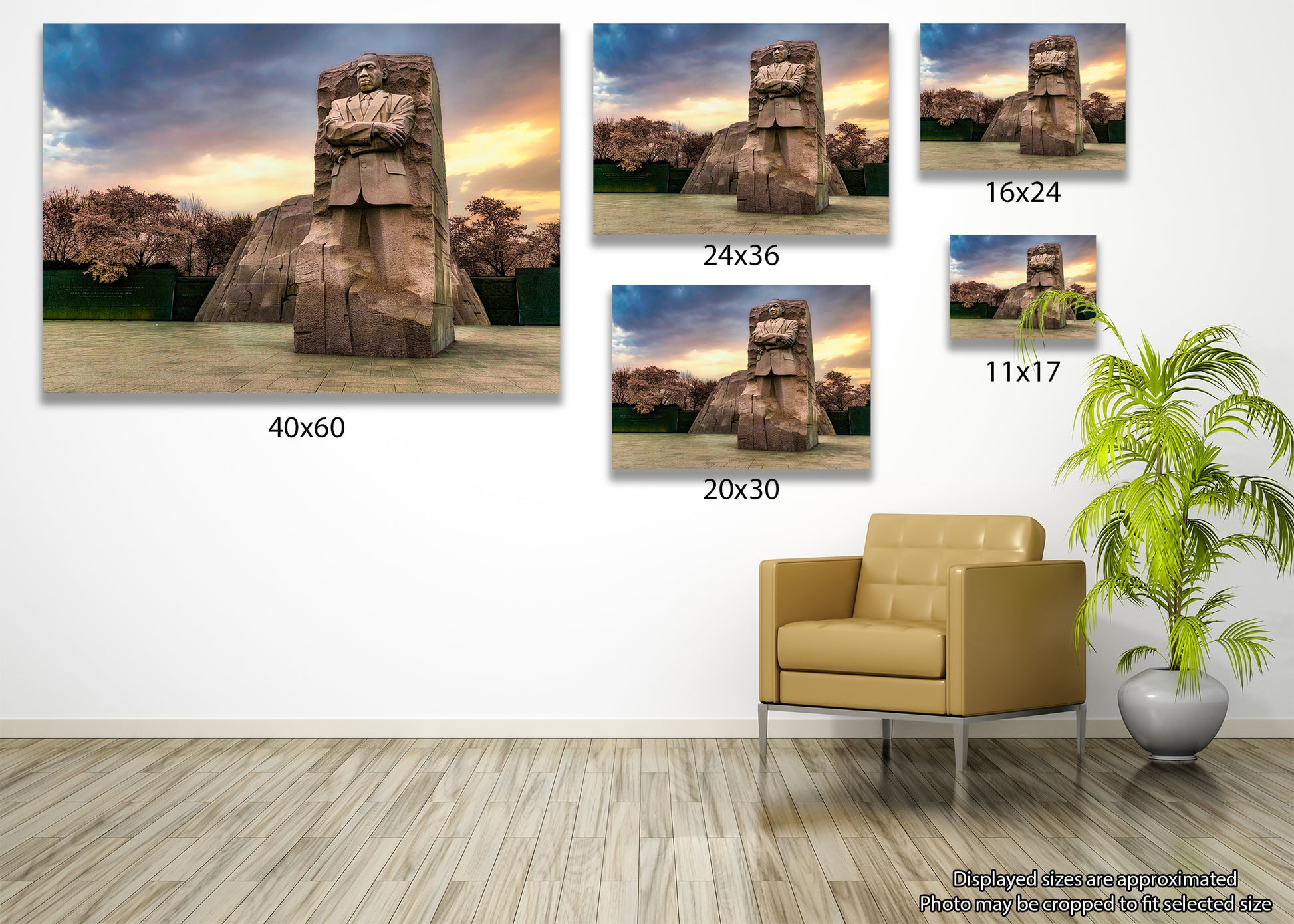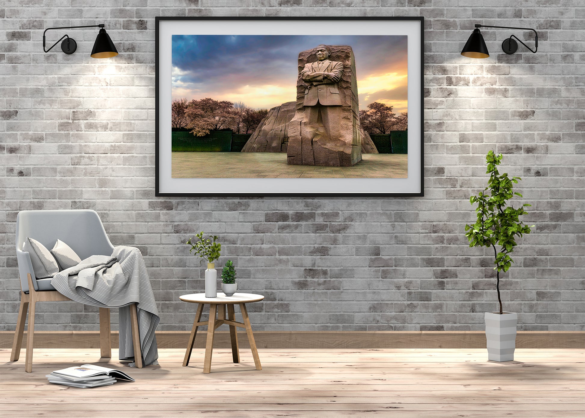 Portrait of the sun setting behind the Martin Luther King Jr Monument during the 2023 National Cherry Blossom Festival. It’s hard to drown out the brilliant color of the flowing trees, but this sunset succeeded.